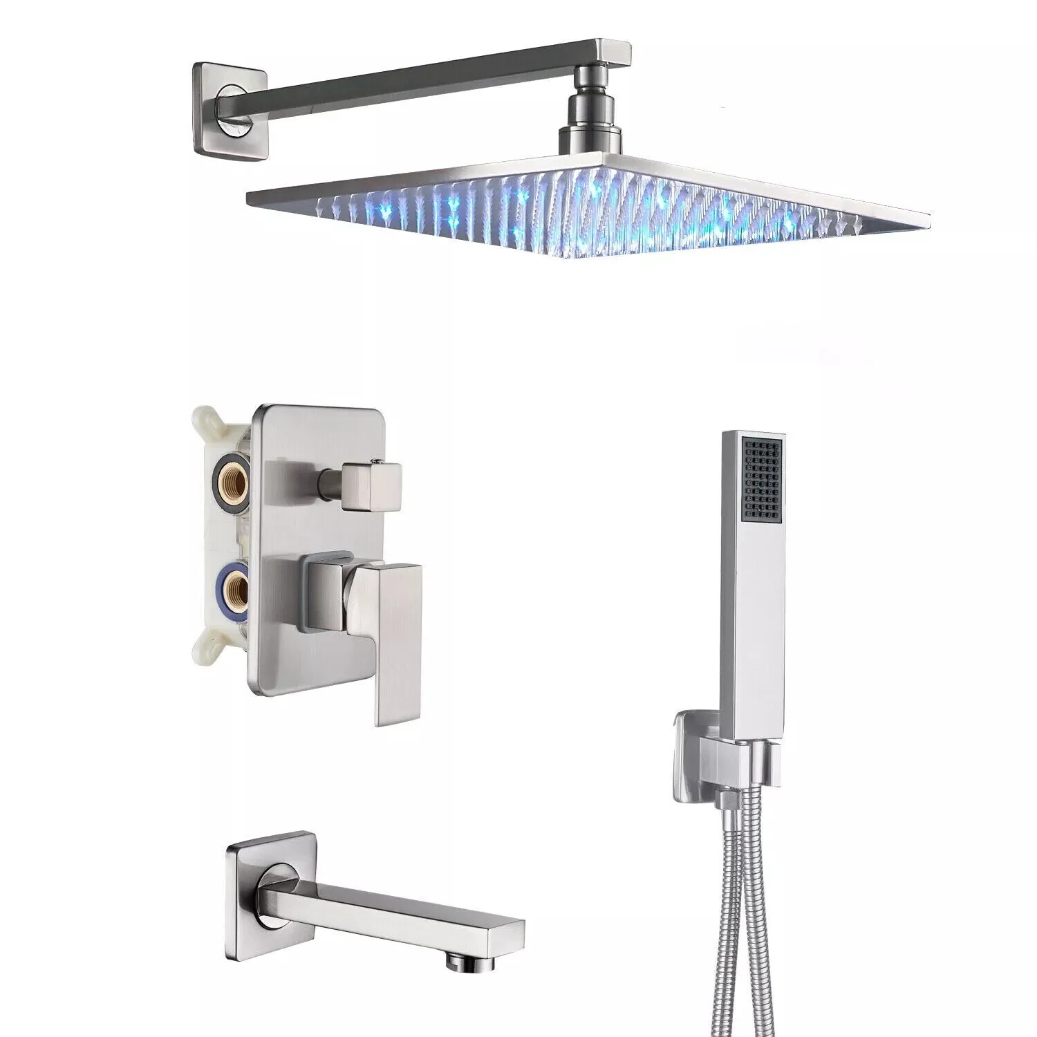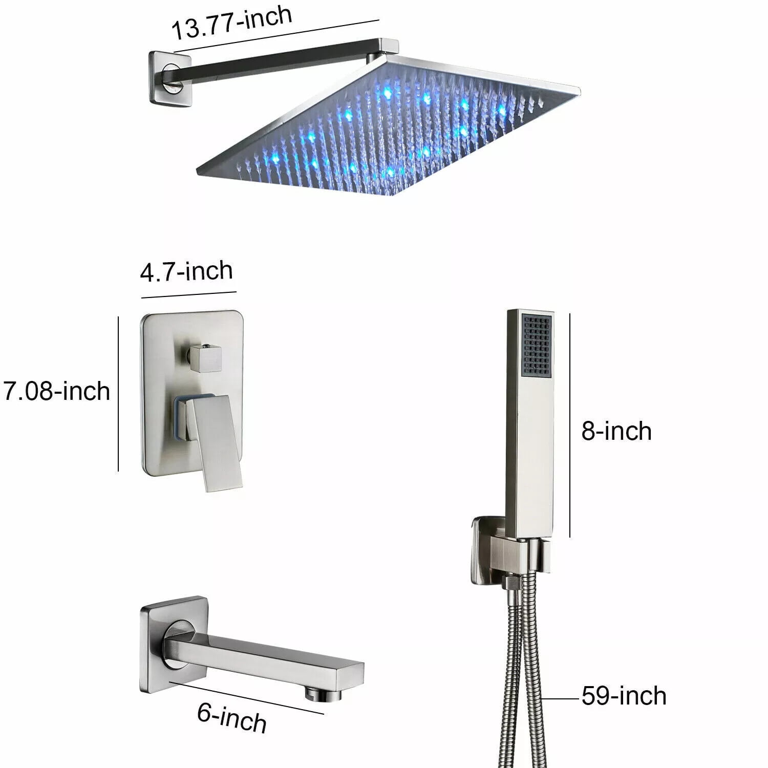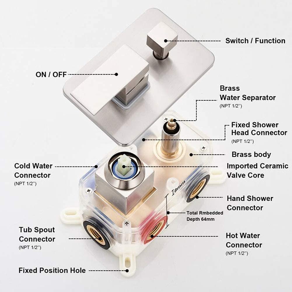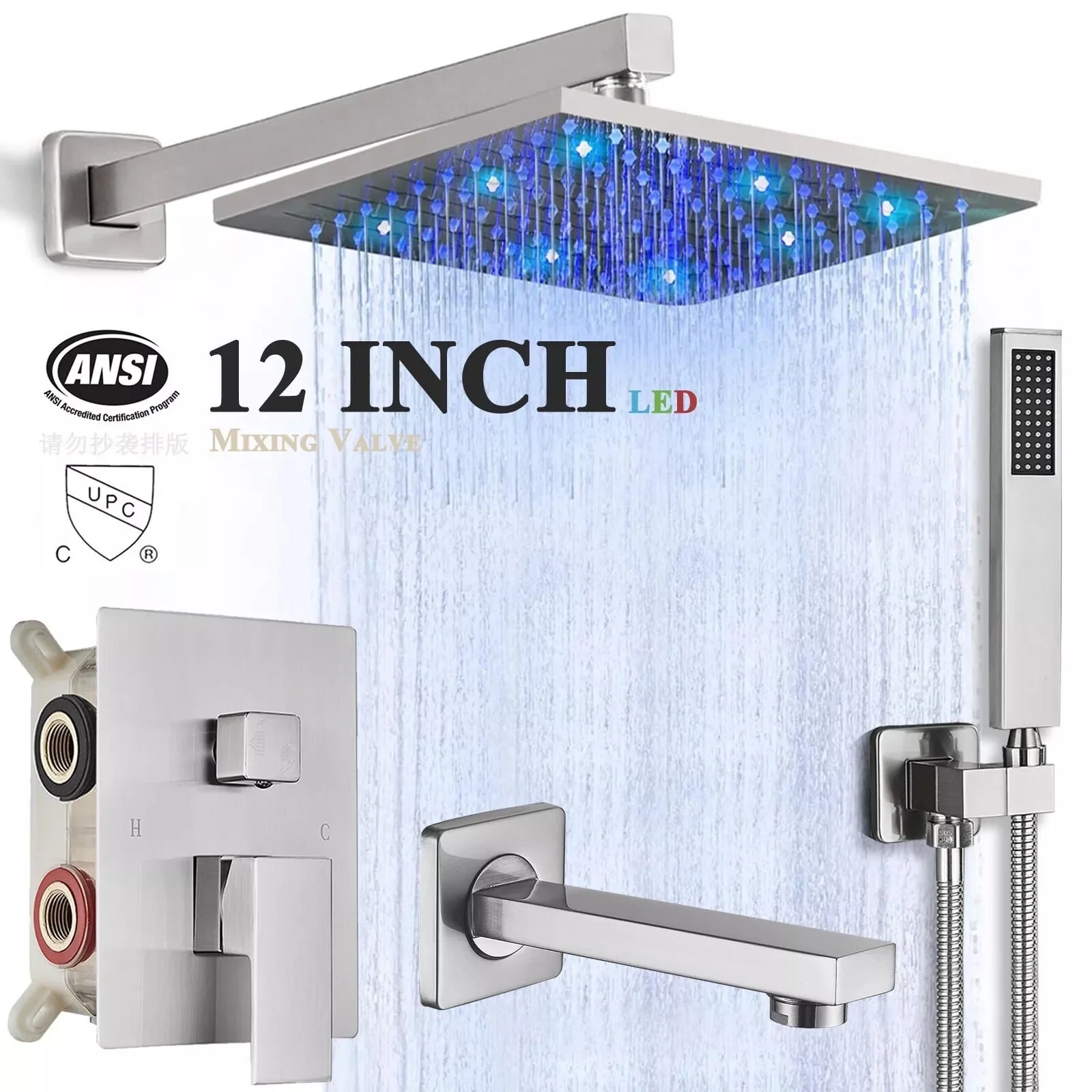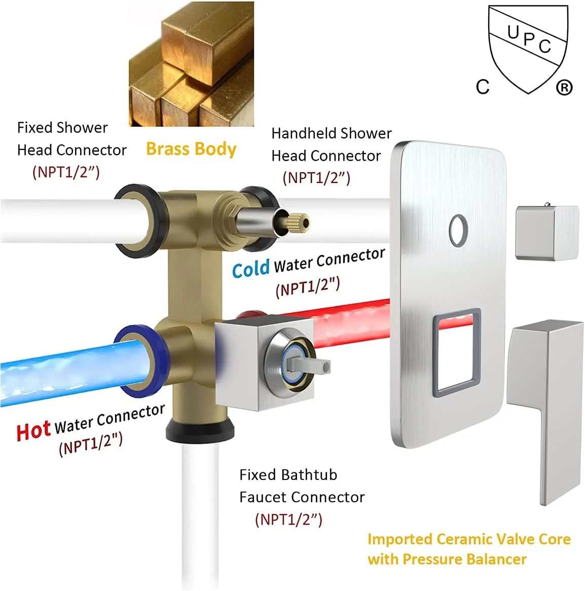 Feetron Brass Brushed Nickel 12 in Shower Faucet Function: Shower Faucet Set Faucet Material: Brass Top Shower Material: Brass Hand Shower Sprayer Material: Brass Spray Hose Length: 150 cm (59 inches) Connection Type: NPT 1/2 Includes: Shower head Shower arm Mixer valve Hand shower Hand shower holder Shower hose Tub spout LED light powered by water flow, no battery needed