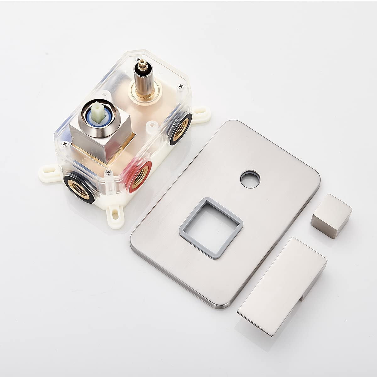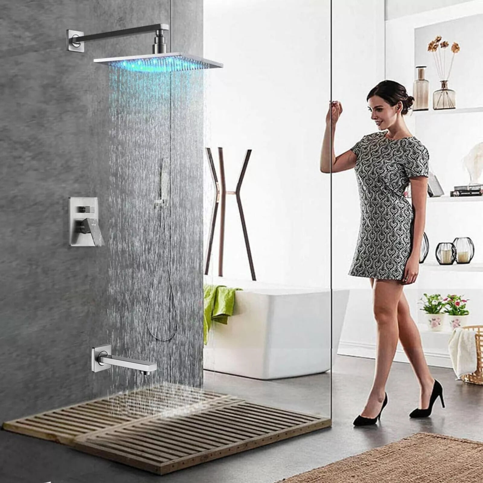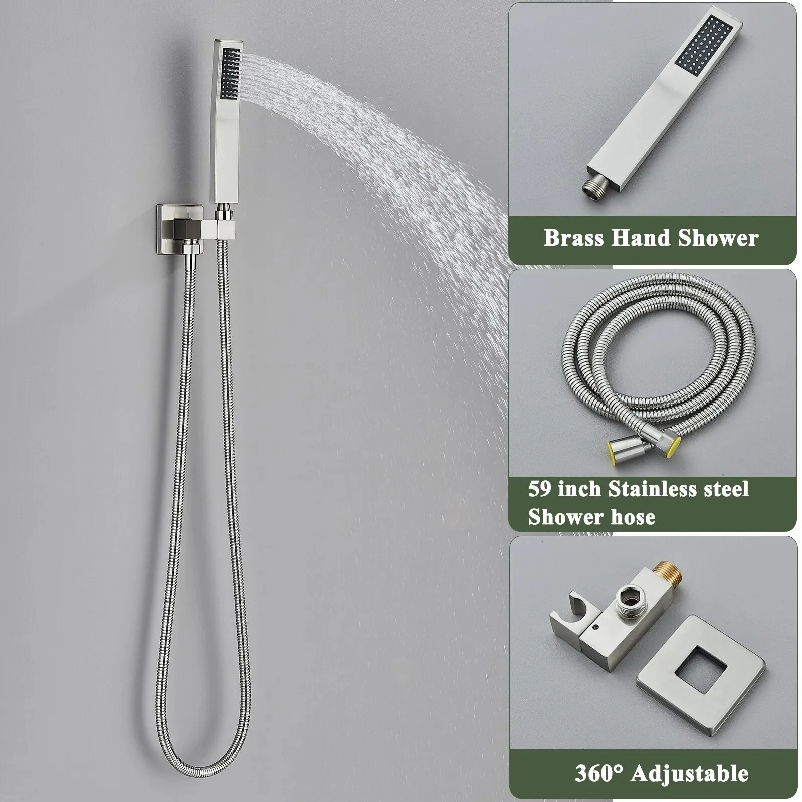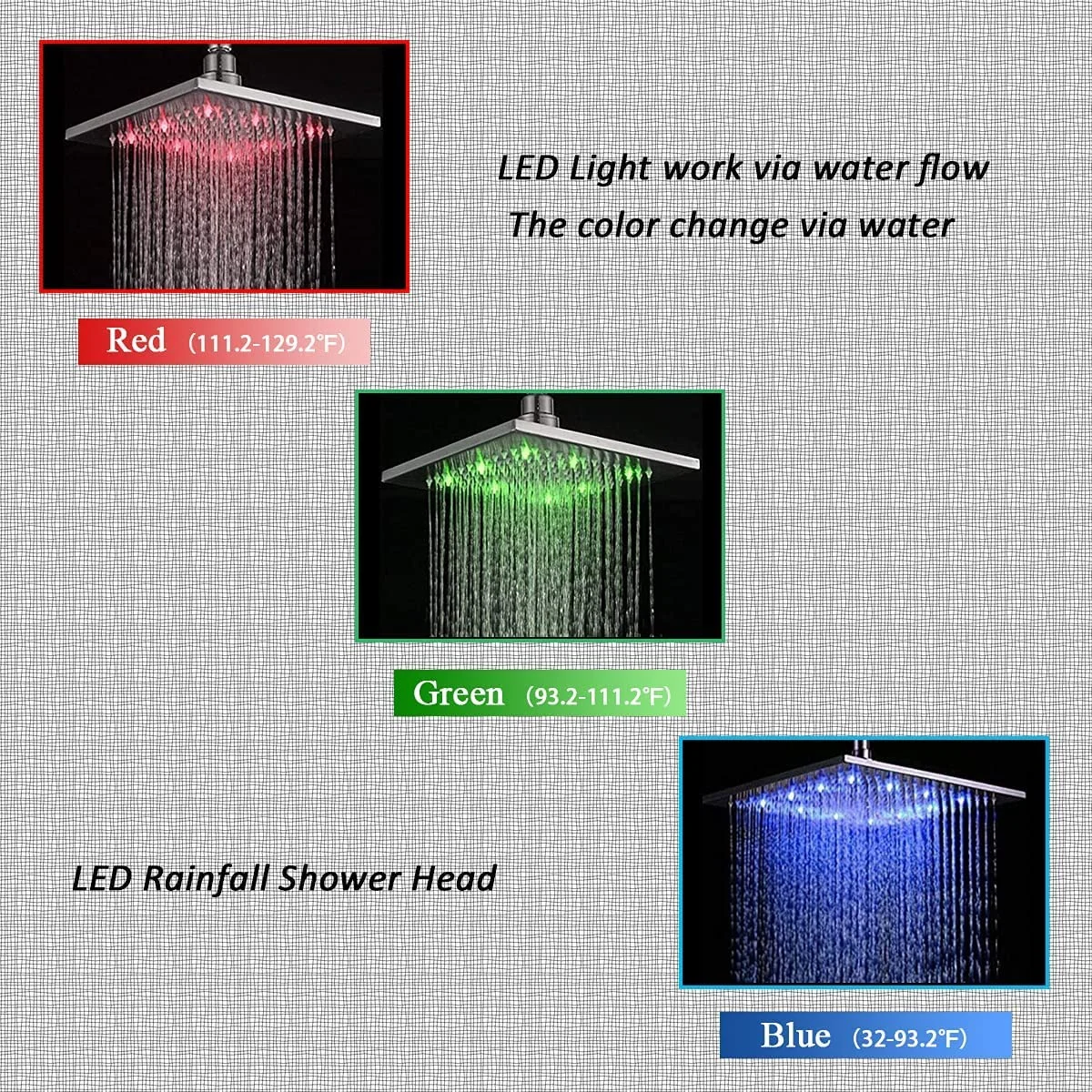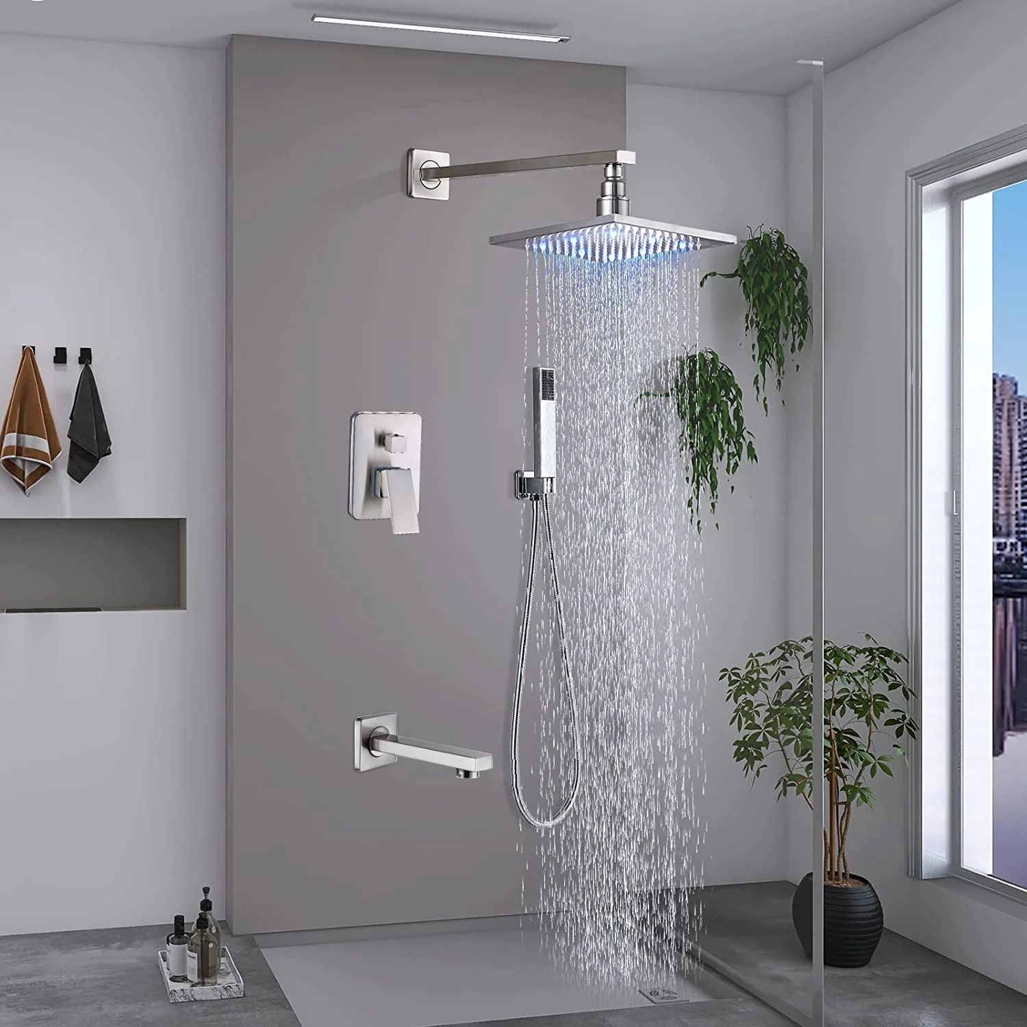 Feetron Brass Brushed Nickel 12 in Shower Faucet Function: Shower Faucet Set Faucet Material: Brass Top Shower Material: Brass Hand Shower Sprayer Material: Brass Spray Hose Length: 150 cm (59 inches) Connection Type: NPT 1/2 Includes: Shower head Shower arm Mixer valve Hand shower Hand shower holder Shower hose Tub spout LED light powered by water flow, no battery needed
