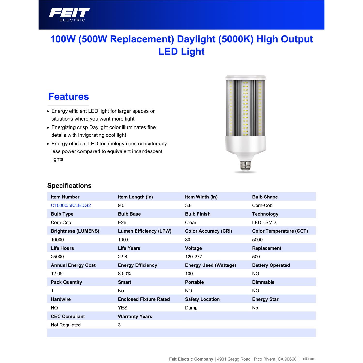 Enjoy all the benefits of advanced LED energy-saving technology with the Feit Electric C10000/5K/LEDG2 100W High Lumen LED Light Bulb. This non-dimmable 5000K natural daylight light produces 10000 lumens using just 100 watts of electricity – up to 80% less energy than an equivalent 500-watt incandescent light bulb. Feit Electric high-output bulbs have an average life of 25,000 hours/22.8 years, are RoHS compliant, and are 100% mercury free. Choose a dependable bulb for general-purpose yard and barn lighting for residential or commercial applications.