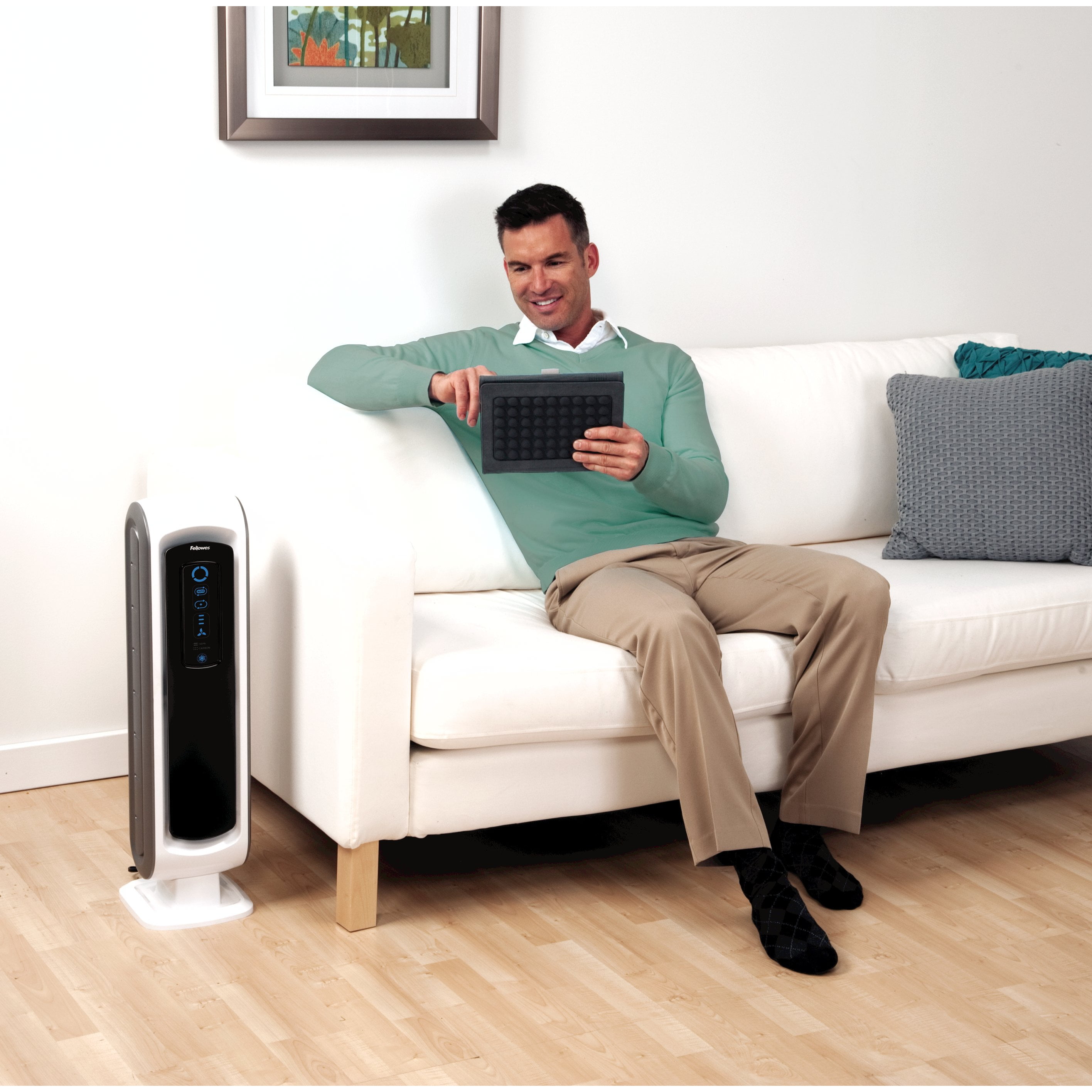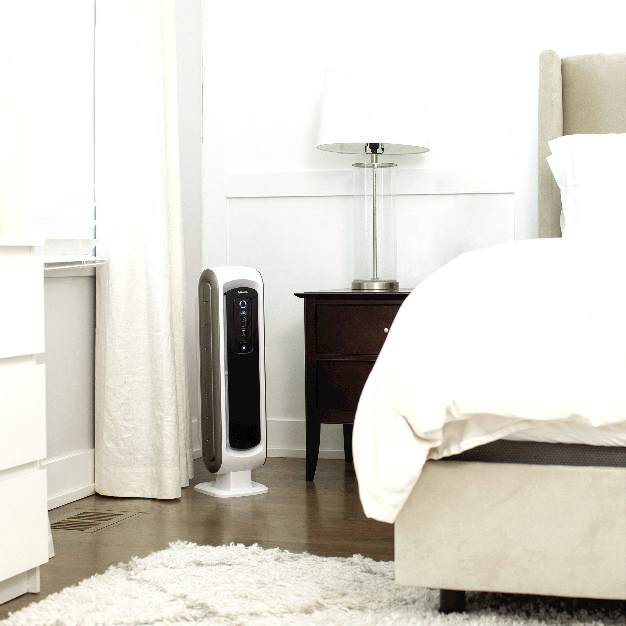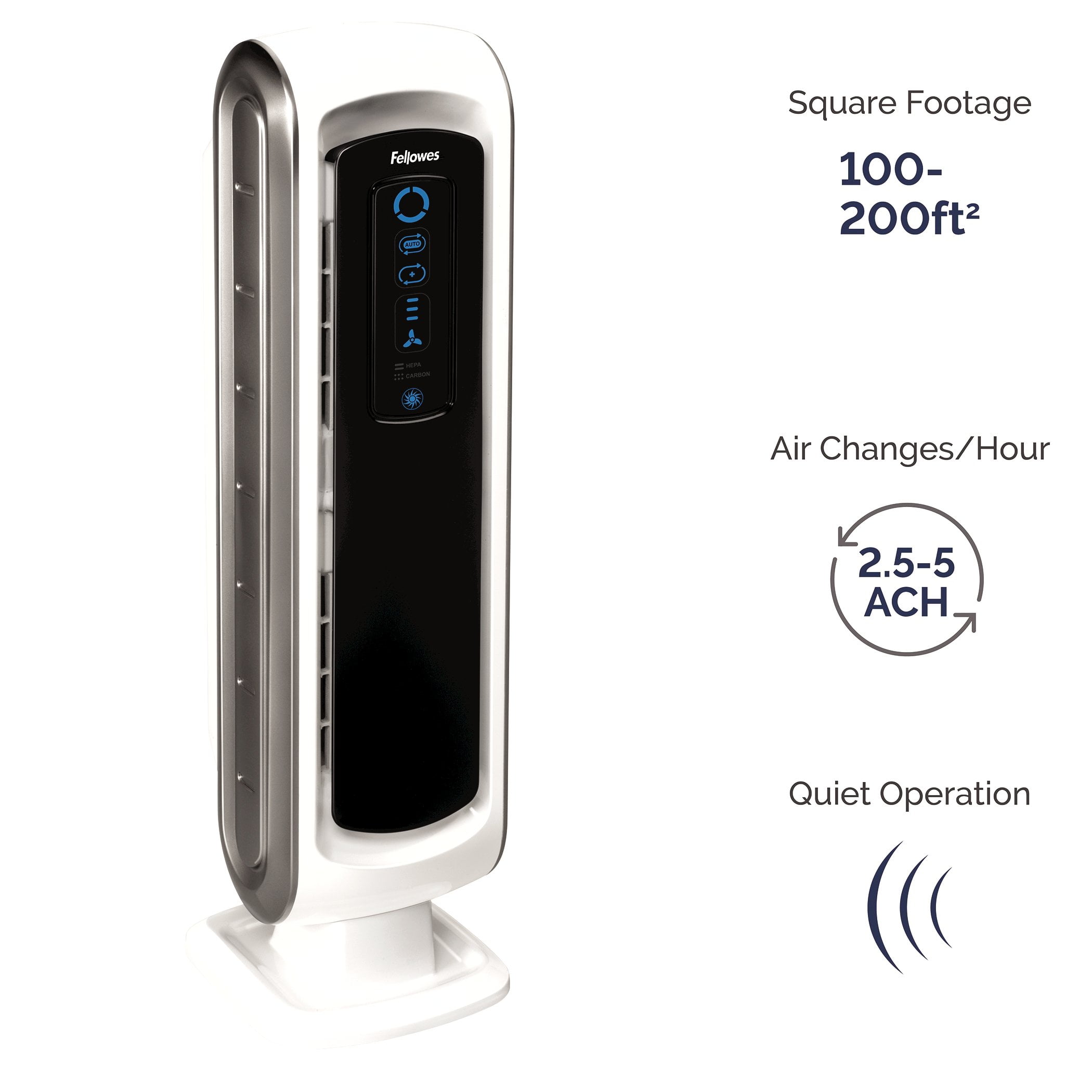 The Fellowes® AeraMax® 90 Air Purifier uses 4-stage hospital-type filtration to effectively purify air in small rooms 100 – 200 square feet. The AeraSmart™ Sensor monitors the air quality and automatically adjusts the fan speed to keep your air purified with ultra-quiet operation. A True HEPA filter with AeraSafe™ antimicrobial treatment safely removes 99.97% of airborne particles as small as 0.3 microns, including viruses, germs, pollen, ragweed, mold spores, and other allergens, while a carbon filter removes odors and captures large airborne particulates. AeraMax PlasmaTrue™ Technology is an optional setting that utilizes ionization to help safely remove airborne pollutants. AeraMax Air Purifiers also features Aera+™ Mode for 35% more air exchanges during allergy and cold/flu seasons. Backed by a 3-year manufacturer limited warranty.