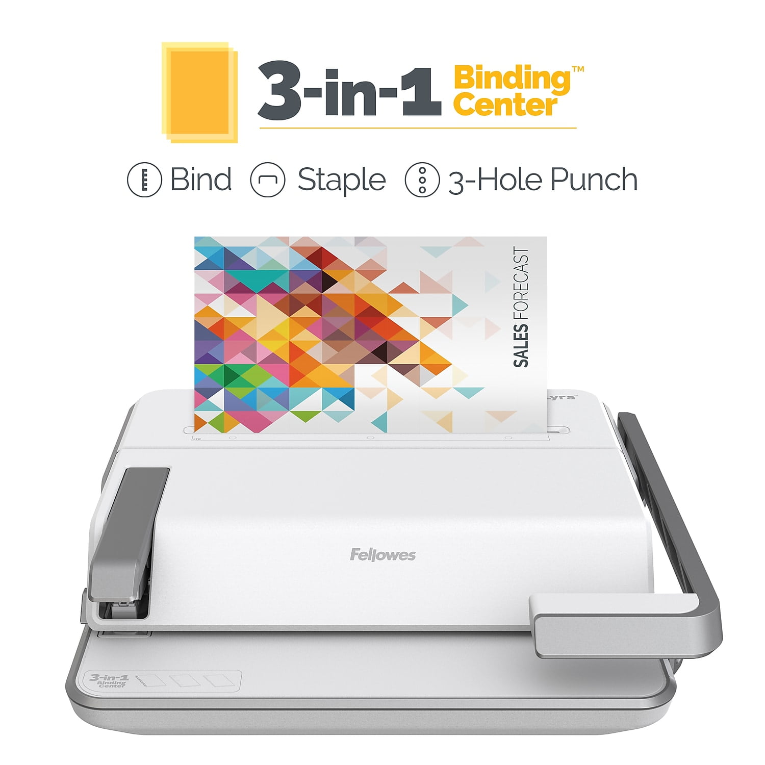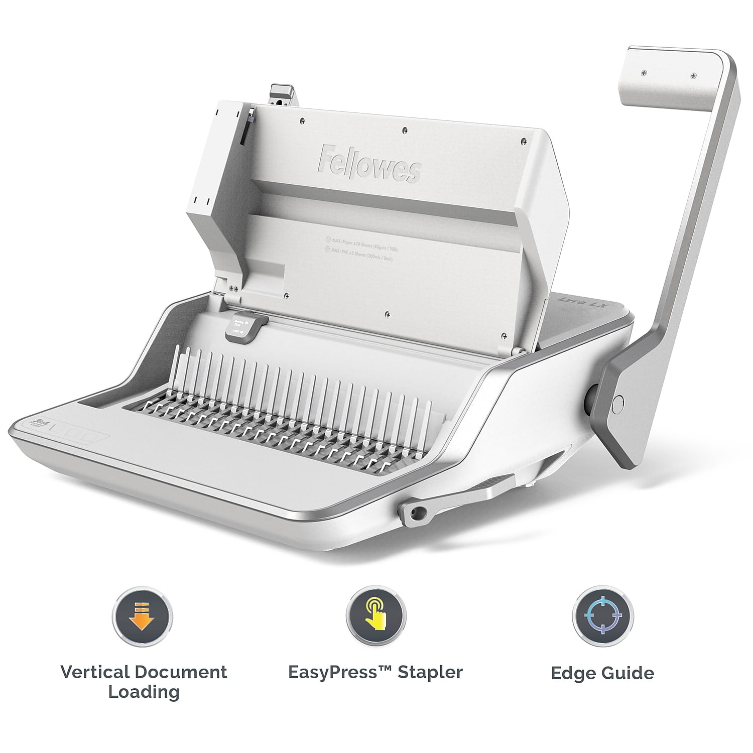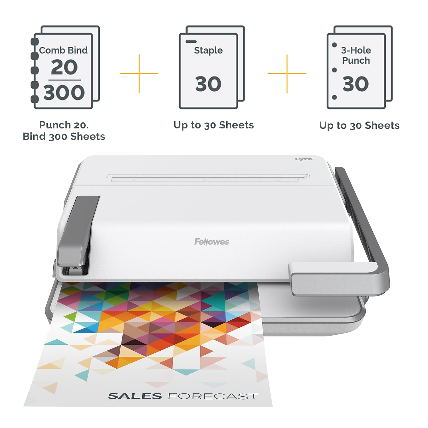 Fellowes Lyra 3-in-1 20 Sheets Punched Comb Binding Machine with Document, White/Gray Combines stapling, 3-hole punching, and comb binding in one machine EasyPress double-action stapler offers effortless stapling for up to 30 sheets Comb binds documents up to 300 pages, comb punches 20 sheets, and 3-hole punches 30 sheets Vertical loading enhances accuracy for faster punching and binding Precision alignment of punching and stapling delivers perfect results Includes document and comb measurement guides for ease of use Built for the office, classroom, library, and more