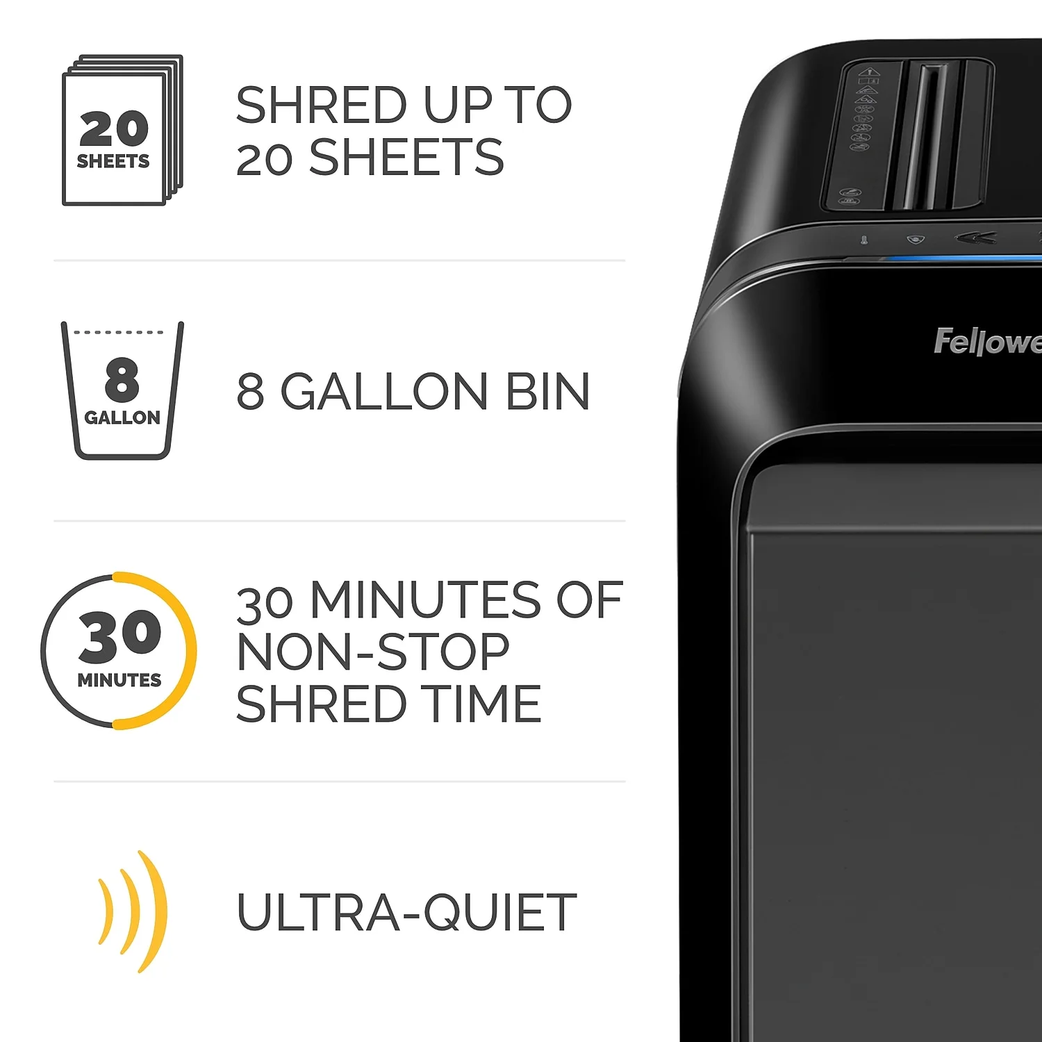 100% Jam Proof System automatically detects and powers through tough jobs to prevent jams instead of just reversing them. This heavy-duty shredder can shred 20 pages and speed through the toughest jobs including staples, paper clips, plastic credit cards, junk mail remark on the reliable and durable performance. The ability to hold up under frequent use in many departmental environments have made these commercial shredders critical for companies who rely on secure and dependable identity theft protection. • Efficiency Meter shows the ideal number of sheets that can be shredded at a time. • Bin Full Indicator signals when the bin is nearly full and when it needs to be emptied. • P-4 Micro-Cut Shredder keeps your most confidential documents secure, shredding approximately 1,257 particles per sheet. • Runs up to 30 continuous minutes before 15 minutes cool down. • Convenient pull-out wastebin holds 750 shredded sheets of paper. • Wheels attached for easy mobility. • Dimensions: 23.25″H x 16.5″W x 11.75″D. • Fellowes recommends oiling your shredder every time you empty the bin to maximizes performance and extends shredder life by slowing blade wear. SafeSense Protection keeps hands and pets safe thanks to intuitive, patented technology that stops shredding when hands or paws touch the paper entry—no unplugging or locking necessary. • 1% Jam-Proof System.