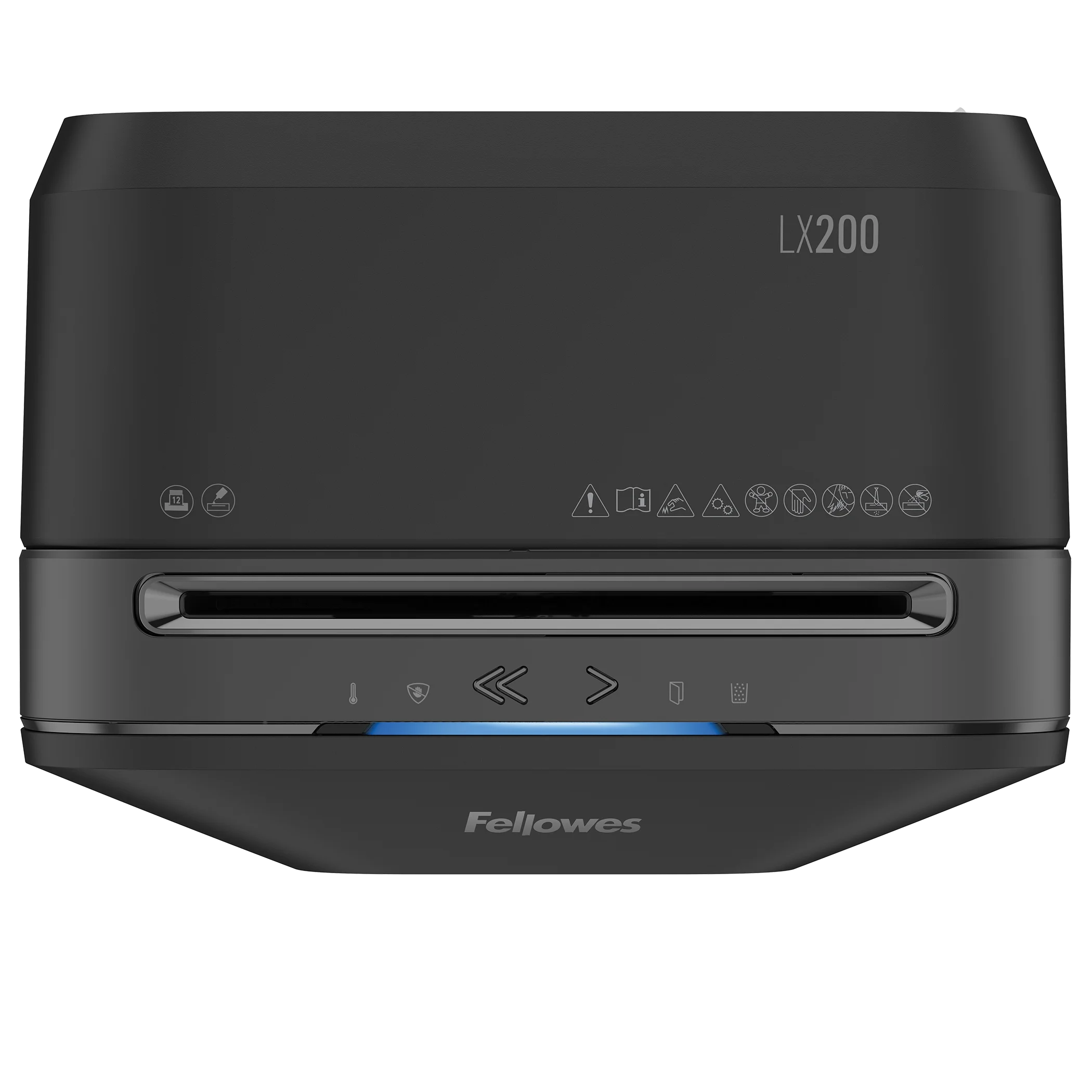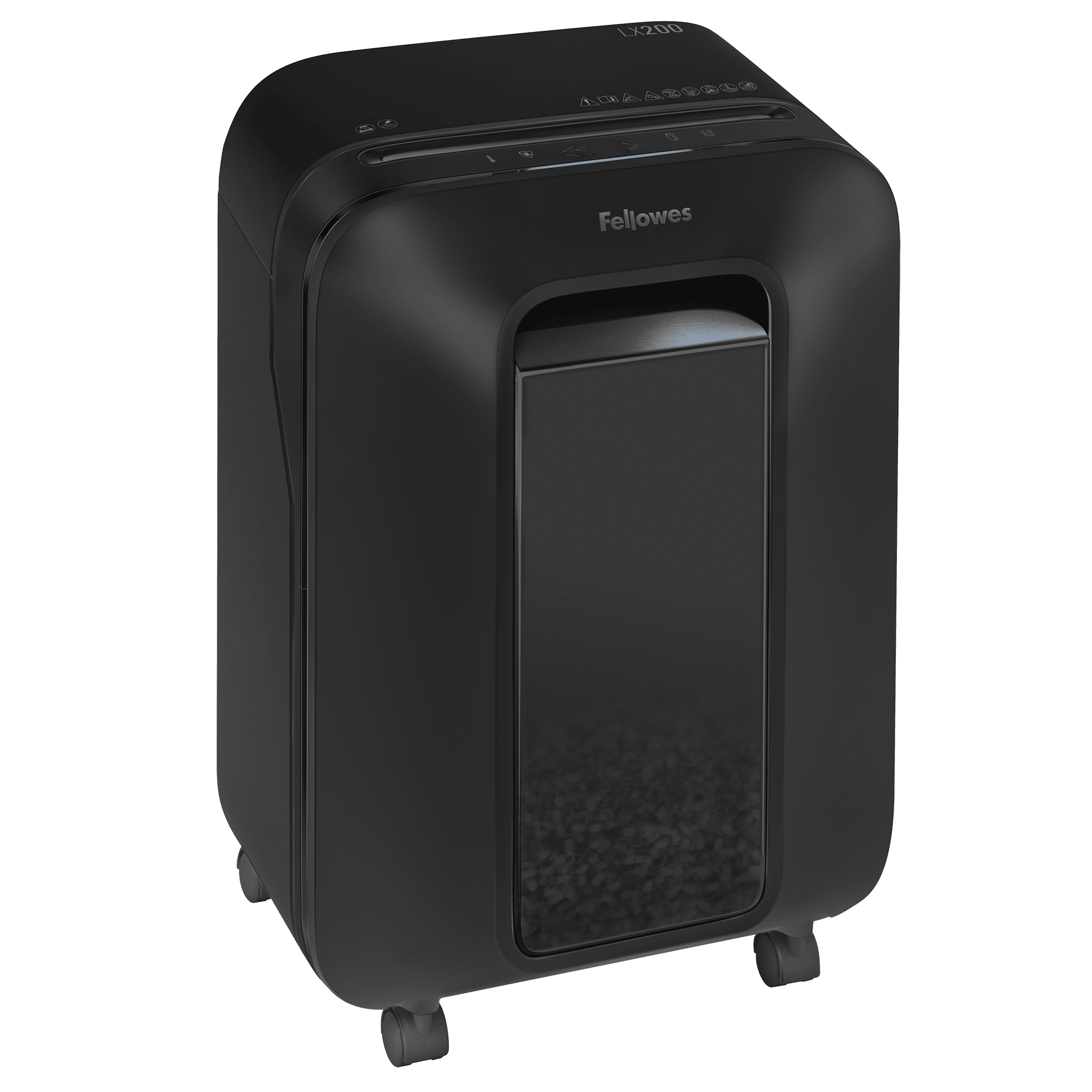 100% Jam Proof System: Unlike other paper shredders, the LX200 automatically detects and powers through tough jobs to prevent jams instead of just reversing them Optimal Shredding: This heavy-duty shredder can shred 12 pages and speed through the toughest jobs including staples, paper clips, credit cards, junk mail and more SafeSense Protection: Keep hands and pets safe thanks to intuitive, patented technology that stops shredding when hands or paws touch the paper entry—no unplugging or locking necessary Efficiency Meter: Indicates the ideal number of sheets that can be shredded at a time Bin Full Indicator: Know when the bin is nearly full and when it needs to be emptied P-4 Micro-Cut Shredder: Keep your most confidential documents secure, shredding approximately 1,257 particles per sheet 100+ Years of Innovation: Driven by a commitment to quality, Fellowes is dedicated to developing solutions to help you be at your best