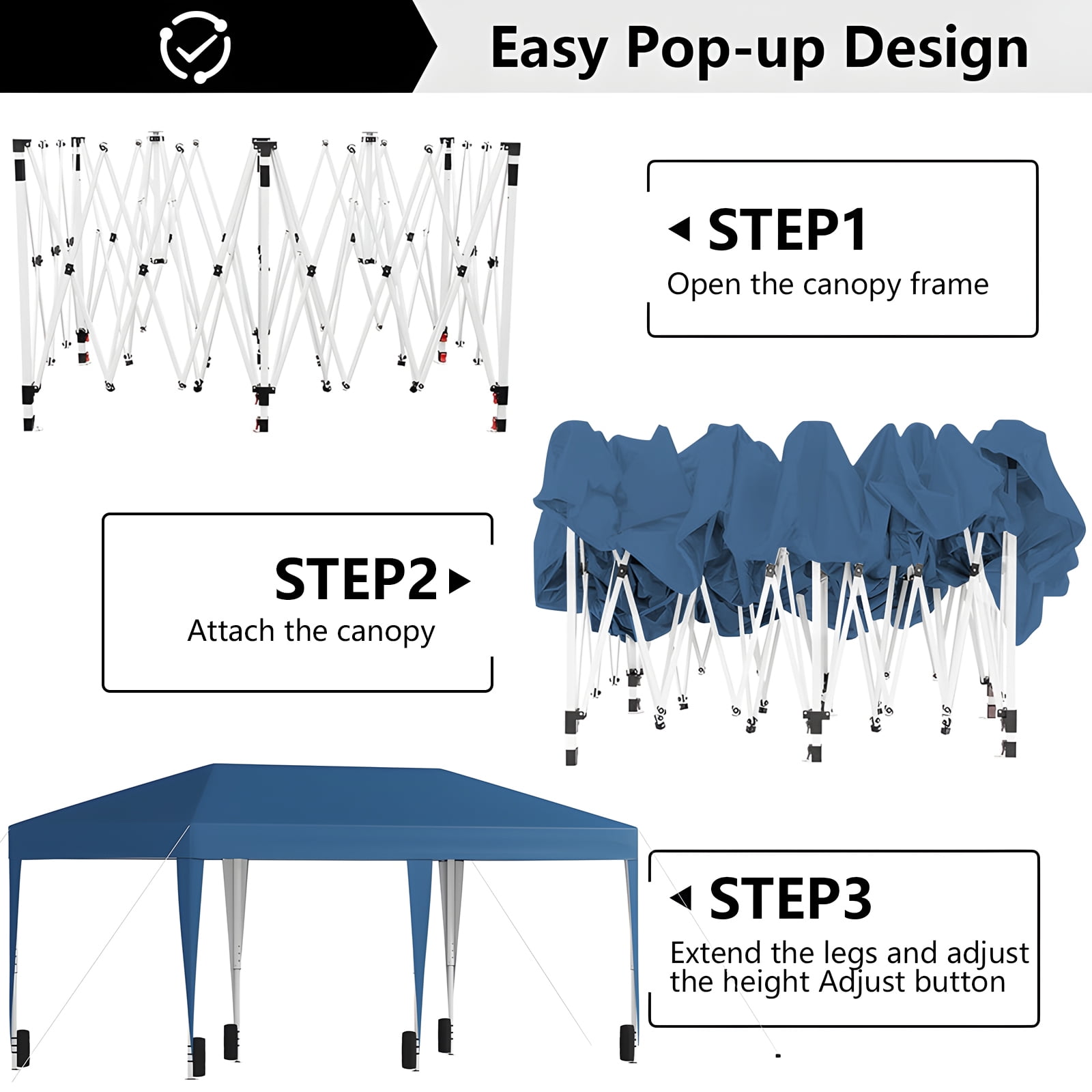 Full Stability: Includes footpads, sandbags, ropes, and stakes. Effortless Setup: No tools needed, quick setup by 2-4 people. Spacious Design: Three adjustable heights, no cross beams. Portable: Folds into a handbag for easy transport. Multi-Purpose: Perfect for parties, sports, camping, BBQs. Waterproof Canopy: 210D oxford cloth with waterproof treatment. UV Protection: Silver-coated fabric blocks harmful UV rays. Strong Frame: Sturdy, powder-coated alloy steel frame.