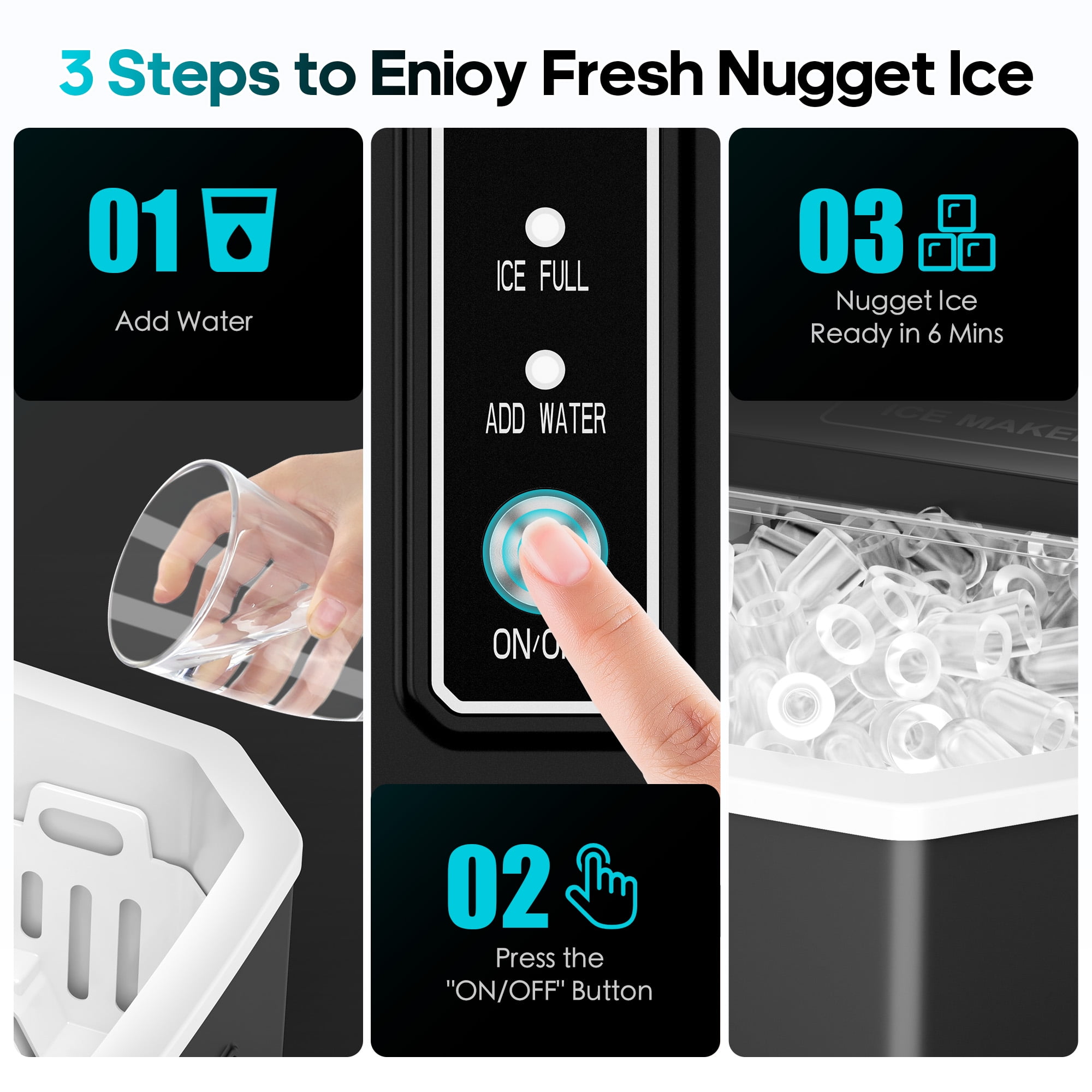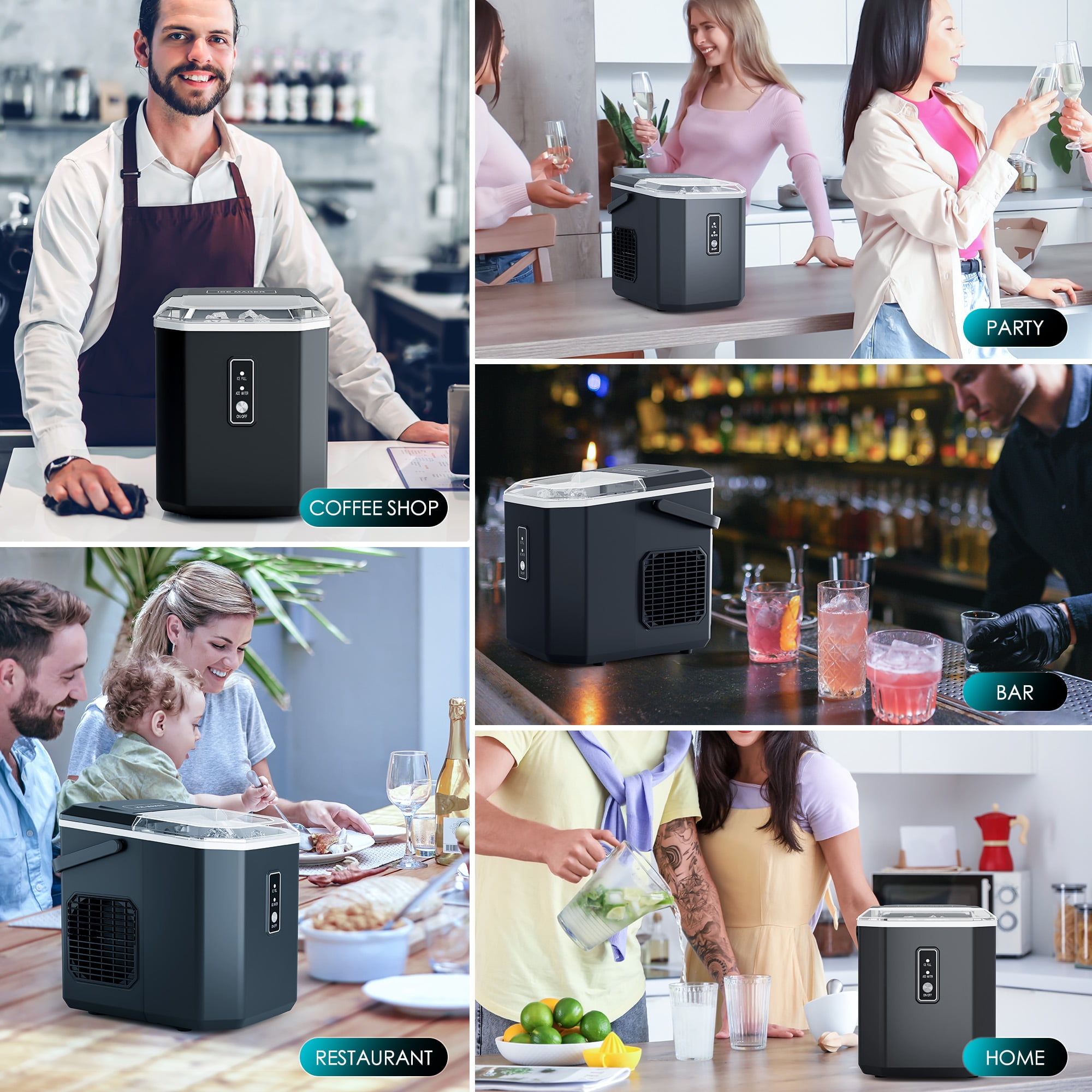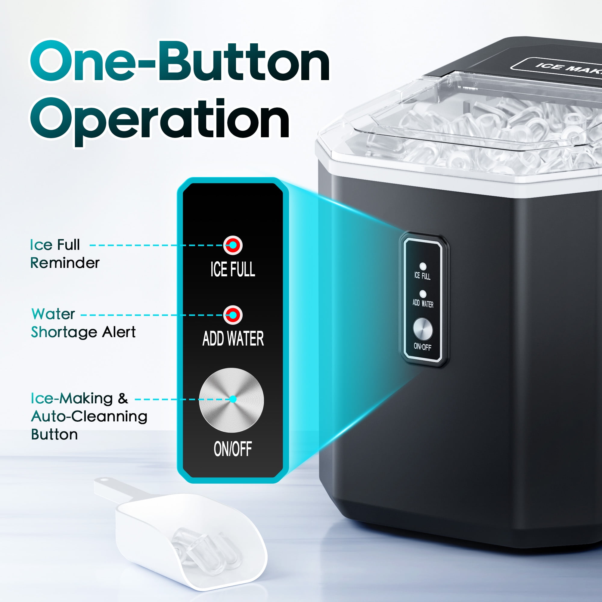 Quick Ice Production: Delivers 9 bullet-shaped ice cubes in 6–9 minutes, perfect for chilling drinks fast. Produces up to 26 lbs of ice per day to meet daily needs for home, office, or small gatherings. Compact & Portable: Lightweight design with a built-in handle makes it easy to carry and store. Great for kitchens, RVs, dorm rooms, offices, or camping trips. One-Touch Self-Cleaning: Features an automatic cleaning function to maintain hygiene and extend the machine’s life—just press one button and let it clean itself. Quiet & User-Friendly Operation: Operates at less than 45 dB with simple control panel and clear indicators for water shortage and ice full. Transparent lid allows easy viewing. Modern & Durable Design: Sleek silver finish blends into any kitchen or office décor. Durable ABS construction with removable ice basket and included scoop for added convenience.
