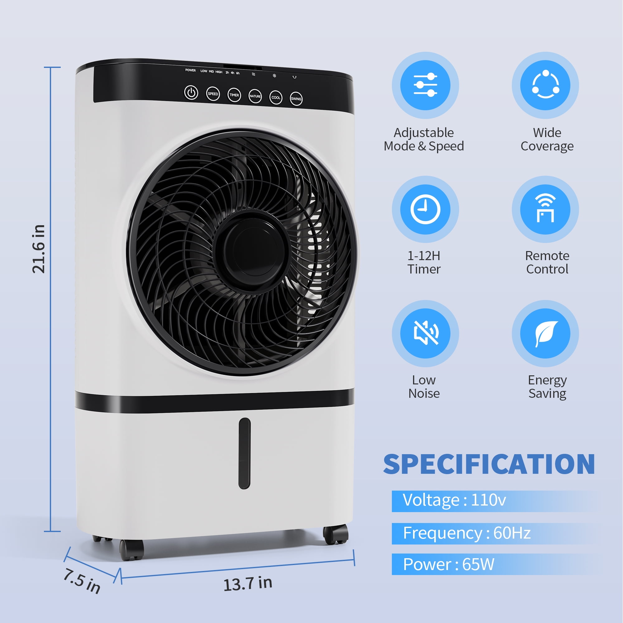 3-in-1 Cooling Performance: Functions as a powerful fan, humidifier, or evaporative air cooler—no water needed for fan mode and simple add-water cooling when you want extra comfort. Ice-Pack Enhanced Chill: Freeze the included reusable ice packs, drop them into the tank, and activate cooling mode for instantly cooler, refreshing airflow. Dual Water-Tank System: Top-fill tank for quick refills and a large 7 L bottom tank with secure lock—easy detachment for fast drainage and hassle-free cleaning. Intuitive Dual Control: Choose between the sleek touch-panel interface or the handy remote control to adjust modes, fan speed, timer, and oscillation without moving from your spot. Energy-Efficient & No Installation: 65 W low-power operation provides strong airflow at minimal cost, with no assembly or window fitting required—just unpack and enjoy.
