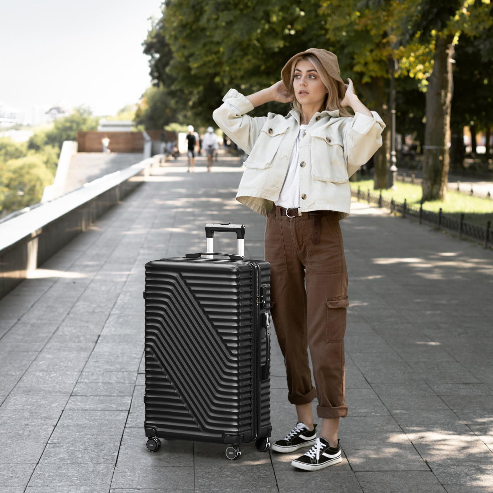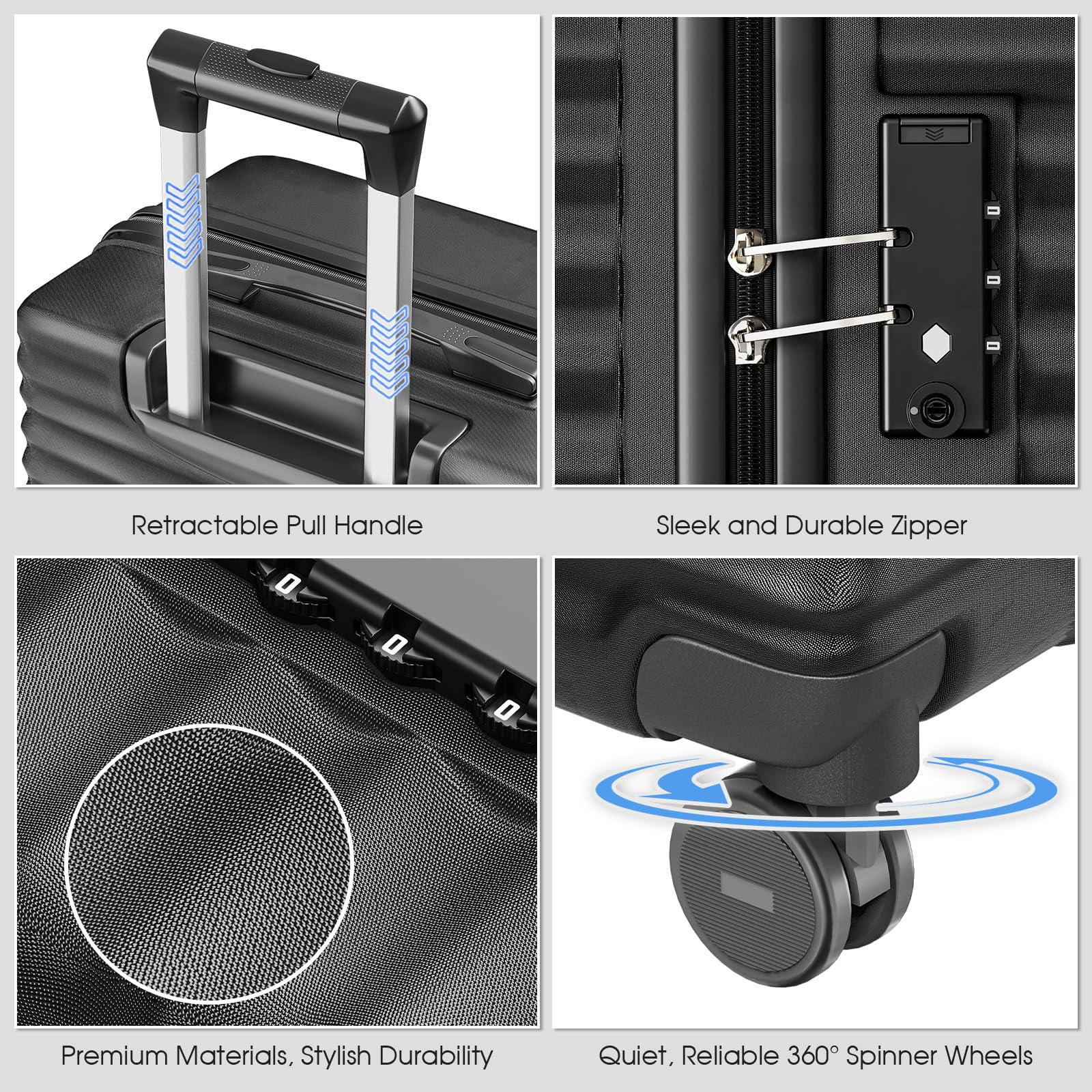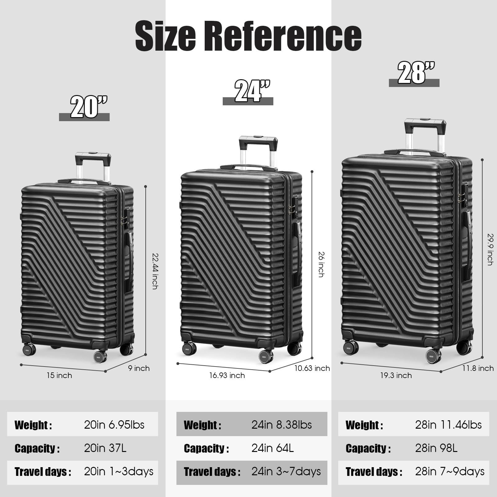 【High Quality Material】High-strength ABS composite hardshell resists impacts and scratches while remaining ultra-lightweight for effortless handling during long journeys. 【Suitcases with Spinner Wheels】3 PCS Multidirectional smooth and silent 360°wheels, has strong bearing capacity. Smooth rotating wheels can help save your strength and make your suitcase lighter. It ensures for long journey usage and safety. 【Luggage with TSA Lock】TSA customs password lock design to avoid violent damage to the luggage. Which allows only TSA agents to inspect your bags without damaging the lock when traveling. Only TSA agent have the keys. Usually we use a digital code to open the lock. 【 Aluminum Telescopic Handle】Suitcase has a sturdy ergonomic metal 3-step telescopic handle. The side handles are easy to lift. Push-button locking handle adjusts to multiple heights for comfort when you daily travel. Luggage Capacity: 20 inch: 43 L 24 inch: 72 L 28 inch: 105 L