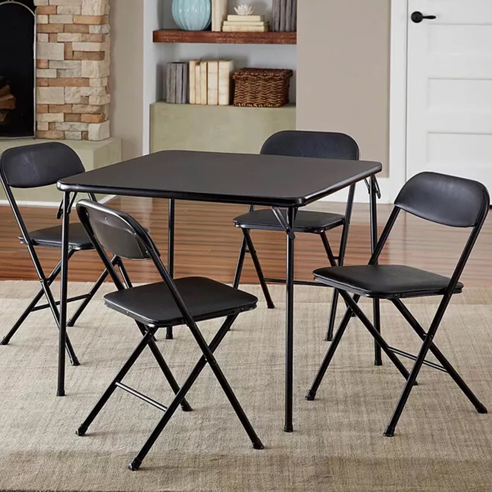 Add extra seating for family and friends with the Fenbeli 5-Piece Card Table Set, perfect for parties or any occasion that needs a dining setup. This black Fenbeli card table set comfortably seats four people for games, crafts, or meals. Its sleek black finish complements almost any home decor, and the chairs tuck neatly under the table to save space. The chairs have vinyl-upholstered seats, and the tabletop is made of PVC, making the entire set easy to clean. Plus, the card table and chairs fold up neatly for convenient, space-saving storage. Ideal for offices, recreation rooms, small apartments, and more.