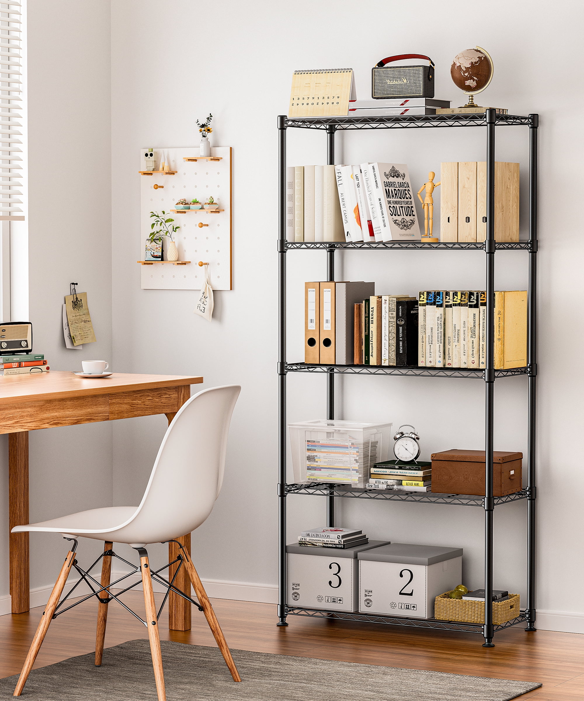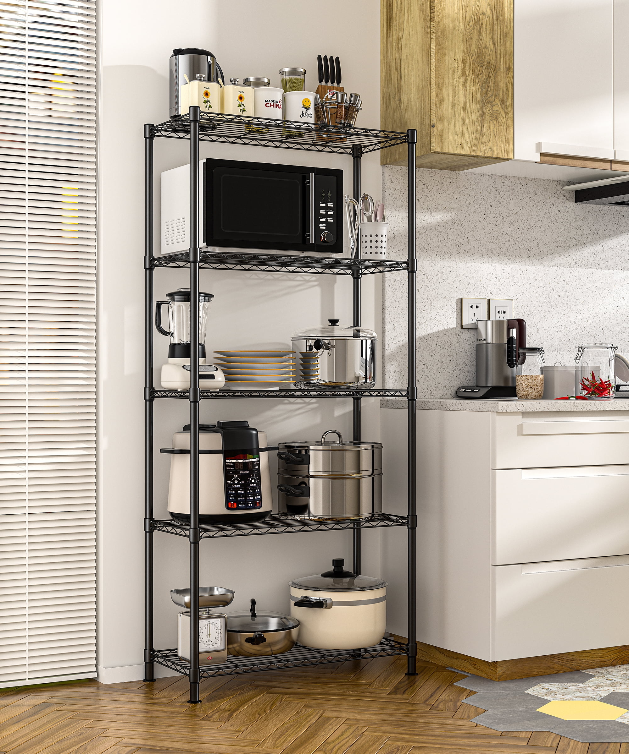 FeaturesThis is 5 tier commercial wire shelf,all the shelf is can adjust height .The shelving unit is made of steel wire shelving.The weight limit for each shelf is 250 pounds, and the total weight limit for the entire shelf is 1250 pounds. The storage shelves provide an enormous amount of space for you and no occupy too much space.You can use this wire shelving in the kitchen bedroom garage and more. Tools, books,household appliances and other things can be placed on this wire shelving. Features Easy to assemble, no tools needed. Improve addition space, no occupy too much space. Commercial Adjustable wire shelving,Easy to store things. Sturdy metal construction,can withstand heavy objects. Brand new and high quality. The surface of the garment rack is black paint plated. Works Anywhere,suitable for bedroom, cloakroom, laundry room,store clothing, shoes, socks, bags 【EASY TO ASSEMBLE】: The wire shelf is easy to assemble,This storage shelves structure is very simple ,No tools required to assemble it.The wire shelving unit is simple to assemble,You only need to spend 15min to install it.wire shelf storage shelves wire shelving unit. 【ADJUSTABLE】: You can adjust the height of the storage shelves according to the size of the item.The spacing of each layer of this wire shelf can be adjusted.shelves adjustable leveling feet allow the wire shelving unit to be placed on uneven ground–a simple twist is all it takes to stabilize.storage shelves wire shelf wire shelving unit. 【LARGE STORAGE AND STUDY】:This storage shelves provide an enormous amount of space and strong shelves.The wire shelving unit doesn’t occupy too much space,but it can create more additional space.The wire shelf total unit weight capacity is 1250 lbs.storage shelves wire shelving unit wire shelf. 【MULTIFUNCTIONAL】: This wire shelf is for a wide range of applications.You can use this wire shelving unit in a variety of places, such as the bathroom kitchen garage.Tools, books,household appliances and other things can be placed on this storage shelves.wire shelf wire shelving unit storage shelves.