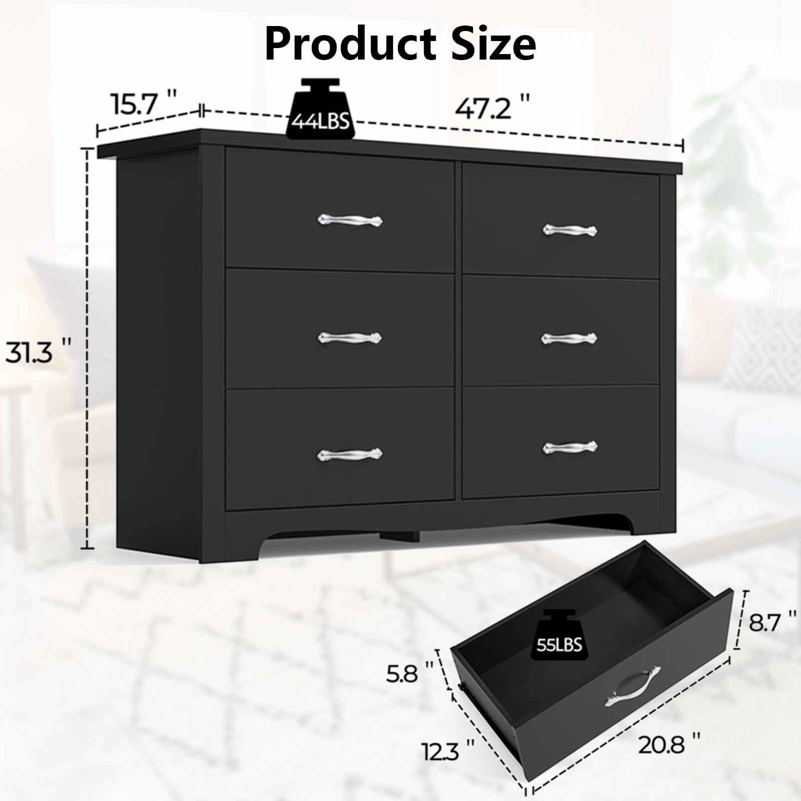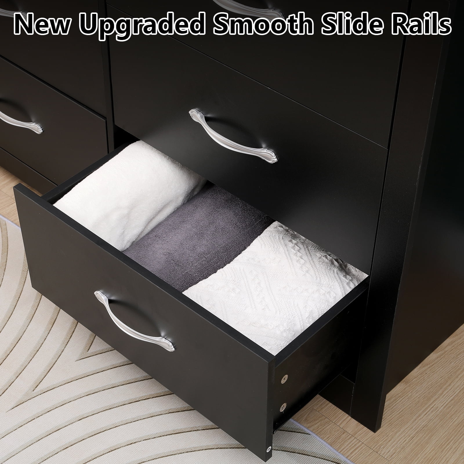 Functional and Stylish: Combining practical storage solutions with sleek aesthetics, the dresser enhances both the functionality and visual appeal of your bedroom, creating a more organized and inviting space. Ample Storage: Six spacious drawers provide ample room to neatly organize and store clothing, accessories, and personal items, keeping your bedroom clutter-free. Durable Construction: Built with sturdy materials and robust metal slides, each drawer can withstand up to 55lbs, ensuring long-lasting durability and smooth operation. Space-Saving Design: Designed to optimize bedroom space, the dresser offers extensive storage capacity while occupying less floor area than traditional horizontal chests. Versatile Style: Its timeless design and neutral finish complement various bedroom aesthetics, from modern to classic, making it a versatile addition to any decor scheme.