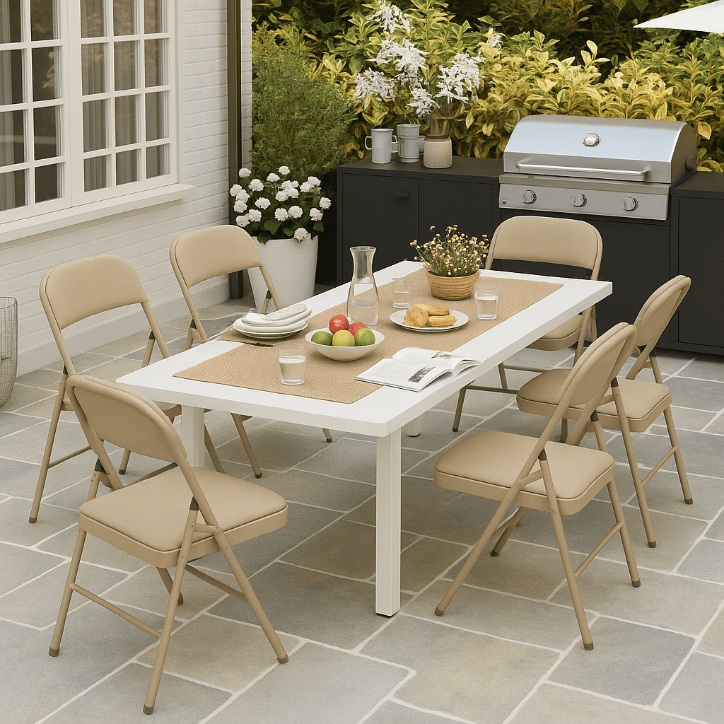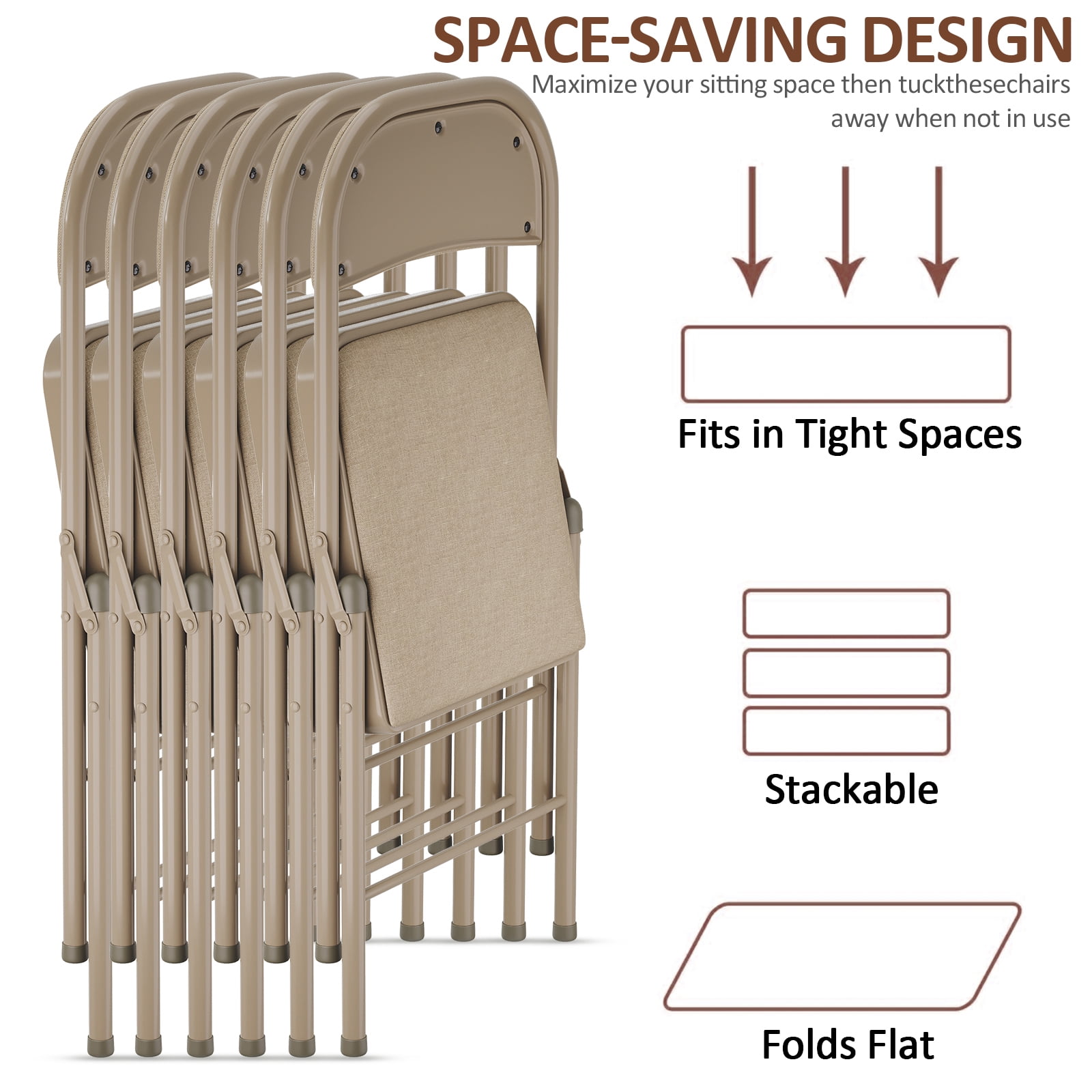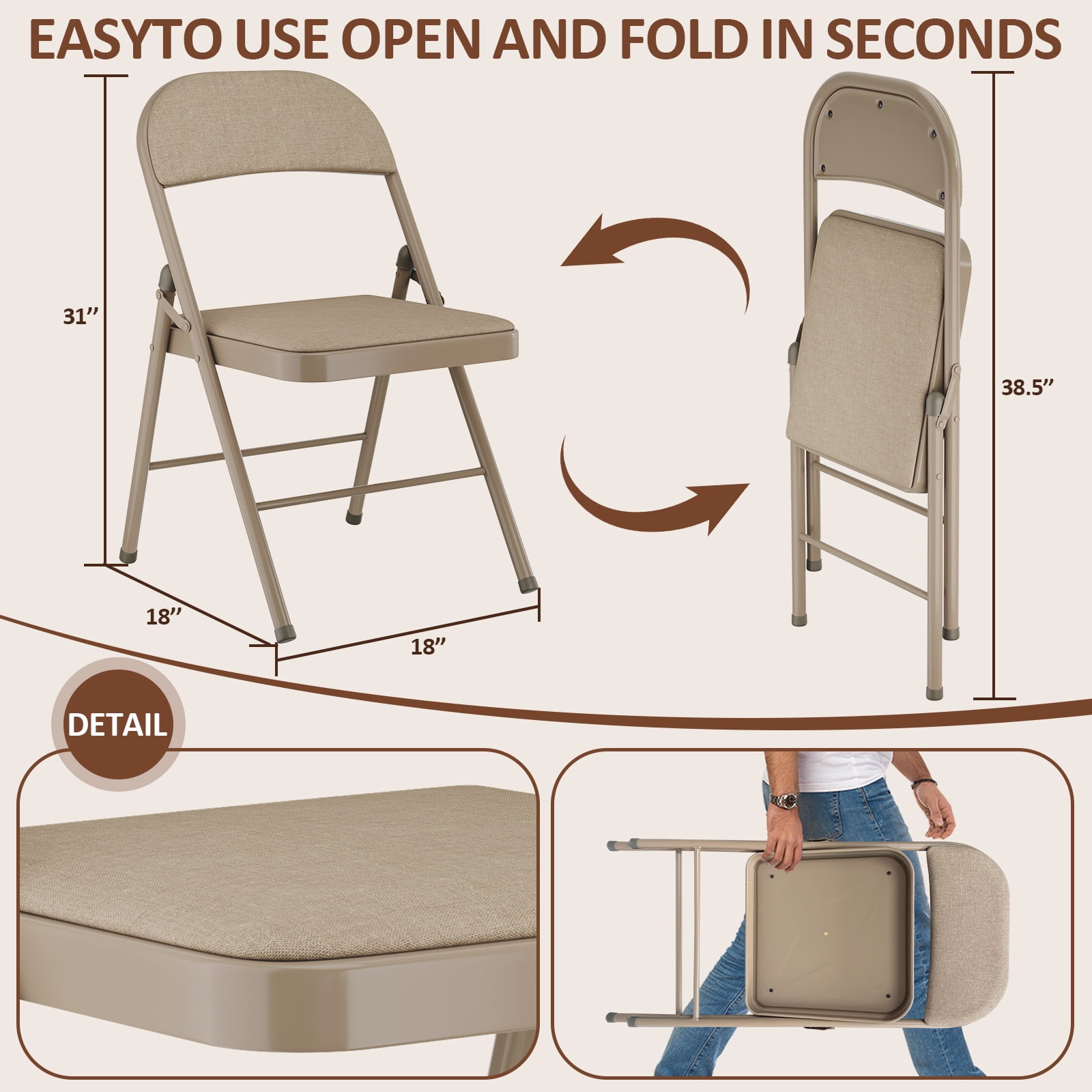Premium Comfort: Each chair features a thick padded seat and backrest with high-density foam, delivering superior cushioning and ergonomic support. Perfect for long events, from dining to gatherings, ensuring guests remain comfortable for hours. Durable Construction: Crafted with a powder-coated steel frame that resists rust, scratches, and wear. The sturdy design supports up to 350 lbs while maintaining a lightweight profile for easy transport and storage—ideal for both indoor and outdoor use. Effortless Storage: Innovative folding mechanism collapses each chair flat in seconds, reducing the footprint to 18″ × 38.5″ for compact storing in closets, car trunks, or event spaces. Simplify setup and teardown for any party or meeting—instantly. Easy Maintenance: Upholstered in stain-resistant polyester fabric, these chairs wipe clean with a damp cloth, repelling spills and dirt. The neutral brown hue complements any décor and stays fresh through countless uses, both indoors and outdoors. Versatile Style: The sleek, modern silhouette and warm brown finish integrate seamlessly with any setting—from casual patios and backyard barbecues to formal banquets and office events. Elevate your seating with practical elegance every time.