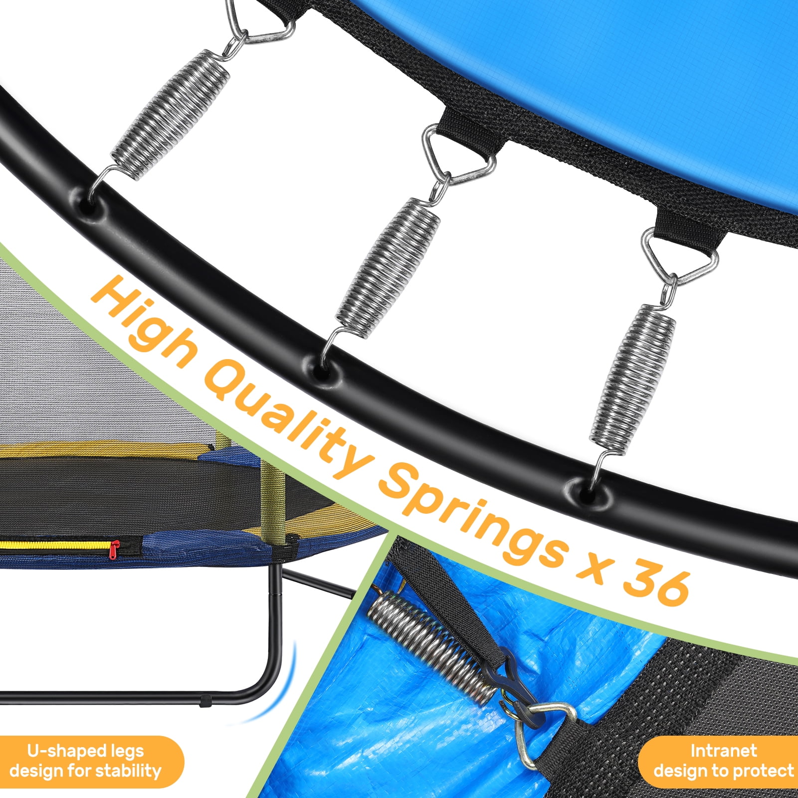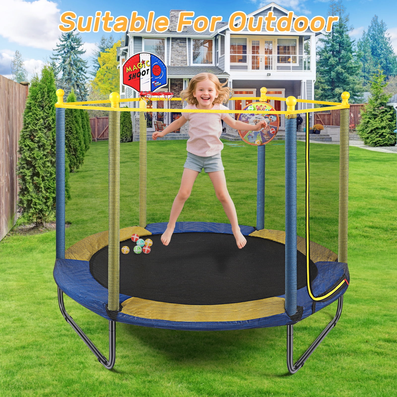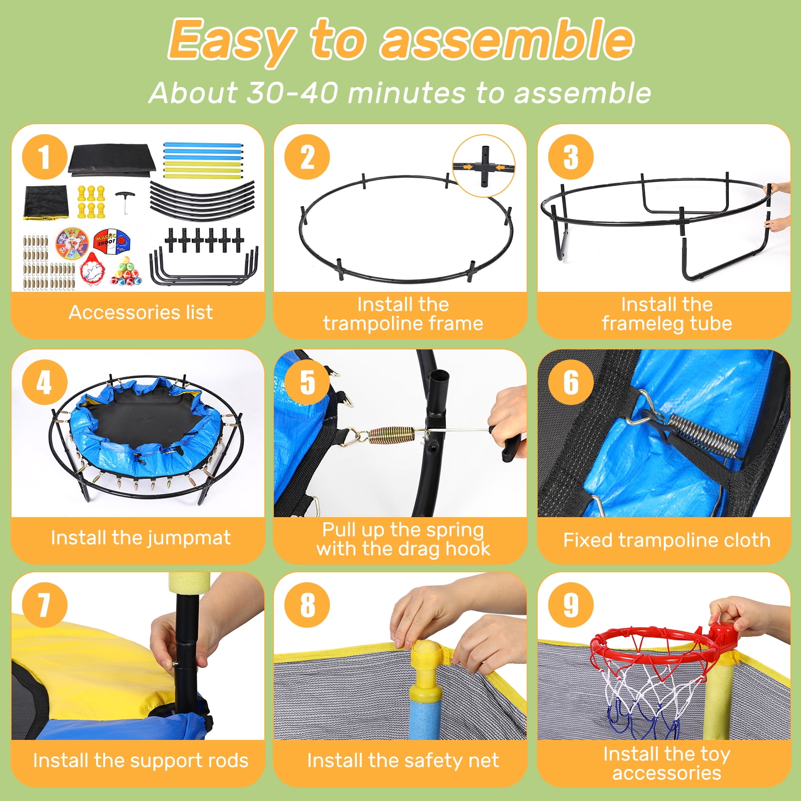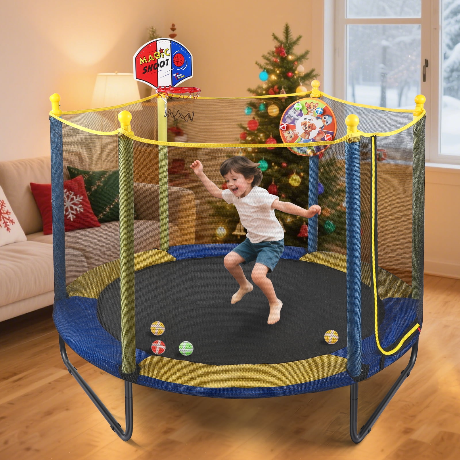 Extra Bouncy Jumping Fun: With 36 high-tension springs, this trampoline for kids delivers extra bounce for endless excitement. The hidden spring design and U-shaped legs provide maximum safety and stability, so kids can jump freely without worrying about shifting or imbalance. Easy Assembly and Bonus Accessories: Set up your indoor trampoline for kids effortlessly with the included instructions. Plus, your child will love the added basketball hoop, dartboard, and colorful ocean balls that turn every bounce into an interactive adventure. Spacious 5FT Jump Zone: Sized at 60 inches, this kids trampoline offers a roomy jump area while still fitting easily in most yards or playrooms. The triple-layer padded frame and thick safety net help create a secure space where your child can jump, laugh, and grow. Designed for Safety & Comfort: This toddler trampoline features a fully enclosed mesh net with sponge padding for enhanced protection. The no-gap design ensures that little fingers stay safe while kids enjoy worry-free fun—indoors or outdoors. Perfect Gift for All Seasons: Looking for a great gift? This trampoline indoor and trampoline outdoor setup suits any space and season. Whether it’s a holiday, birthday, or just because, it’s the perfect way to bring energy, joy, and fitness into your child’s day.