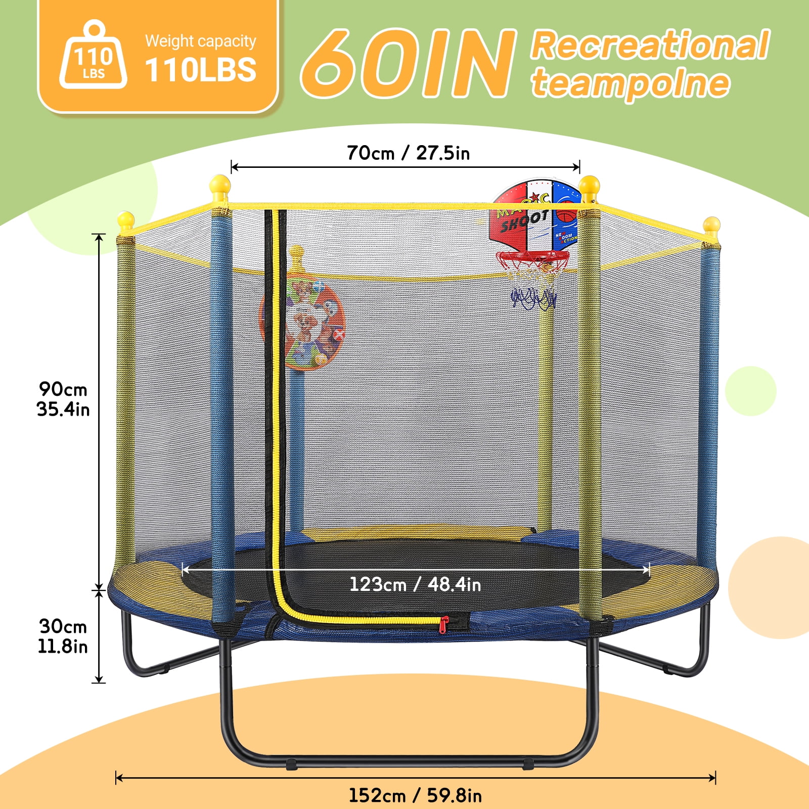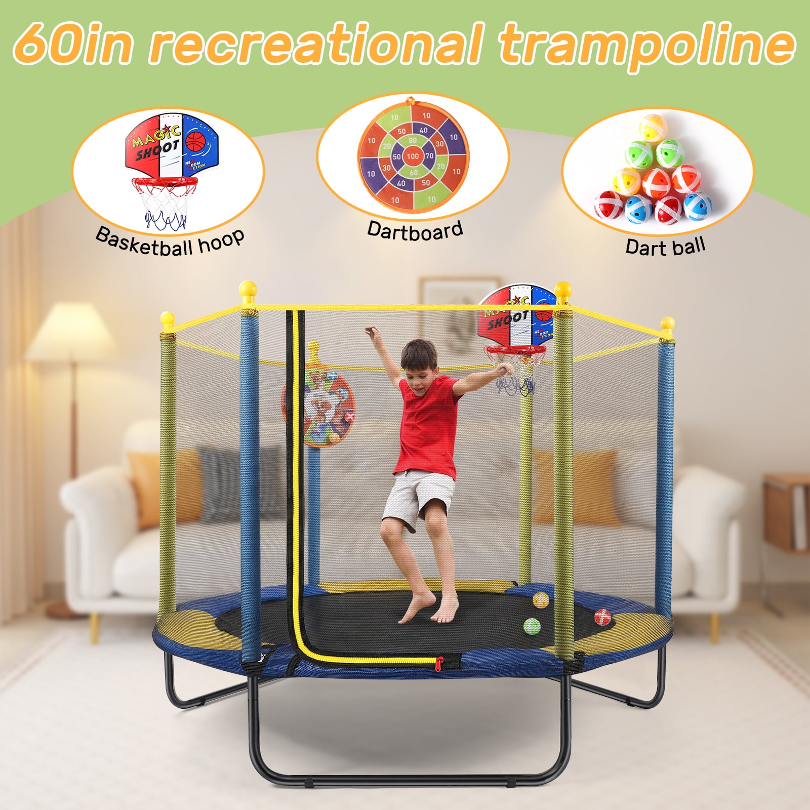 Fenbeli 60” Kids Trampoline with Safety Net, Basketball Hoop & Dartboard, Indoor Outdoor Toddler Trampoline for Ages 1-8