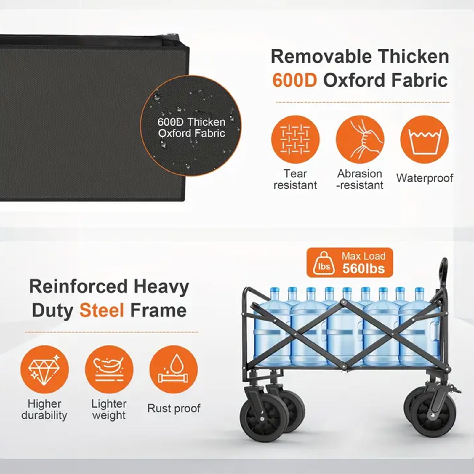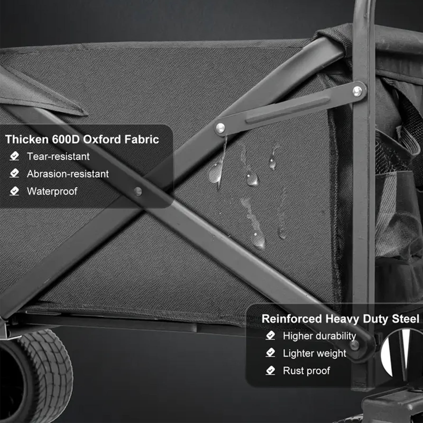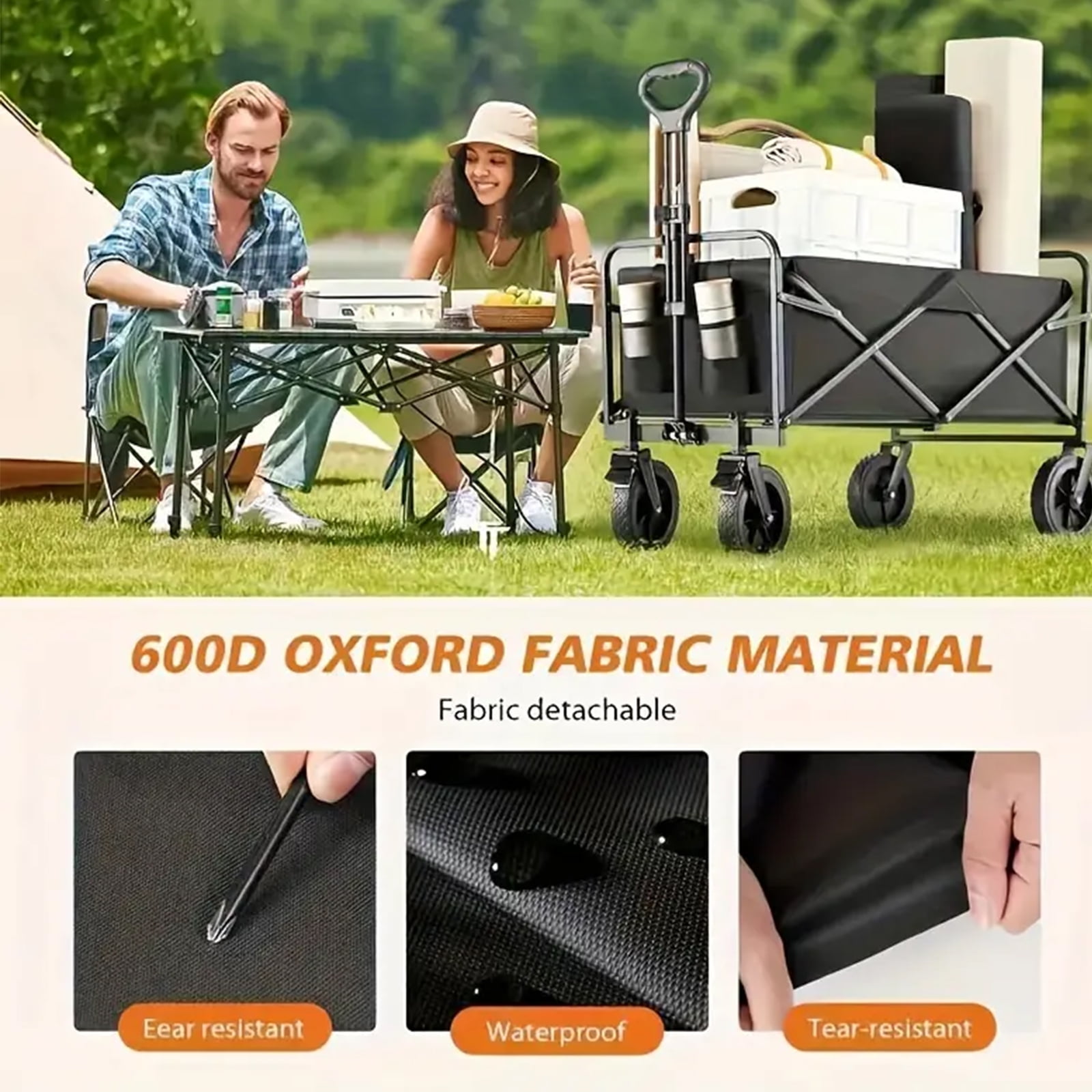 Durable Fabric: Crafted from heavy-duty 600D polyester that’s tear-resistant and fade-resistant for long-lasting use. Strong Steel Frame: Sturdy, foldable steel construction supports up to 440 lbs, perfect for carrying heavy gear. Quick Setup: No assembly required—sets up and folds down in seconds for convenient storage and transport. Versatile Use: Ideal for sporting events, beach trips, camping, concerts, park outings, or everyday use around the home.