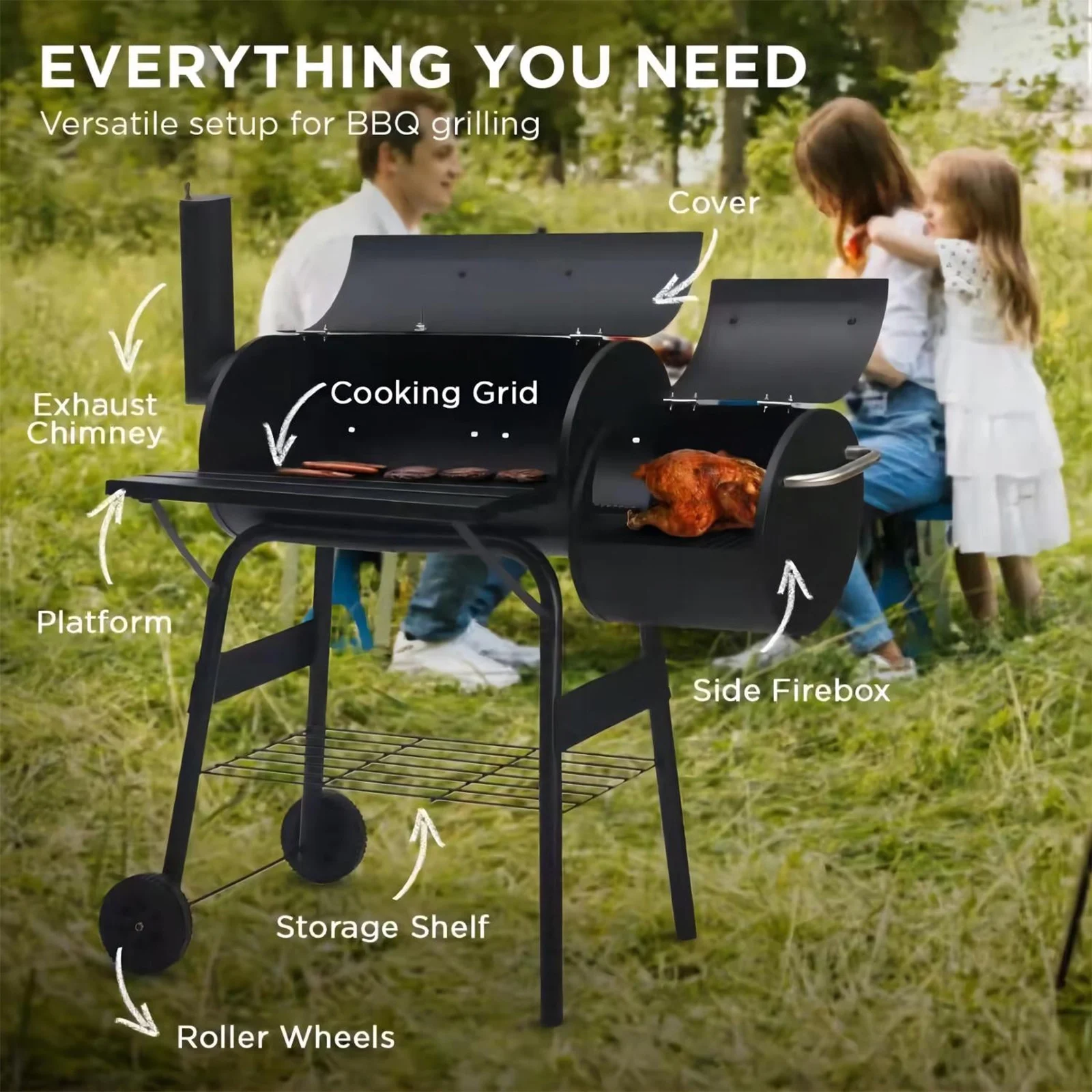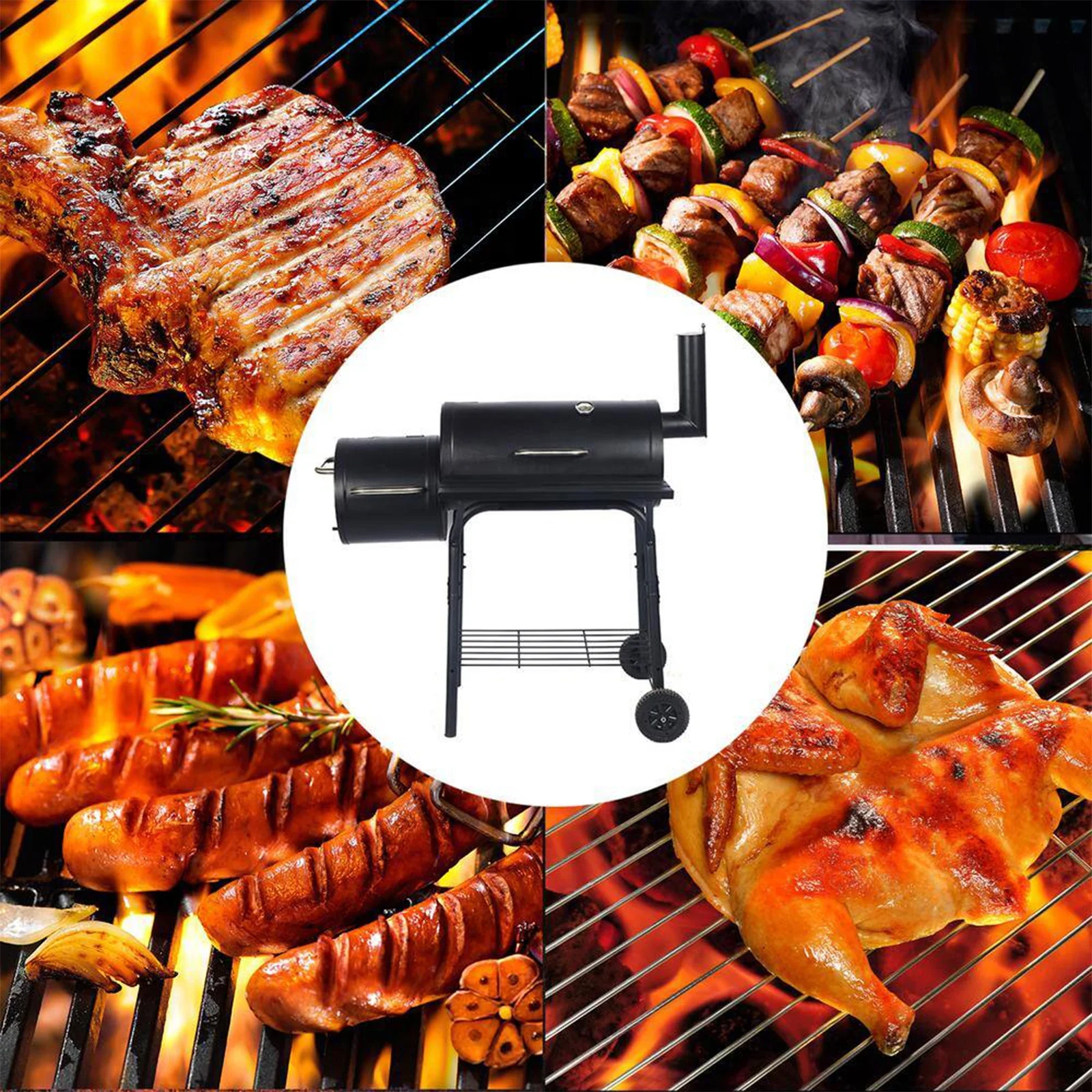 Unlock the ultimate outdoor cooking experience with our sleek, portable BBQ grill, perfectly tailored for the charcoal enthusiast. Whether it’s tailgating, camping, or enjoying a quiet evening on a small patio, our grill’s compact design lets you savor the distinct taste of charcoal-grilled food anywhere you go.Elevate your grilling game and make every cookout a highlight. Choose our portable charcoal grill for durability, convenience, and a superior grilling experience. Features 【Space-Saving Design】Maximize your outdoor area with our grill’s compact structure. The side and front wood shelves offer convenient access to cooking tools and ingredients, making it perfect for small patios or balconies. Enjoy hassle-free grilling wherever your adventures take you. 【Durability for the Outdoors】Our grill is built with high-quality, rust-resistant coated steel, ensuring longevity and reliability for years to come. This durable grill stands up to the elements, making it an essential for all your outdoor cooking needs. 【Efficient Cooking Performance】Experience quick heating and controlled smoking with our advanced grill design. The integrated steel firebox minimizes smoke and distributes heat evenly, ensuring every meal is cooked to perfection. 【Portable Grill】Easily move your grill to the perfect outdoor spot with its sturdy wheels. Designed for convenience, it includes a bottom shelf for additional storage, making it ideal for any patio or garden setting. 【Complete with Protective Cover】Each grill comes with a custom-fit grill cover, protecting your investment from the elements and keeping it clean and ready for the next cookout. Specifications Material: Premium Steel Main Chamber & Side Smoker Diameter: 30 cm / 11.8 inches Side Smoker: 11.8 x 11.4 inches (30 x 29 cm) Shelf Area: 24 x 8.5 inches (61.5 x 21.59 cm) Thickness: 0.6 mm Package Includes: 1 Charcoal Grill 1 User Manual 1 Grill Cover