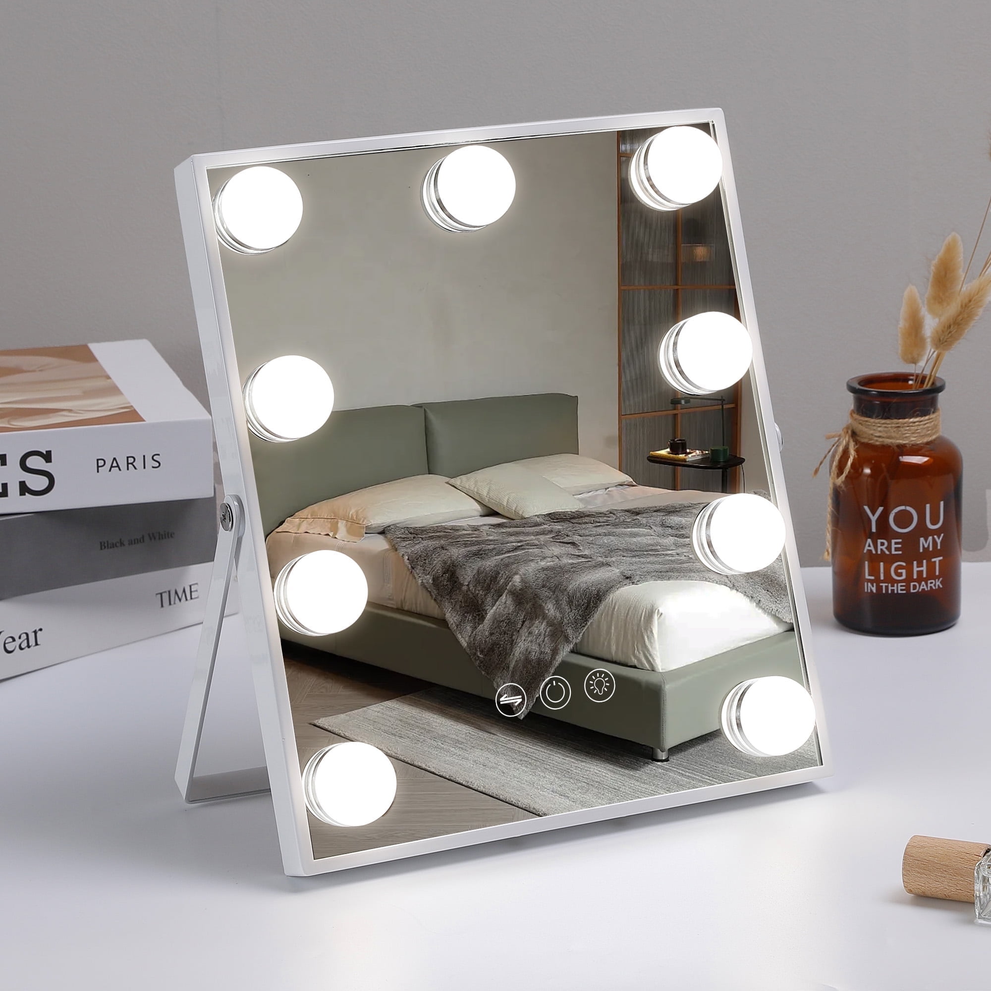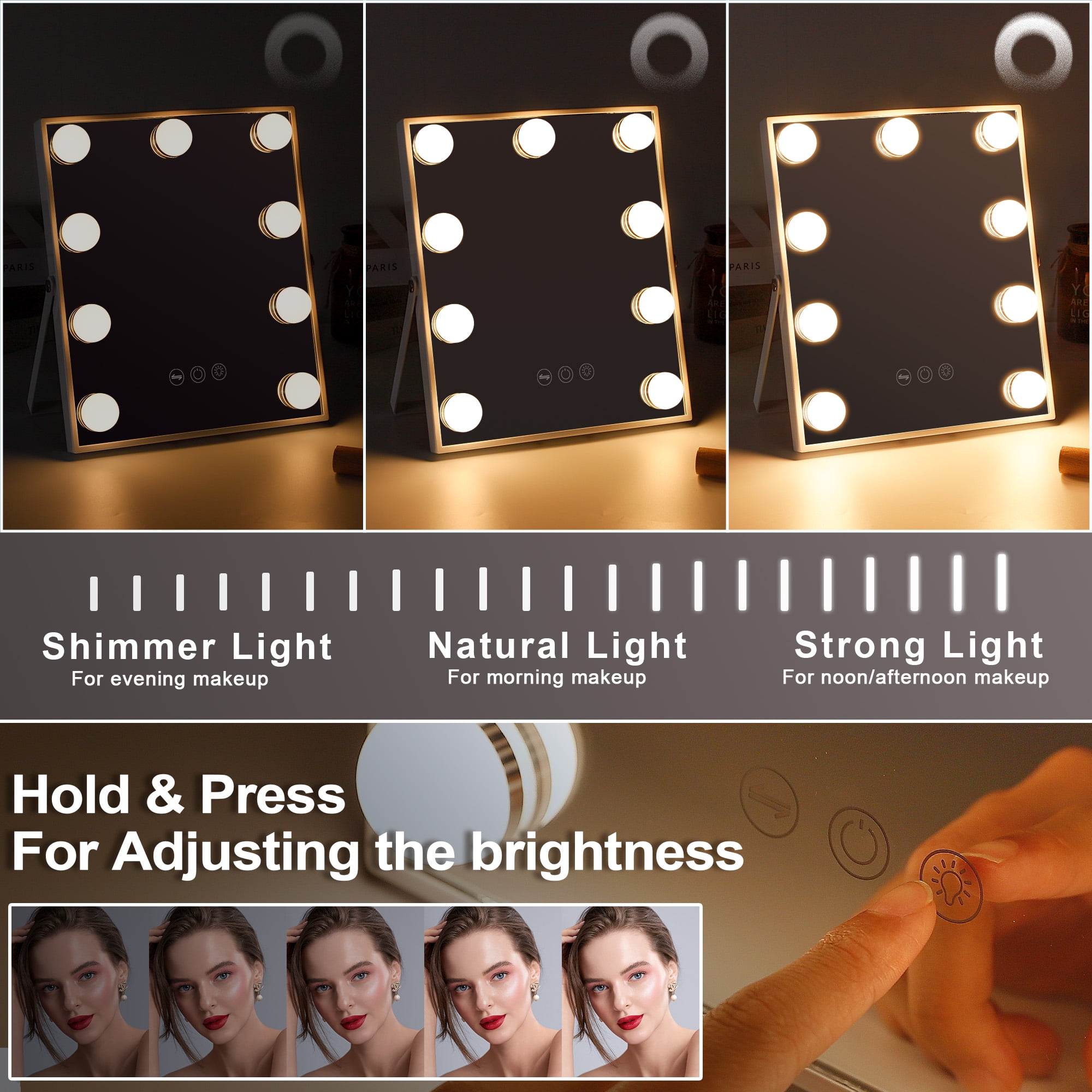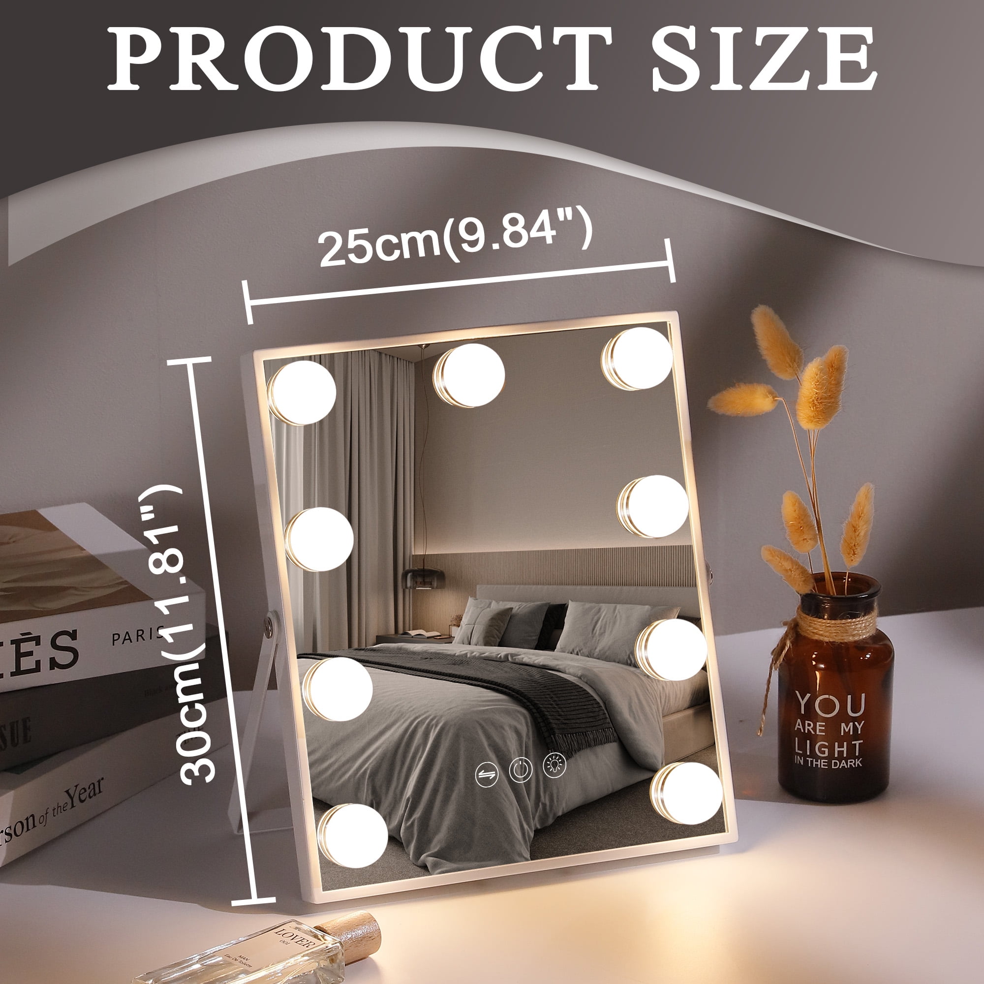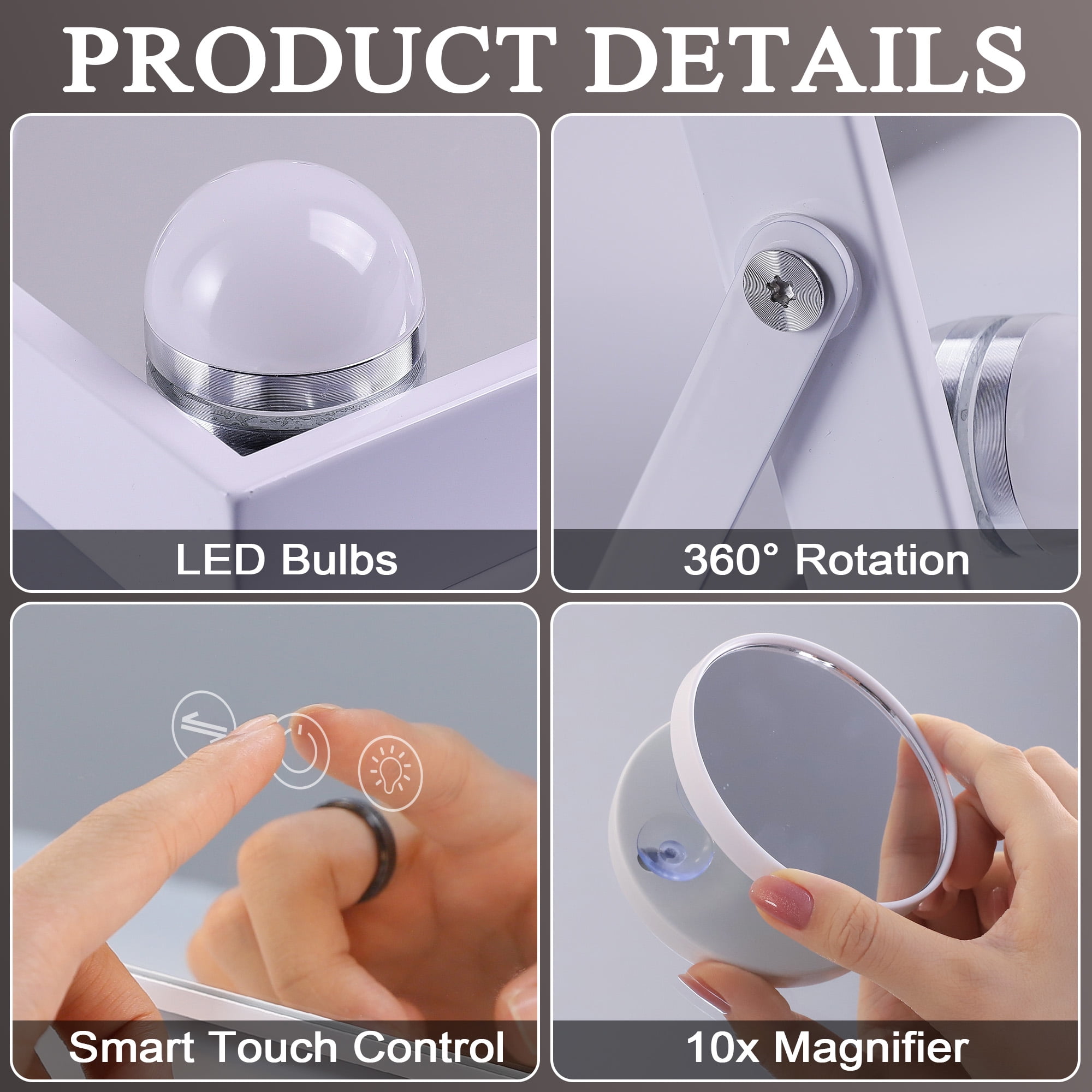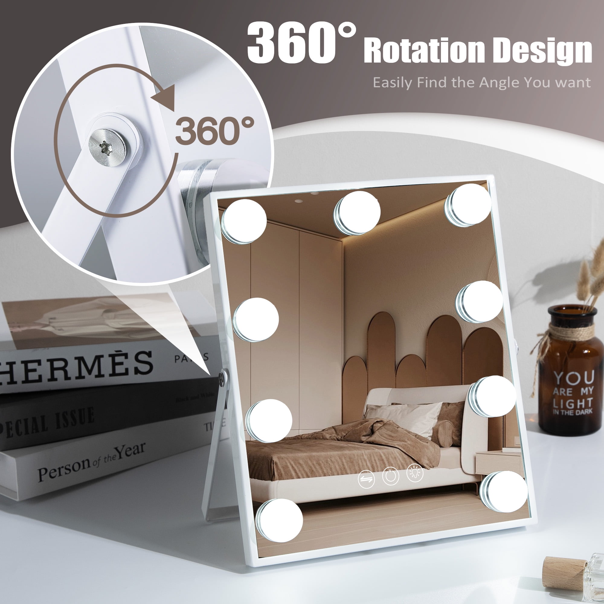 360° Free Rotation Adjust the mirror to any angle with full 360° rotation, ensuring the best lighting and viewing position from every perspective. Perfect Size & Easy Assembly At 9.84” x 11.81”, this mirror is compact, fitting perfectly on any vanity. Quick assembly makes it hassle-free to set up and use. 10X Magnification for Precision Includes a detachable 10X magnification mini mirror, perfect for detailed makeup, eyebrow shaping, and skincare. Adjustable Brightness & 3 Light Settings Choose from cool, warm, or natural light, with adjustable brightness for perfect illumination in any setting. A Thoughtful Gift for Makeup Lovers An ideal holiday or birthday gift for daughters, granddaughters, and loved ones, combining elegance and practicality.