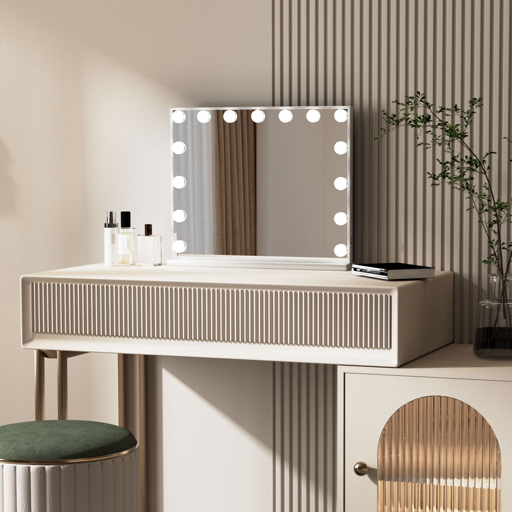 Large Size & 15 LED Bulbs 22.8″ x 18.1″, a great size and perfect for vanity and makeup. And this Hollywood Vanity Mirror comes with 15 dimmable LED bulbs. USB Charging Port The USB port on the right side allows you to charge your phone or other USB devices. Adjustable Brightness & 3 Light Settings There are 3 different light settings for you to choose for your makeup with the ability to dim and brighten each setting: warm light, day light and cold light. 10x Magnification Mirror There is a mini 10x magnification mirror included for you doing makeup. Detachable Mirror Base & Wall-Mounted Option With a detachable base and 2 holes on the back for nails, you can either place the Vanity Mirror on tabletop or on wall. Best Gift for Makeup Lovers It is one of the best gifts to give out on Thanksgiving Day and Christmas. Pick it for your girlfriend, daughter or mother.