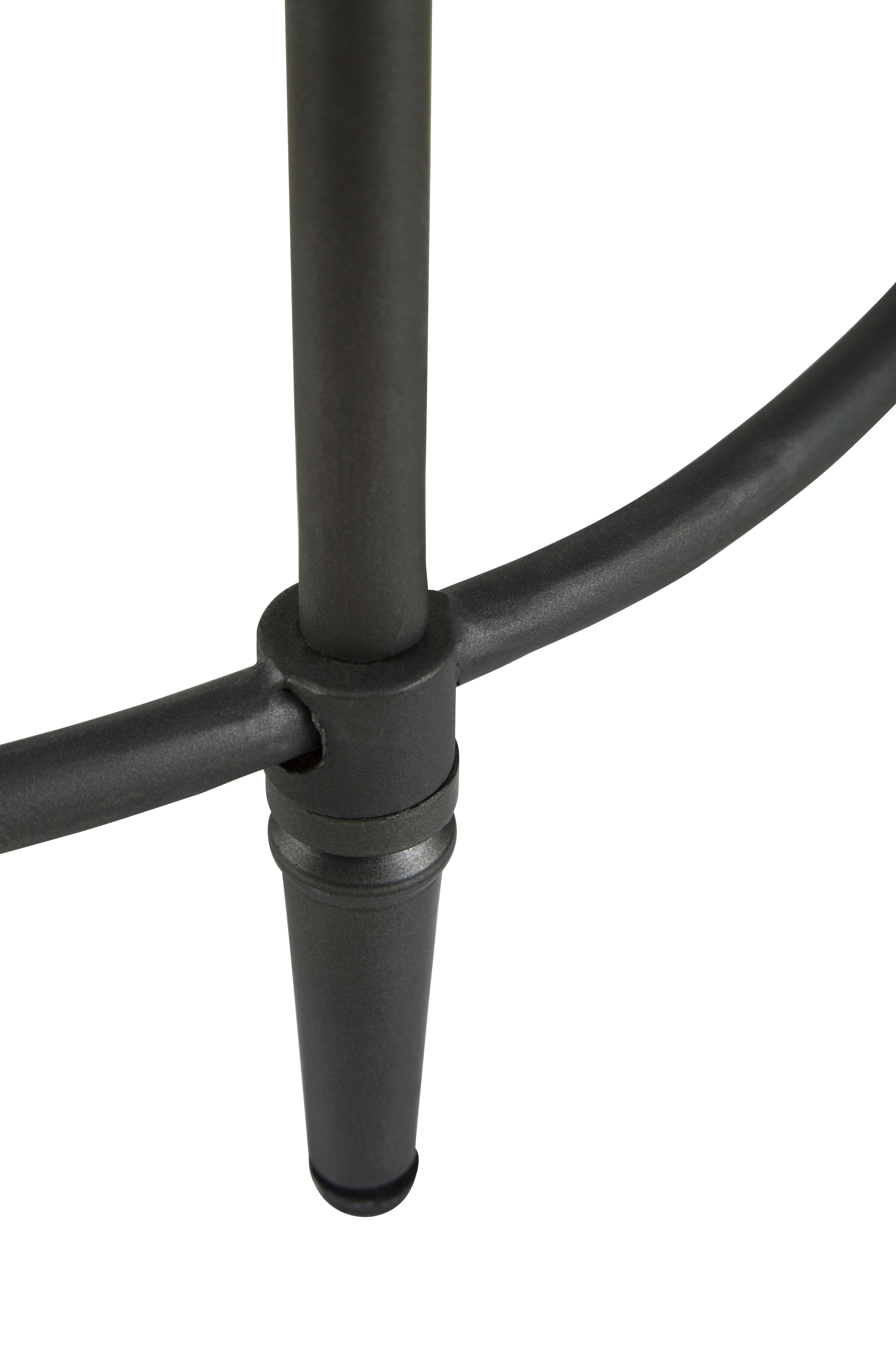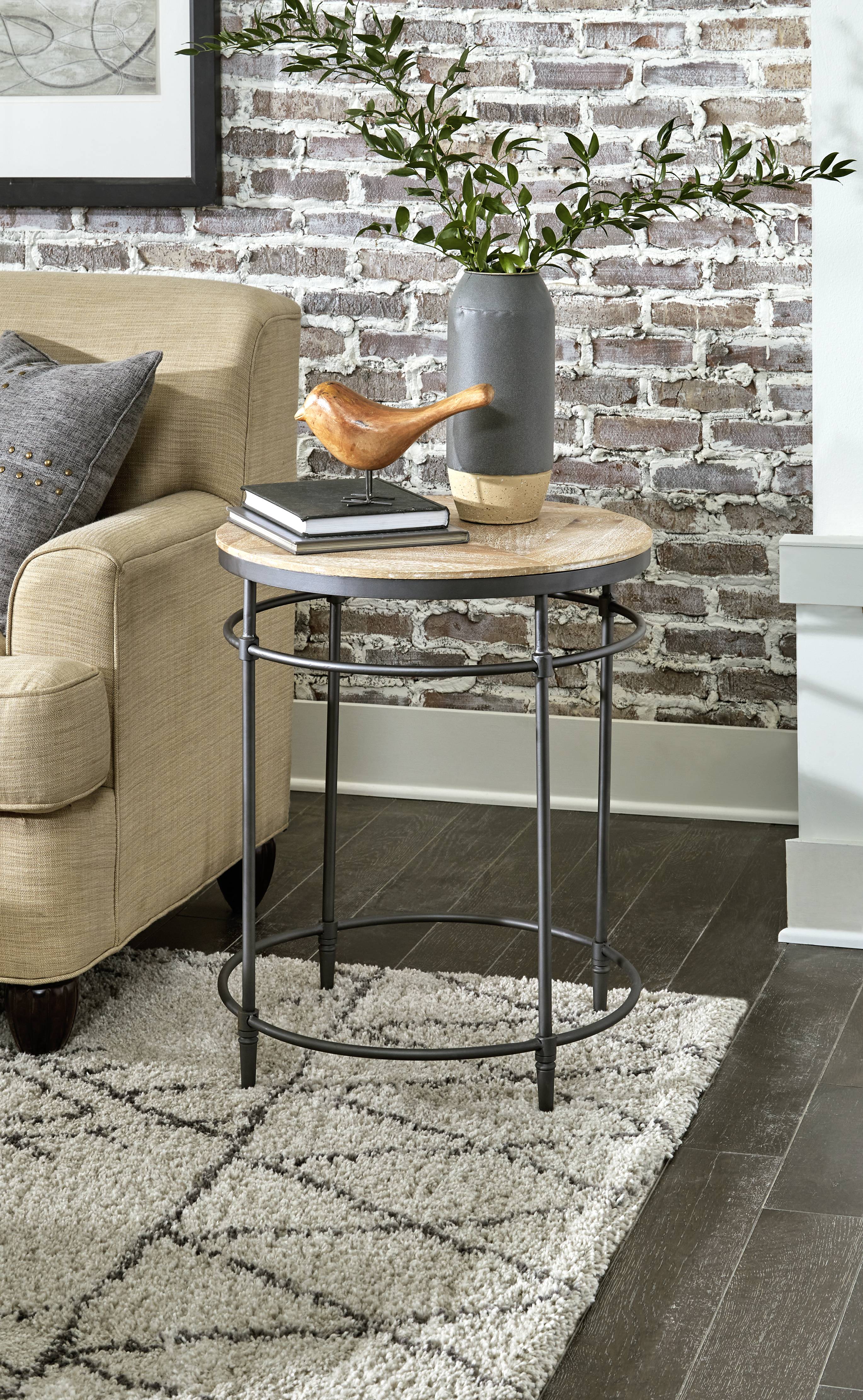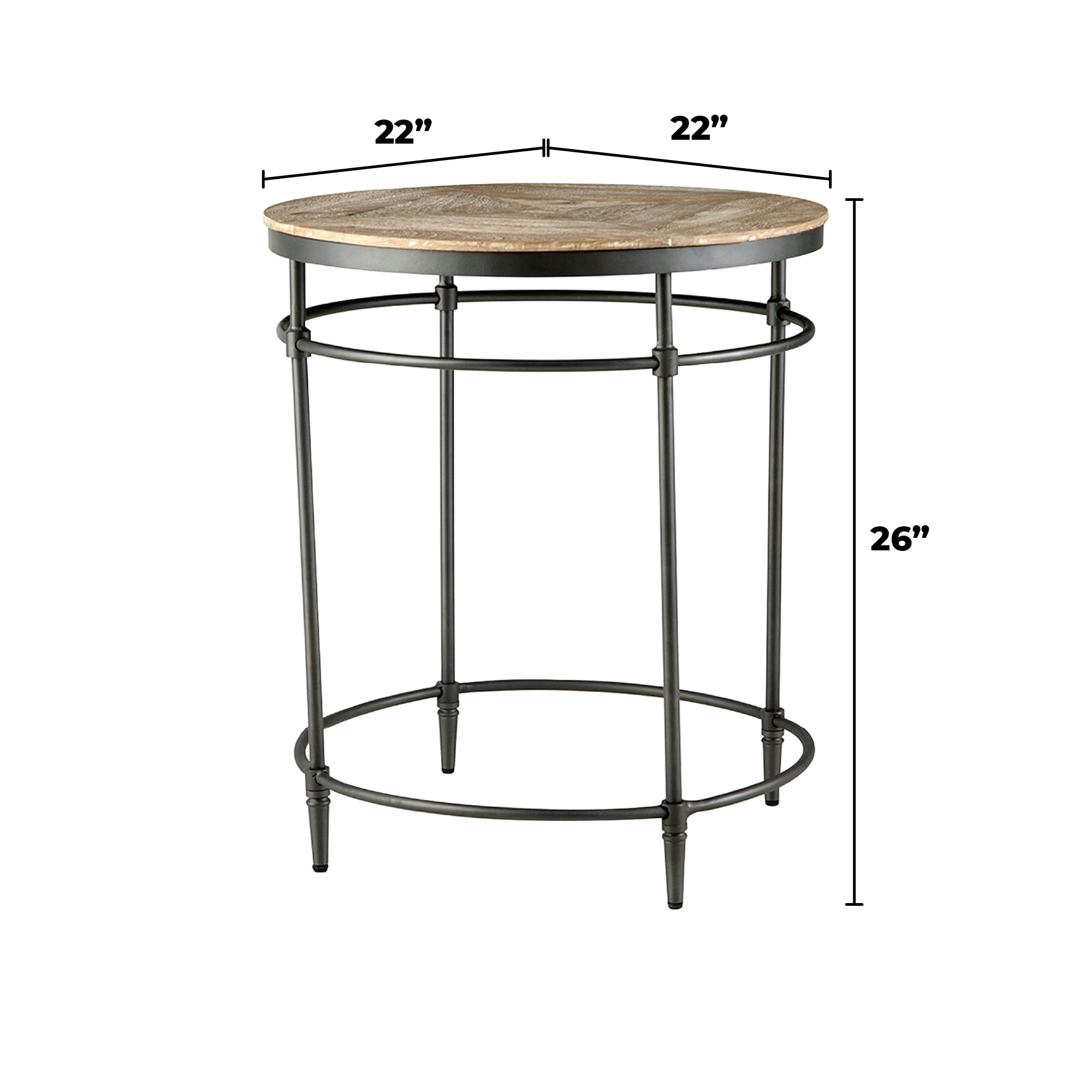 Lightly sand-blasted, pickled finish and gunmetal legs will complement any home décor; The round shape will enhance any room and add balance to your space; Ideal for placement beside a sofa or chair. It may also be used as a nightstand. Constructed of solid mango and steel for stability and long-lasting durability; Assembled product dimensions: 22” W x 22” D x 25” H; Steel legs ensure durability Easy, no tools assemble
