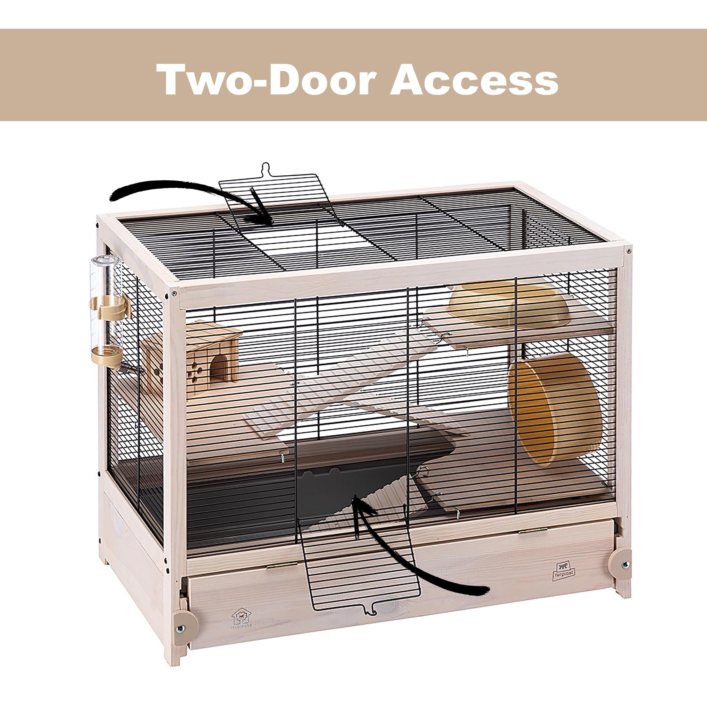 Beautiful Natural Wood Hamster Cage | Unique hamster cage is made with all natural, sustainable, liquid resistant wood & a robust wire net structure; Hamster Cage Includes All Accessories | Hamsterville comes equipped with a plastic 5.5″ exercise wheel, .04-gallon plastic water bottle, plastic food dish, hamster hide-out, 3 wood platforms & ladders; Easy Maintenance Wood Hamster Cage | A 2.6″ deep plastic base contains bedding & can be removed to dump litter / etc. for routine cleaning, other plastic accessories & wire top can be cleaned with a mild, hamster-safe detergent, removable plastic base measures 22.75L x 12.25W x 2.6H inches; Convenient Front & Top Door Access | Simply lift the top door to gain access to your hamster & the accessories for cleaning or food / water refills; Ferplast Quality Guarantee | Hamsterville wood hamster cage includes a 1- Year Manufacturer’s Warranty on all parts