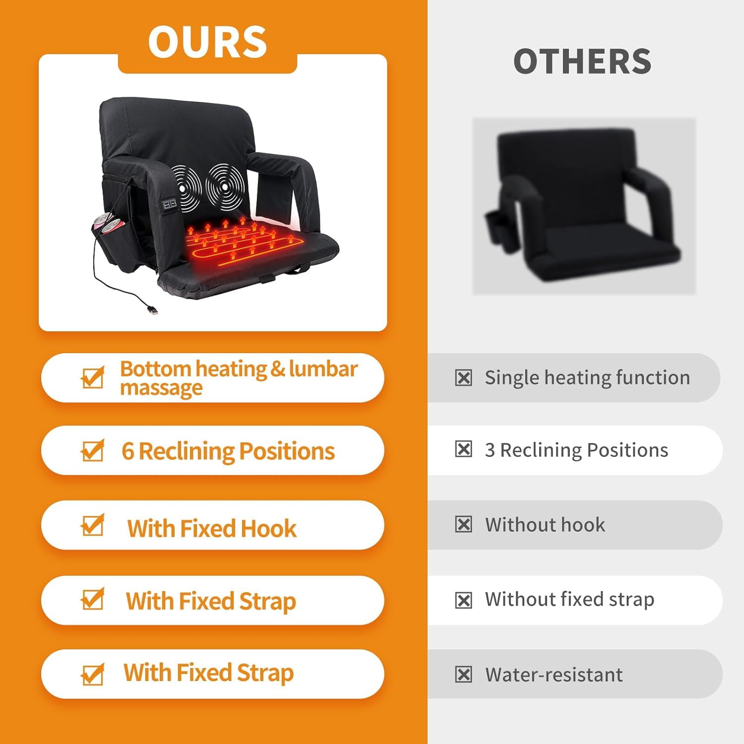 【✅6 Reclining Positions】The heated bleacher seats can avoid the muscle soreness caused by sitting for a long time, you can focus more on your game or performance. The heated stadium chair has 6 reclining options, you can choose the most comfortable position to enjoy your happy time.