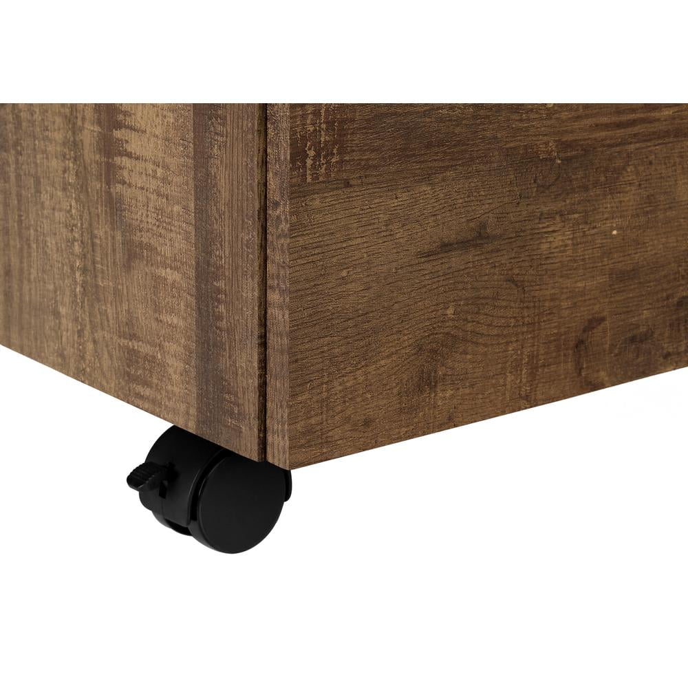 Complete your workstation with this compact and functional mobile file cabinet with a magnificent brown wood-look finish. Easy on the eyes, it can be placed anywhere thanks to 5 casters (2 locking) to complete your collection with matching office desks (sold separately). Also useful as a printer stand, this filing cabinet is there for you to help you reach your potential no matter the task at hand. Two convenient letter sized drawers easily accommodate files, papers, letters or books, while the third and bottom drawer handles legal sized documents so that you have multiple convenient storage options. Accented with simple modern black handles, this unit has no lack of style. Features: Finish: Brown Material: Particle Board, Hollow-Core, Laminate, MDF, Plastic Trendy finished reclaimed wood-look on all sides with stylish black plastic drawer pulls 3 spacious storage drawers on metal glides Includes 5 castors for ease of mobility (2 locking, 3 non-locking) Bottom drawer fits standard and legal size hanging folders Modern, industrial style suitable for any décor Specifications: Product Dimensions: 25.25″ H x 18.25″ W x 17.75″ D Product Weight: 44 lbs