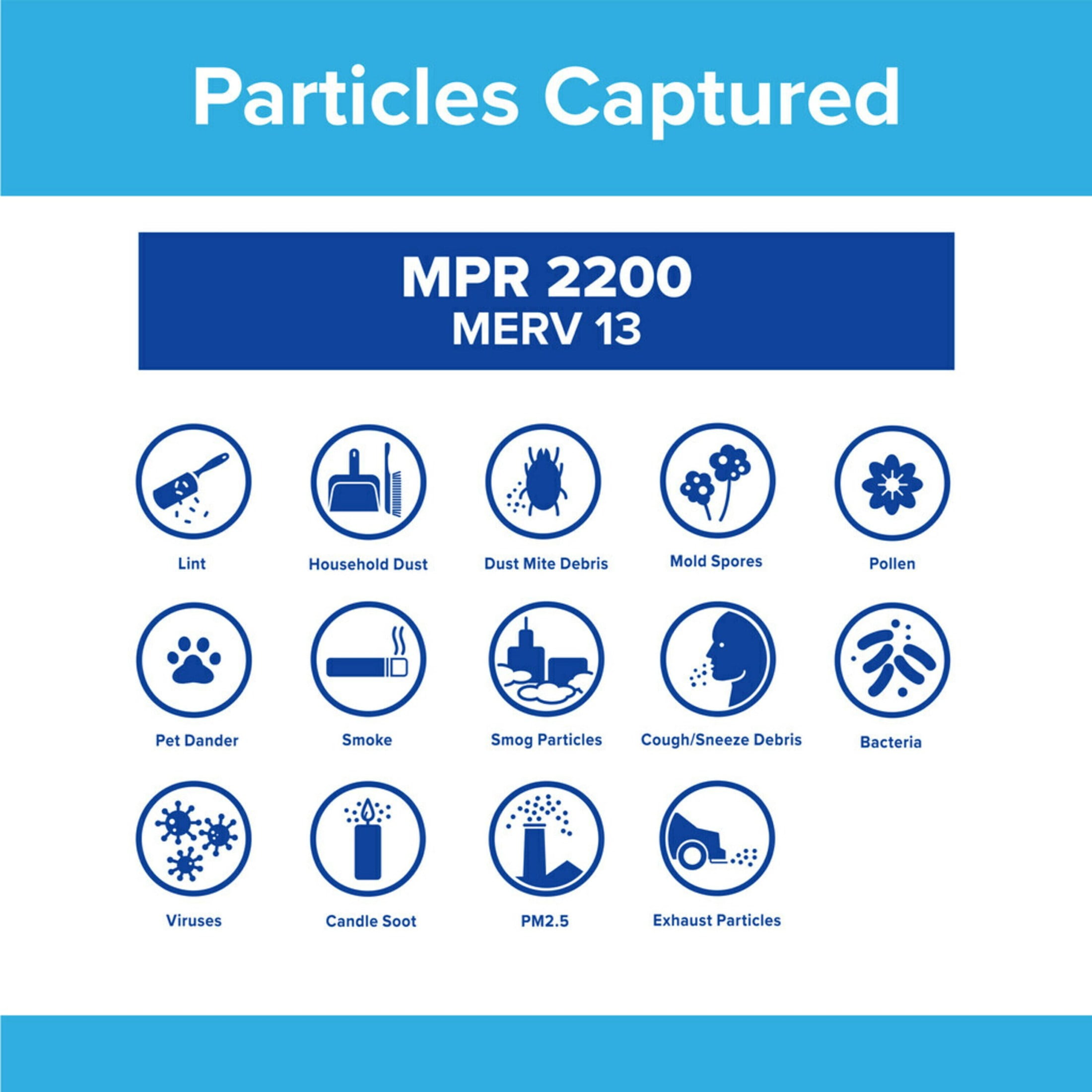 Not sure which Filtrete device or filter to buy? Click here to view our help guide. Not sure which Filtrete Filter to buy? Click here to view our help guide. Filtrete 12x24x1 MPR 2200 Air Filter, made by 3M, helps capture unwanted particles from your household air to contribute to a cleaner, fresher home environment. Designed with exclusive Filtrete 3-in-1 technology, including a high MPR 2200 and MERV 13 rating, your AC filter will help pull and capture countless microparticles – such as pet dander, smoke, bacteria and viruses – while letting cleaner air flow through. This air filter captures up to 69% of small particles (1) and 78% of airborne virus particles (2) to help make your air cleaner. Your Filtrete Filter will also capture large particles, including lint, pollen and household dust. This filter is CERTIFIED asthma and allergy-friendly (3). Use a 3-month pleated 1-inch home HVAC filter in your furnace, air conditioner or HVAC system. For optimal performance of your heating and cooling system or HVAC system, change your furnace filter at least every 90 days. Note: For easy replacement reminders, create a change countdown in the Filtrete Smart App. Simply use the app to scan the barcode on your filter’s packaging, then choose 30, 60 or 90 days for your replacement countdown. When the filter’s life is up, you’ll get a notification to change your filter. The No. 1 Recommended HVAC Air Filter Brand (4), Filtrete Home Air Filters provide the breakthrough technology needed to change how we clean our air, by filtering out particles both large and invisible, to create a cleaner, healthier home for ourselves and our families. Residential use only. (1) Percent captured is based on ASHRAE 52.2 testing for 0.3 to 1 micron particles from the air passing through the filter, which relates to HVAC industry standard efficiency testing. (2) Based on airborne M2 virus testing. Initial efficiency. (3) As outlined in report ASCR: 1246-01. (4) Based on the 2022 Ipsos US Brand Health Study of Residential HVAC Air Filters.