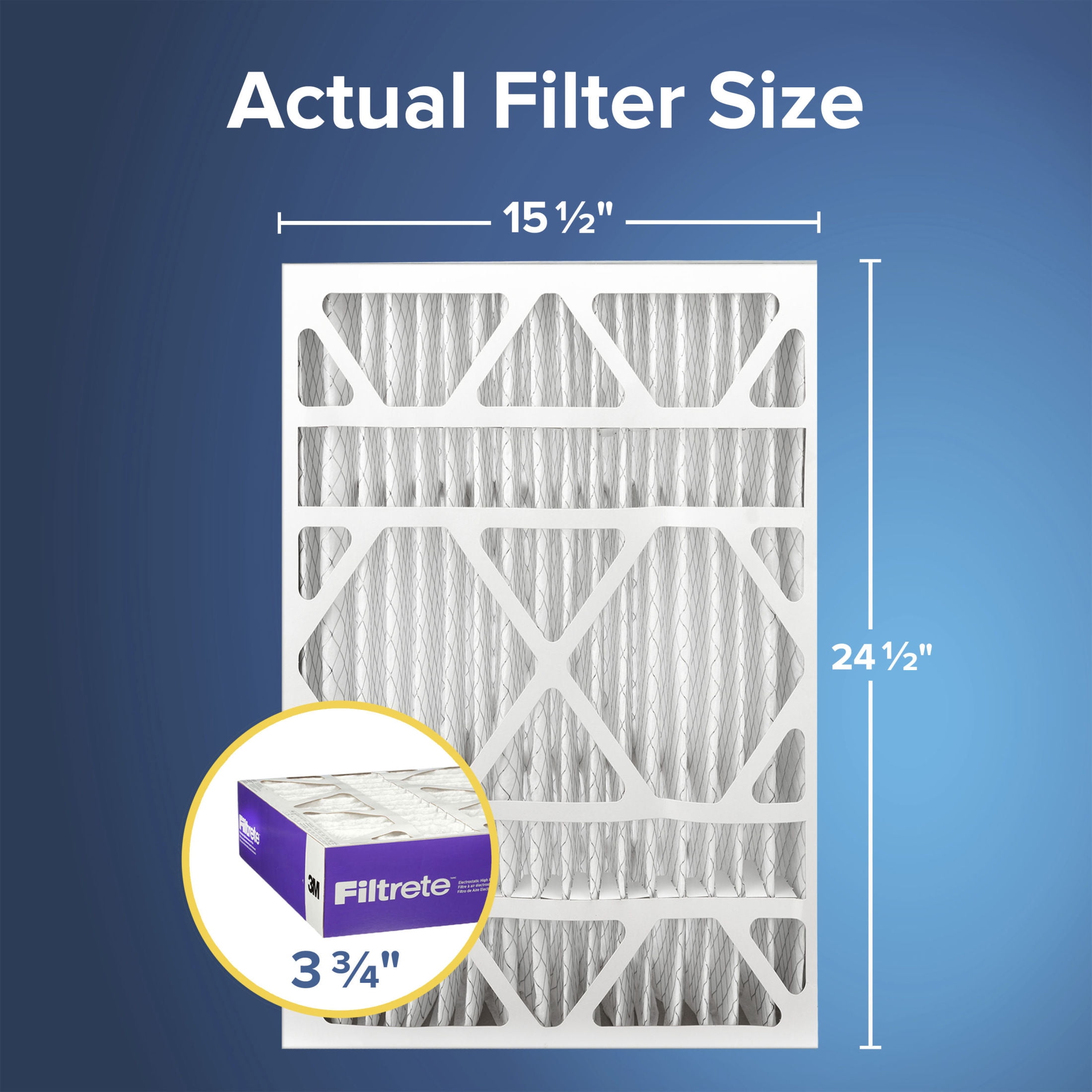 Actual Filter Size is: 15.88 in x 24.56 in x 4.31 in DESIGNED TO FIT: Carrier® brand and other 16x25x4 media air cleaners MAKE YOUR HOME YOUR SANCTUARY: The 12-month pleated Filtrete™ 16x25x4 MERV 12 MPR 1550 AC Furnace Air Filter helps capture unwanted particles from your household air to contribute to a cleaner, fresher home environment EXCLUSIVE TECHNOLOGY: Designed with exclusive Filtrete 3-in-1 technology to pull in and trap unwanted particles, allowing cleaner air to flow through COUNTLESS MICROPARTICLES: With a 1550 MPR and MERV 12 rating, as well as a 55% small particle capture rate (1), your Filtrete™ Filter will help capture many microparticles from the air passing through it CHANGE YOUR FILTER OFTEN: For optimal performance, make sure to change your filter at least once every 12 months SMART APP: Use the Filtrete™ Smart App (iOS or Android) to set 90-, 180- or 365-day reminders to change your air filter FOR RESIDENTIAL use only MOST TRUSTED: Filtrete™ Brand is North America’s most trusted brand of HVAC Filters, based on 2024 Sago US Brand Health Survey of Residential HVAC Air Filters