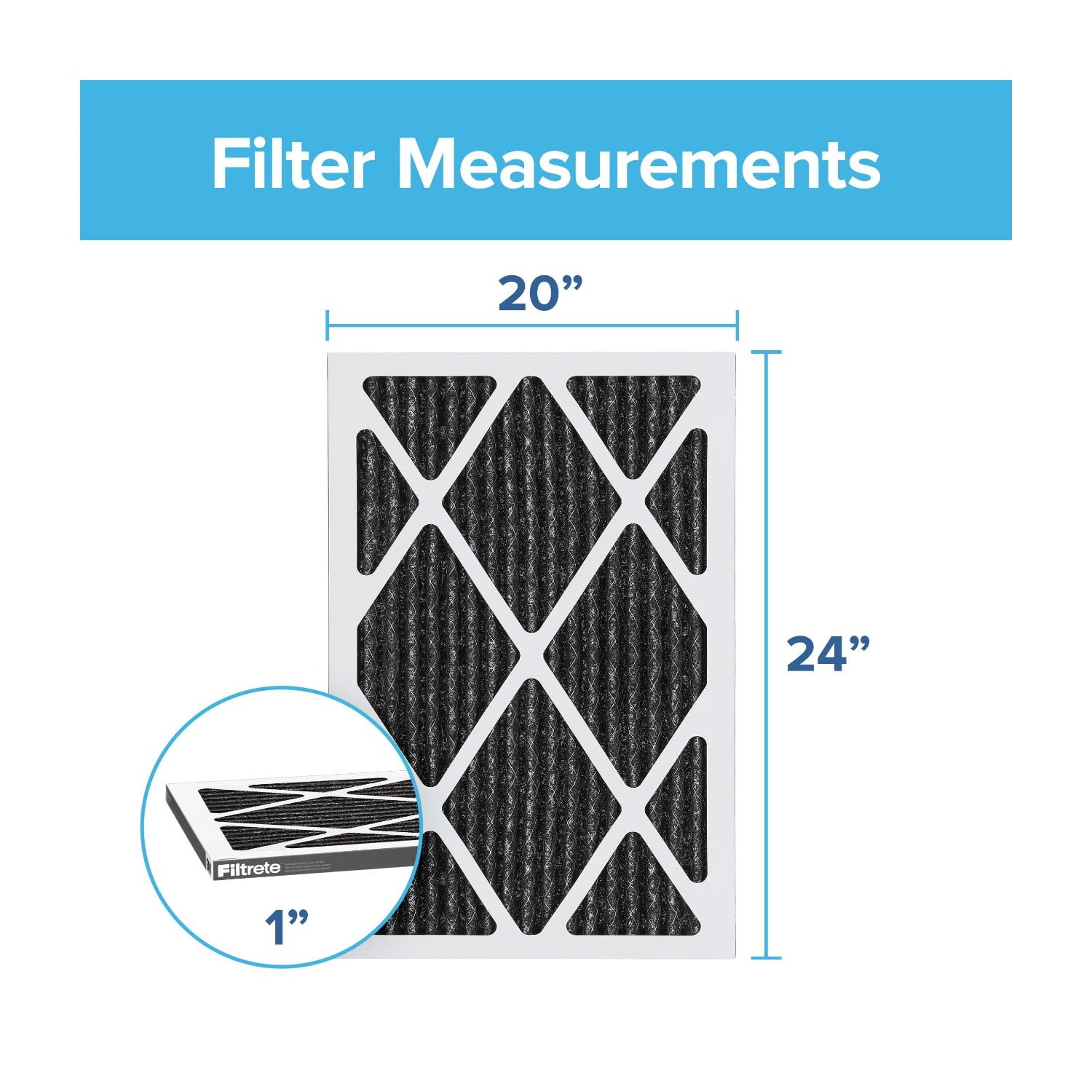 MAKE YOUR HOME YOUR SANCTUARY: 1-pack of 3-month pleated 1” Filtrete 20x24x1 MERV 11 MPR 1200 AC Furnace Air Filter helps capture unwanted particles from your household air to contribute to a cleaner, fresher home environment EXCLUSIVE TECHNOLOGY: Air filter designed with exclusive Filtrete 3-in-1 technology to pull in and trap unwanted particles, allowing cleaner air to flow through; plus a unique active carbon layer to help minimize strong odors COUNTLESS MICROPARTICLES: With a 1200 MPR and MERV 11 rating, your Filtrete Filter will help capture many microparticles and large particles from the air passing through it ACTIVE CARBON LAYER: Acts as odor eliminator for pet smells, smoke, cooking, mildew and cleaning chemicals VERSATILE USES: Works for changing the air filters in your furnace, air conditioner/heating system or HVAC system CHANGE YOUR FILTER OFTEN: For optimal performance, make sure to change your filter at least once every 90 days SMART APP: Use the Filtrete Smart App (iOS or Android) to set 30-, 60- or 90-day reminders to change your air filter