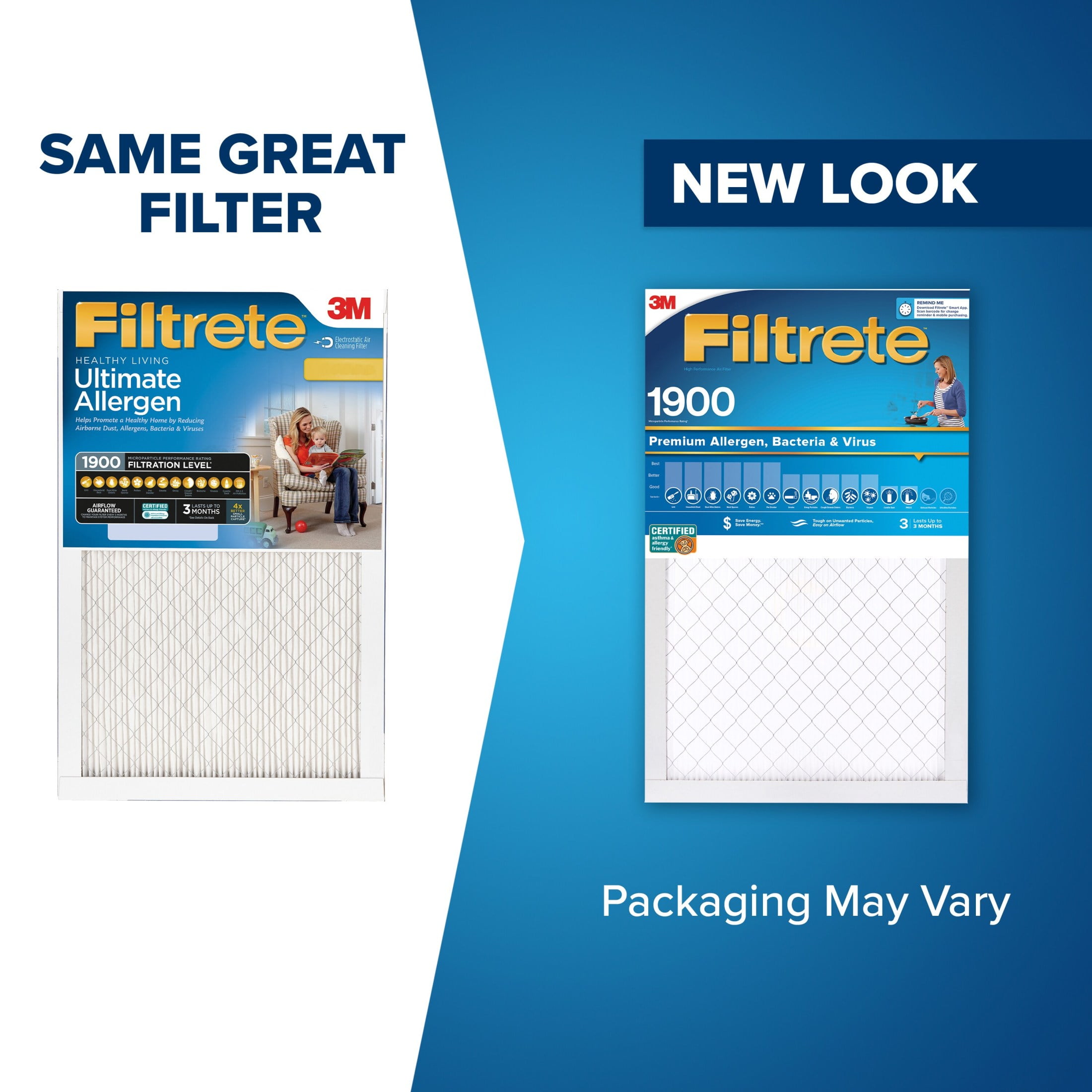 Not sure which Filtrete device or filter to buy? Click here to view our help guide. Not sure which Filtrete Filter to buy? Click here to view our help guide. Filtrete 20x25x1 MPR 1900 Air Filter, made by 3M, helps capture unwanted particles from your household air to contribute to a cleaner, fresher home environment. Designed with exclusive Filtrete 3-in-1 technology, including a high MPR 1900 and MERV 13 rating, your AC filter will help pull and capture countless microparticles – such as pet dander, smoke and smog – while letting cleaner air flow through. This air filter captures up to 62% of small particles (1), like bacteria and particles that carry viruses, to help make your air cleaner. Your Filtrete Filter will also capture large particles, including lint, pollen and household dust. This filter is CERTIFIED asthma and allergy-friendly (2). Use a 3-month pleated 1-inch home HVAC filter in your furnace, air conditioner or HVAC system. For optimal performance of your heating and cooling system or HVAC system, change your furnace filter at least every 90 days. Note: For easy replacement reminders, create a change countdown in the Filtrete Smart App. Simply use the app to scan the barcode on your filter’s packaging, then choose 30, 60 or 90 days for your replacement countdown. When the filter’s life is up, you’ll get a notification to change your filter. The No. 1 Recommended HVAC Air Filter Brand (3), Filtrete Home Air Filters provide the breakthrough technology needed to change how we clean our air, by filtering out particles both large and invisible, to create a cleaner, healthier home for ourselves and our families. Residential use only. (1) Percent captured is based on ASHRAE 52.2 testing for 0.3 to 1 micron particles from the air passing through the filter, which relates to HVAC industry standard efficiency testing. (2) As outlined in report ASCR: 1246-01. (3) Based on the 2022 Ipsos US Brand Health Study of Residential HVAC Air Filters.
