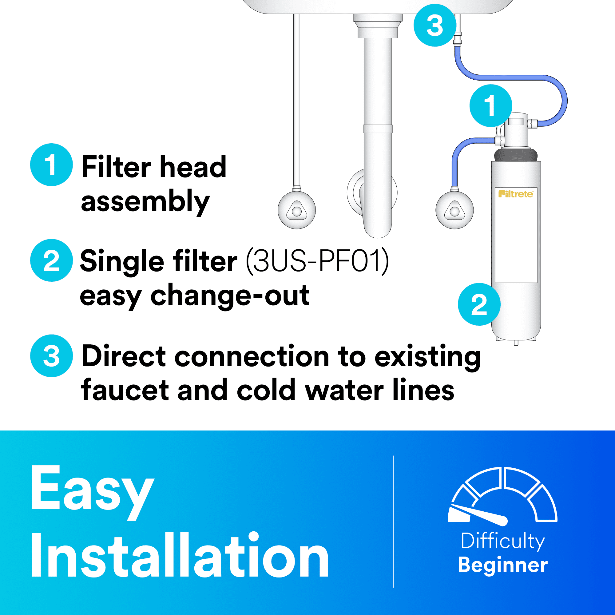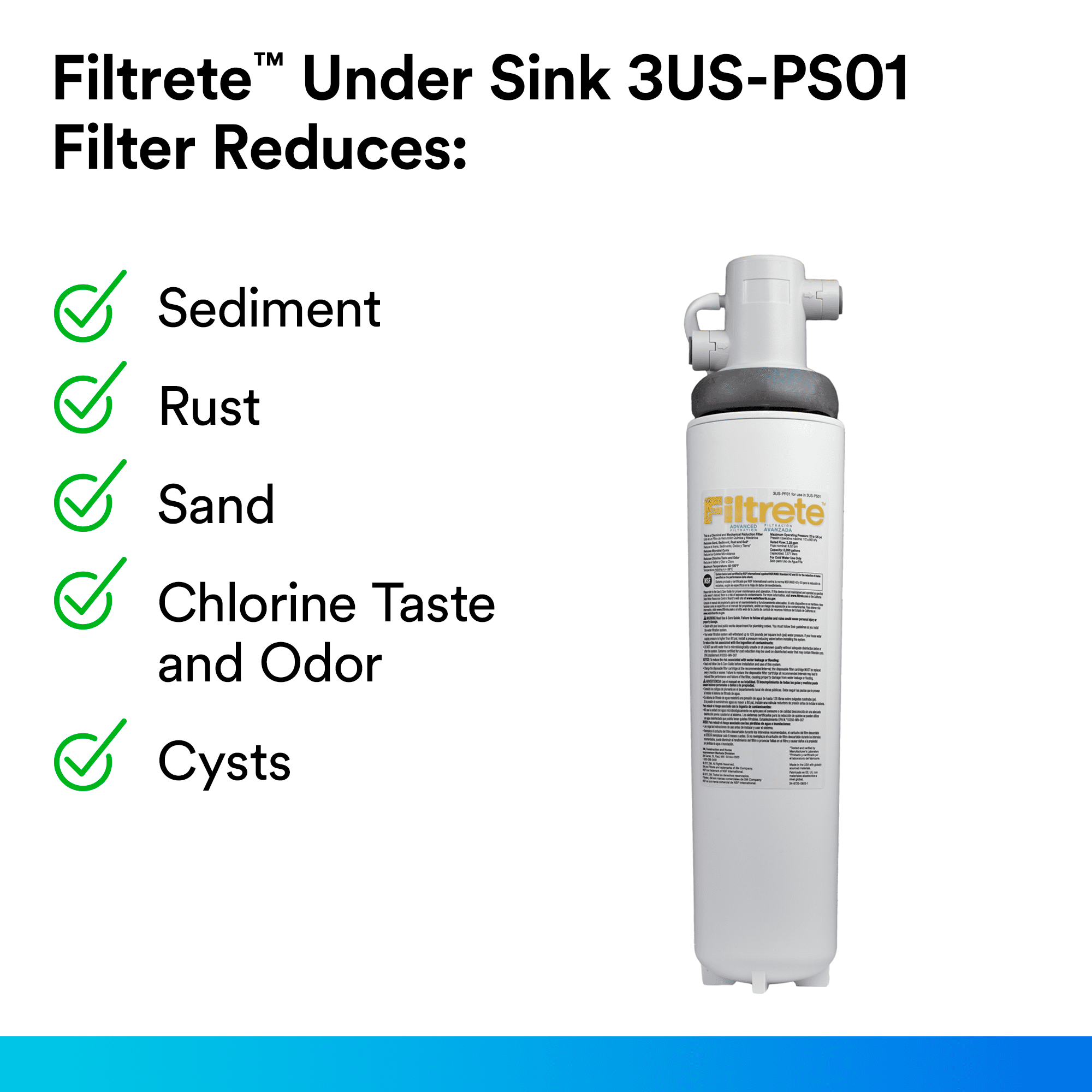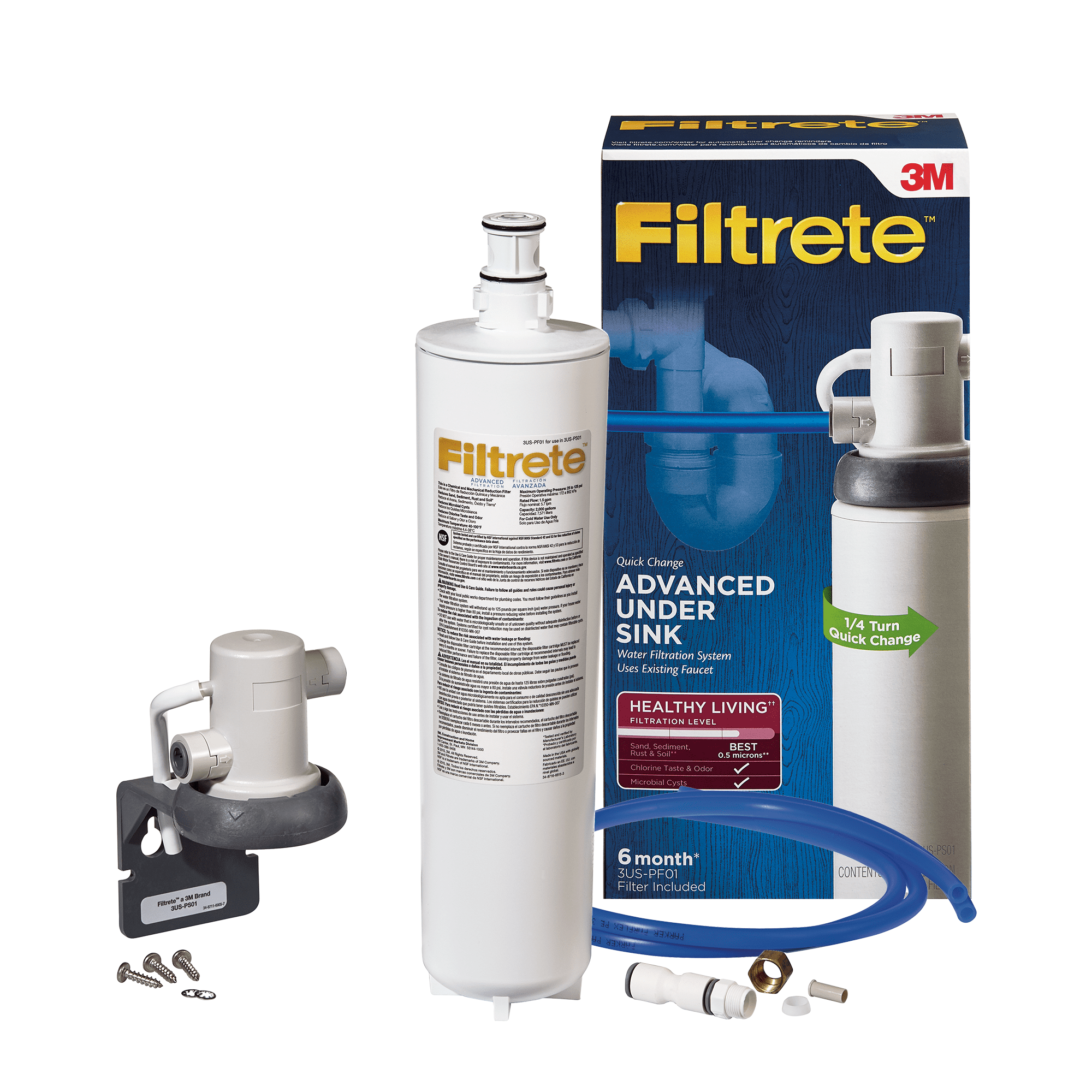 Reduces microbial cysts, chlorine taste and odor, sand, soil, silt, rust and sediment A new 3M Filtrete water filter installs in less than 30 minutes and offers a 6-month filter life This Under-Sink Filtration System maintains full water flow on your existing faucet Advanced and standard replacement filters are interchangeable with the 3US-PS01 system