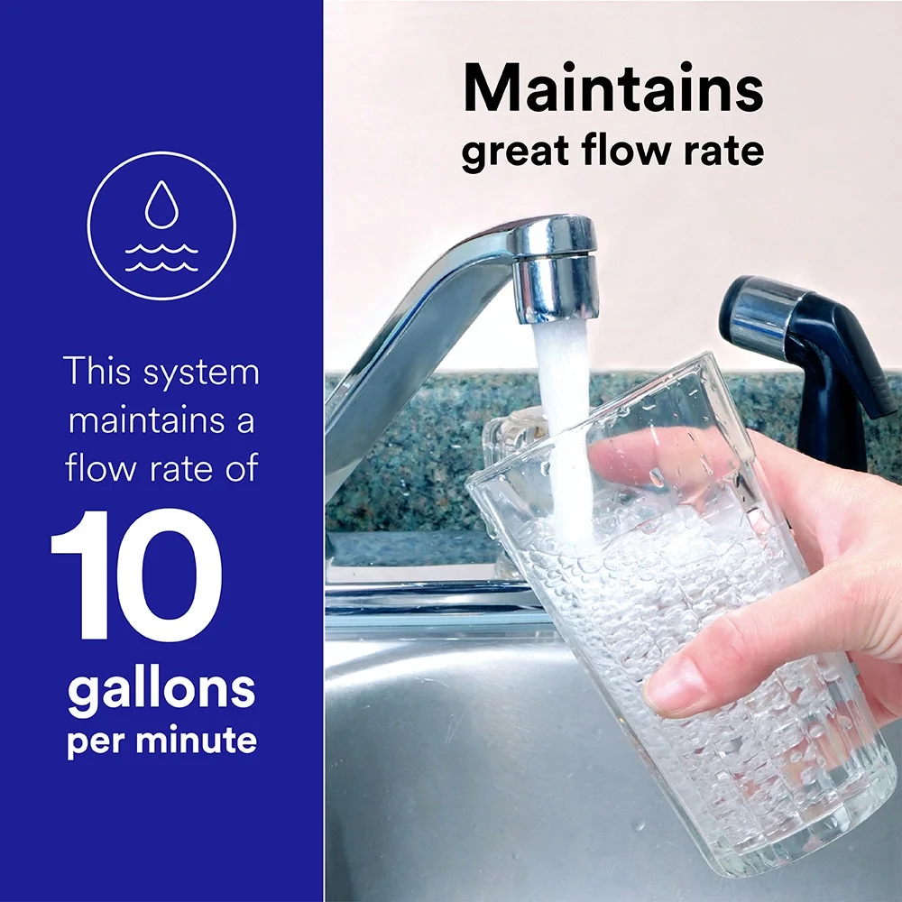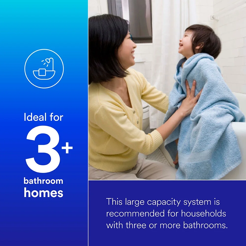 Filtrete High Performance Whole House Systems filters incoming household water for all uses including drinking, dishwasher, clothes washer, and showering. More convenient and less messy than traditional Large Capacity Whole House Sump Style Systems. Reduces chlorine taste and odor, sand, soil, silt, rust and sediment based on 3M Testing. A new system has a 12-month filter life for 4+ persons / +3-bathroom households and includes a space saving design.