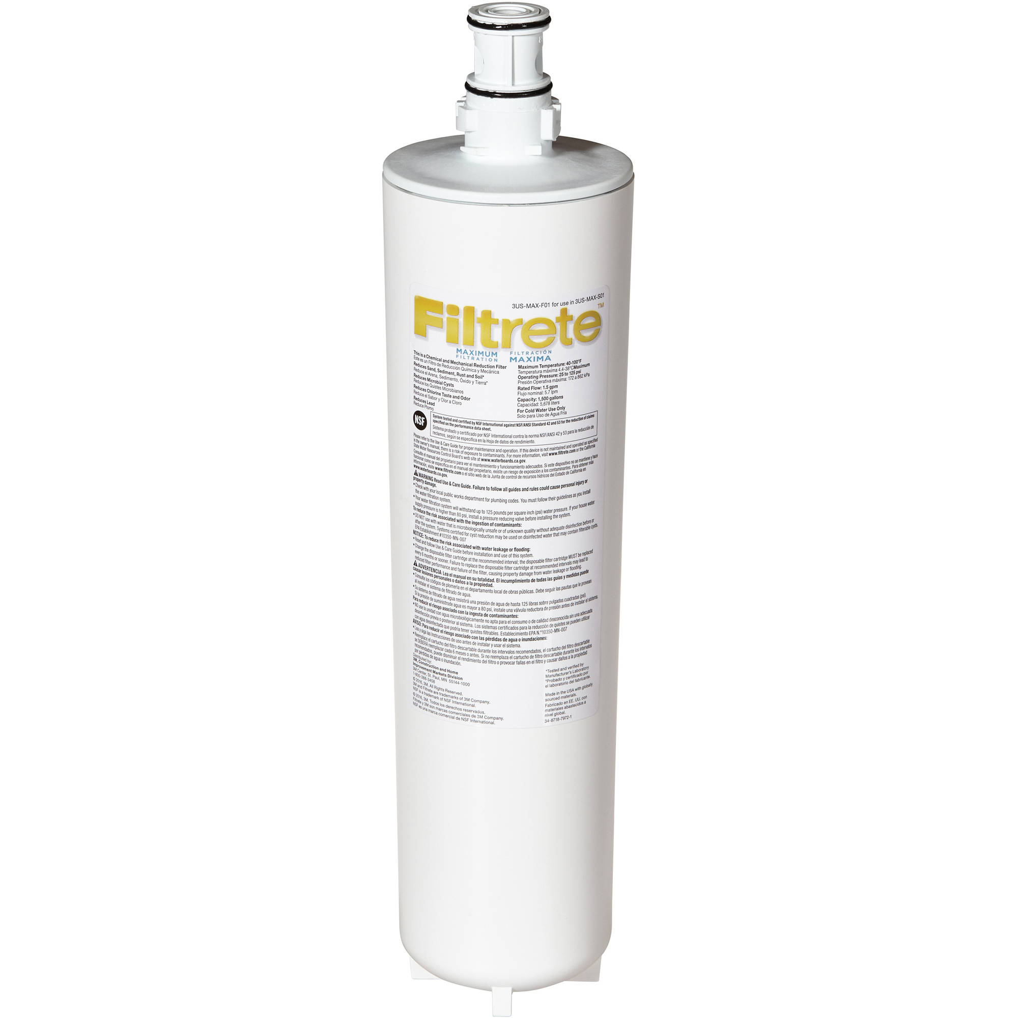 Filtrete Maximum Under-Sink Water Filtration Filter, 3US-MAX-F01: Maximum level filtration reduces 99 percent lead, 99 percent microbial cysts, 97 percent chlorine taste and odor, 0.5 microns of sand, sediment, rust and soil Tested and certified by NSF international against NSF/ANSI Standard 42 and 53 in model 3US-MAX-S01 for the reduction of the claims specified on the Performance Data Sheet Installs in less than 30 minutes and offers 6-month filter life Provides high-water flow rates at 1.5 gallons per minute Maximum, Advanced and Standard replacement filters are interchangeable with System