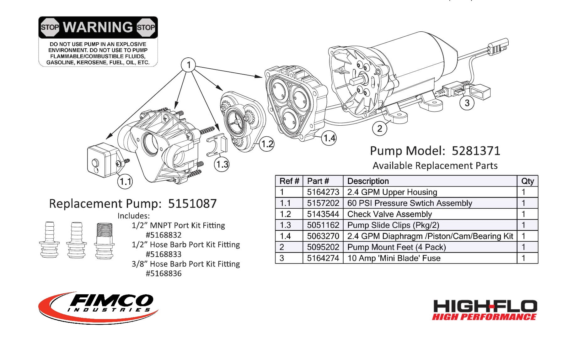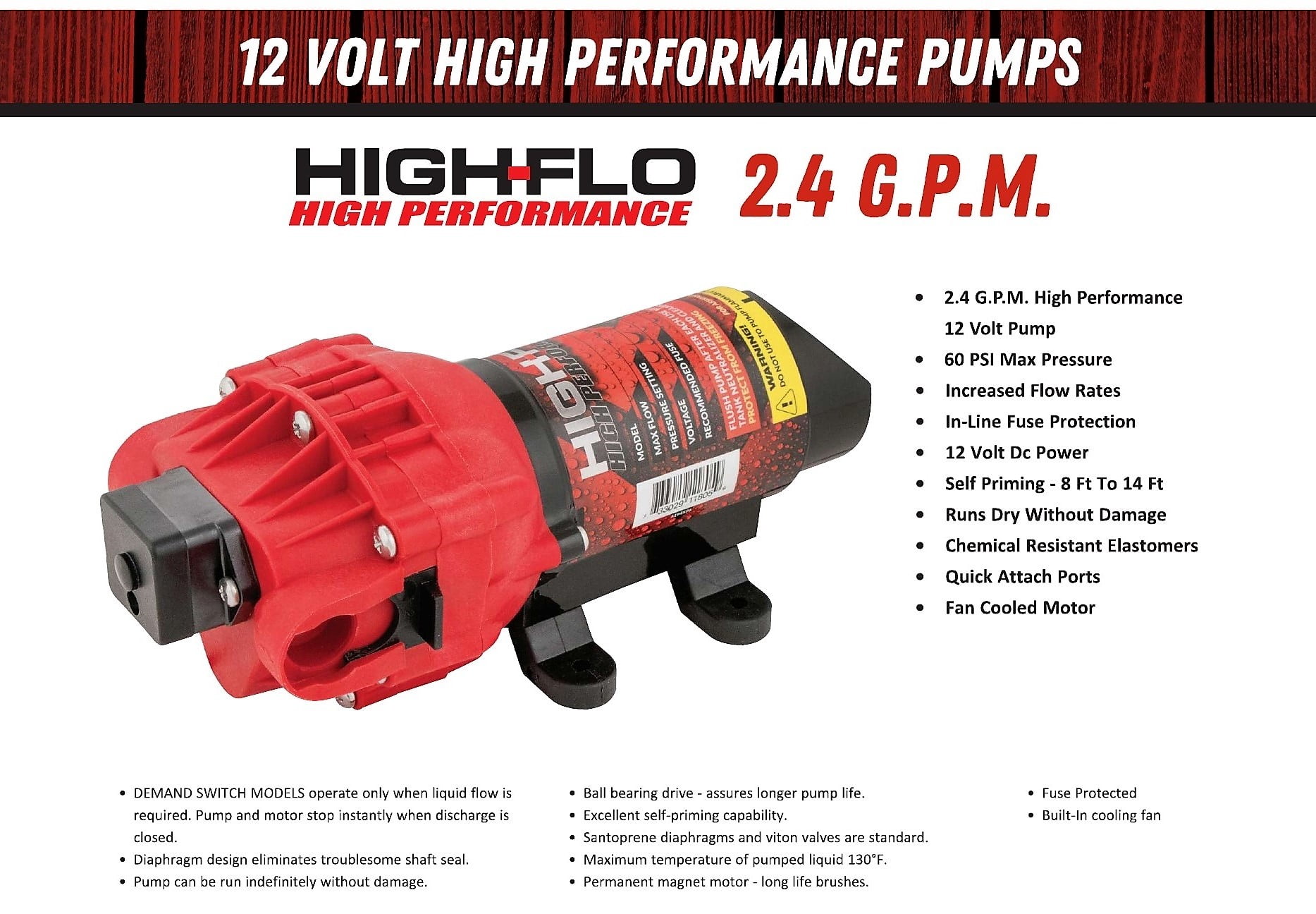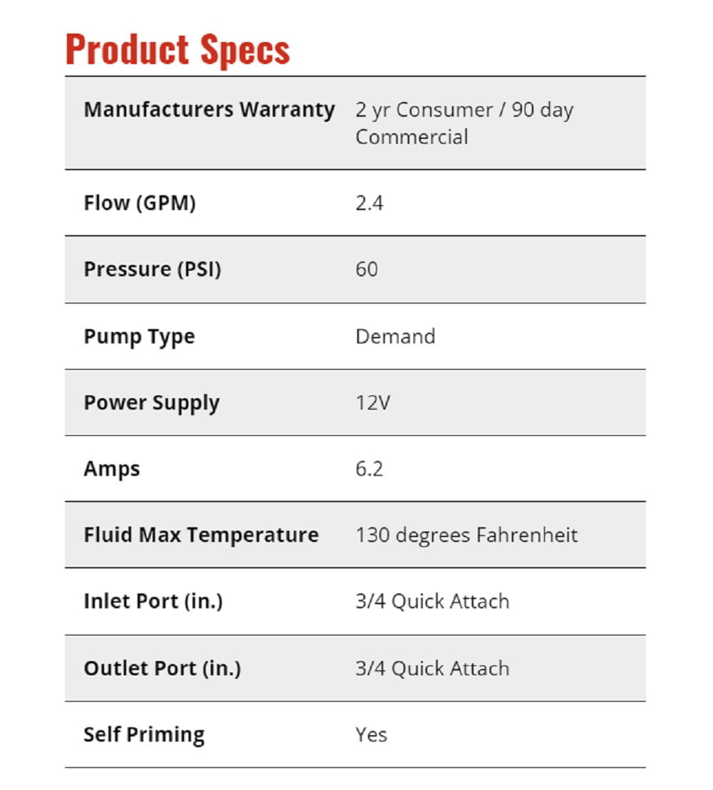 12 Volt 2.4 GPM pump can pump up to 60 PSI and features an internally fan cooled motor which delivers consistent performance under heavy load Chemically resistant elastomers provide increased flow rate delivering superior performance Built in check valves which help maintain pressure and prevent backflow Self priming increases efficiency and running dry will not damage pump or limit reliability Combined with a Best in Class 2 Year Warranty, the High Flo pump is built for years of trouble free service Replaces pump part numbers 5277981, 5275087, 5275703, 5275497, 5275016 and 5281371