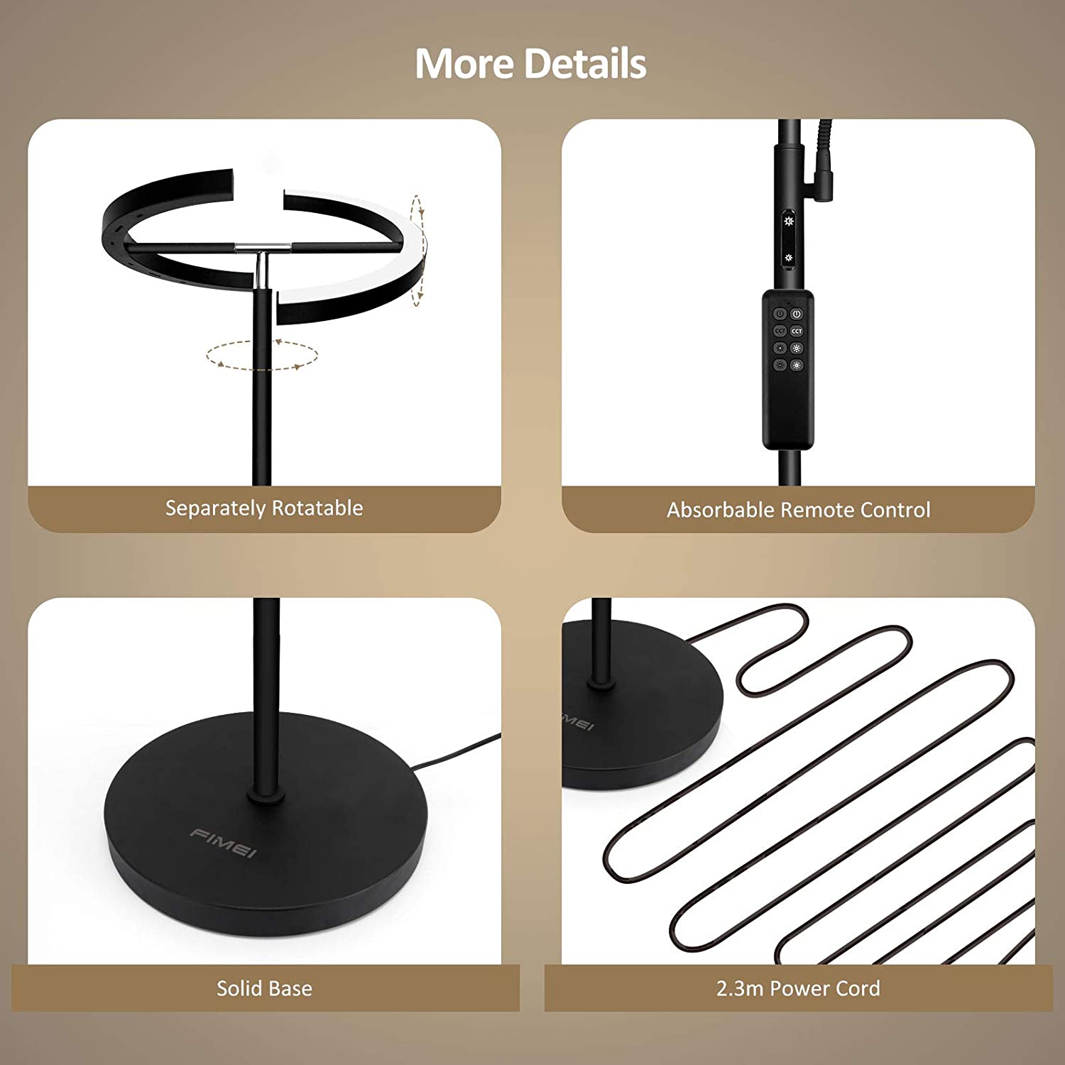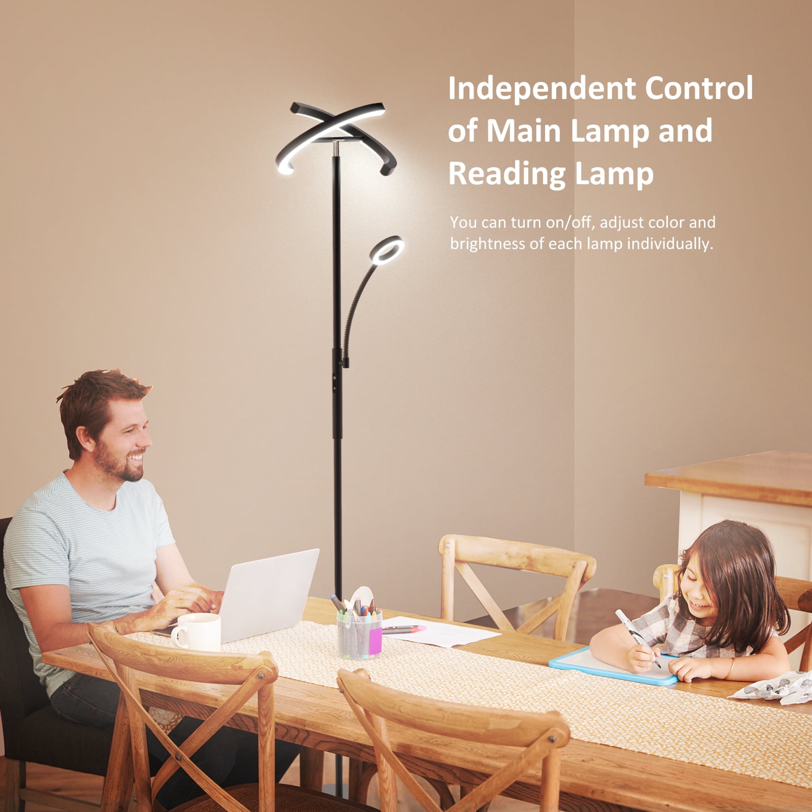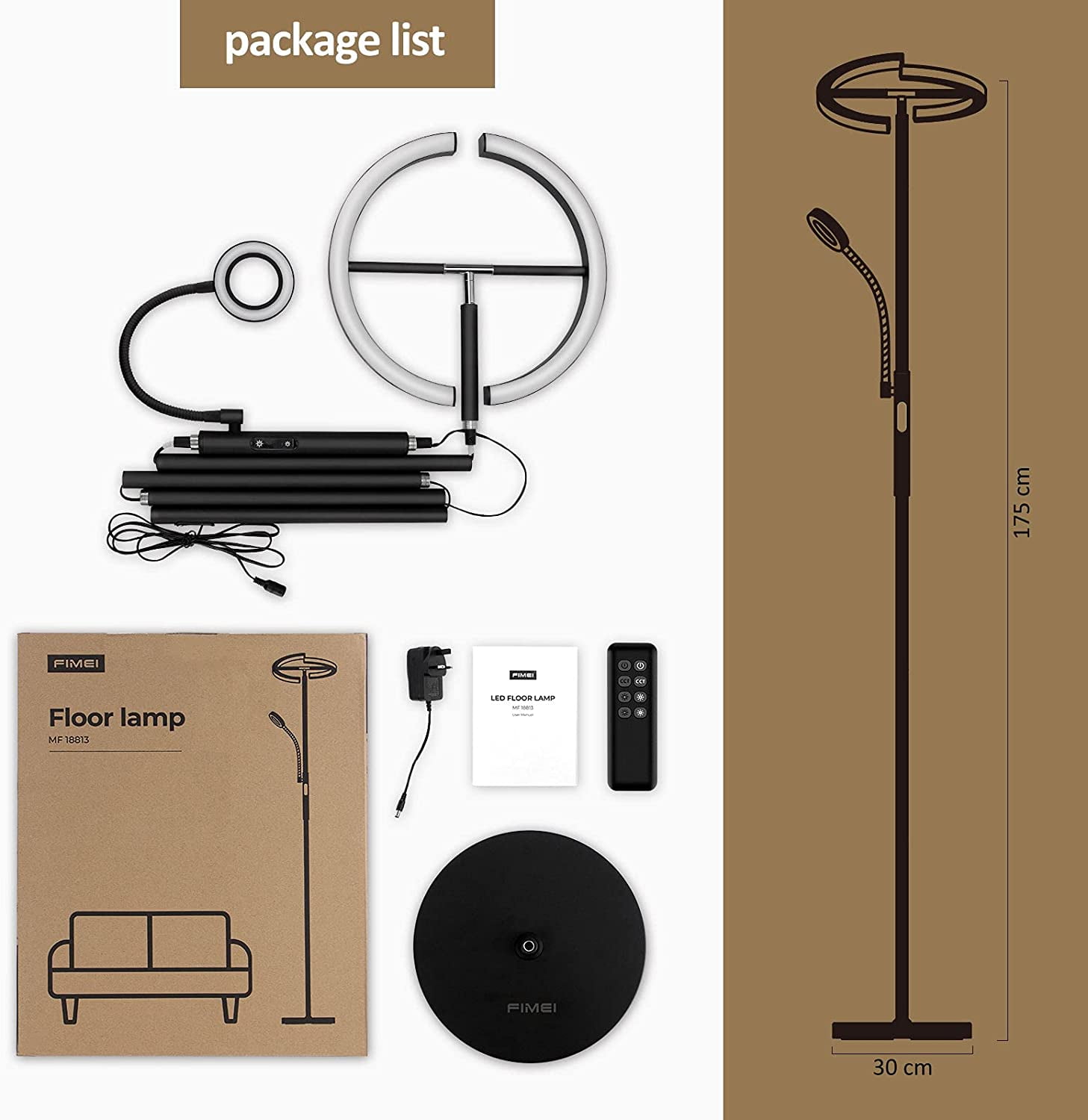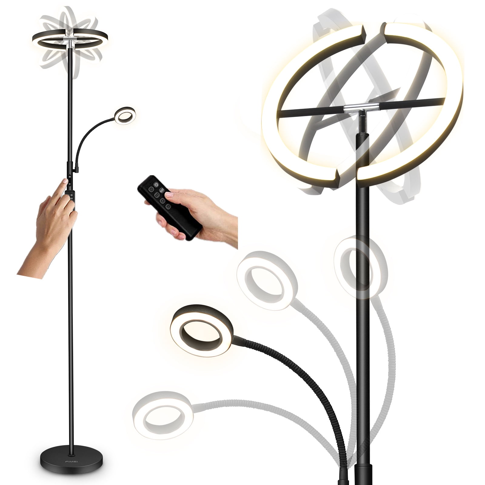 Modern Stylish Design: Beautiful and save space! FIMEI modern stylish led floor lamp is suitable for living room, bedroom, office, and study, etc. With high performance, it can improve your life and work. Choose Modern Stylish FIMEI Floor Lamp for daily use, you will find it more suitable for you. Fast & Easy to Assemble: Follow our manual to assemble each section of the light pole. Please be careful not to damage the wire due to excessive pulling. Assembly Suggestion: hold the main light pole section and assemble from top to base. Disassembly Suggestion: place the light horizontally on the ground, and disassemble it from the base to the top. Bright, Soft, and Eye Protecting: With a more humanized design, FIMEI Floor Lamp can meet your lighting needs of different orientations, color temperatures, and brightness. The small lamp will provide suitable lighting for reading, night light and so on. Choose a modern stylish FIMEI Floor Lamp, you will find it more suitable for you. Material: Metal + Plastic Color: Black Wattage: 20w+7w Weight:10.49 lbs Input Voltage: AC100-240V 50/60Hz Adapter Voltage: DC24V 1.5A Color Temperature: 3000K-6000K Style: Modern Brand: FIMEI Light Source Type: LED Power Source: Corded Electric Control Method: Remote, Touch Assembled Height: 69 inches Assembled Length: 12.4 inches Assembled Width: 12.4 inches Product Dimensions: 12.4″D x 12.4″W x 69″H