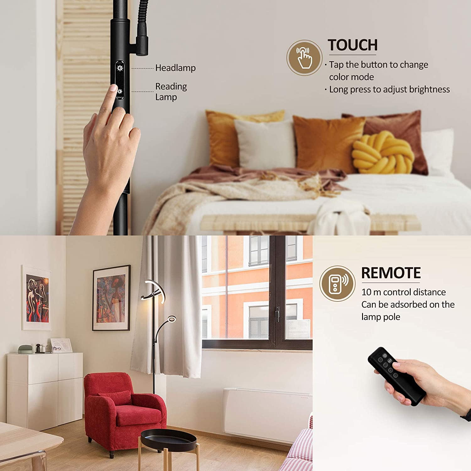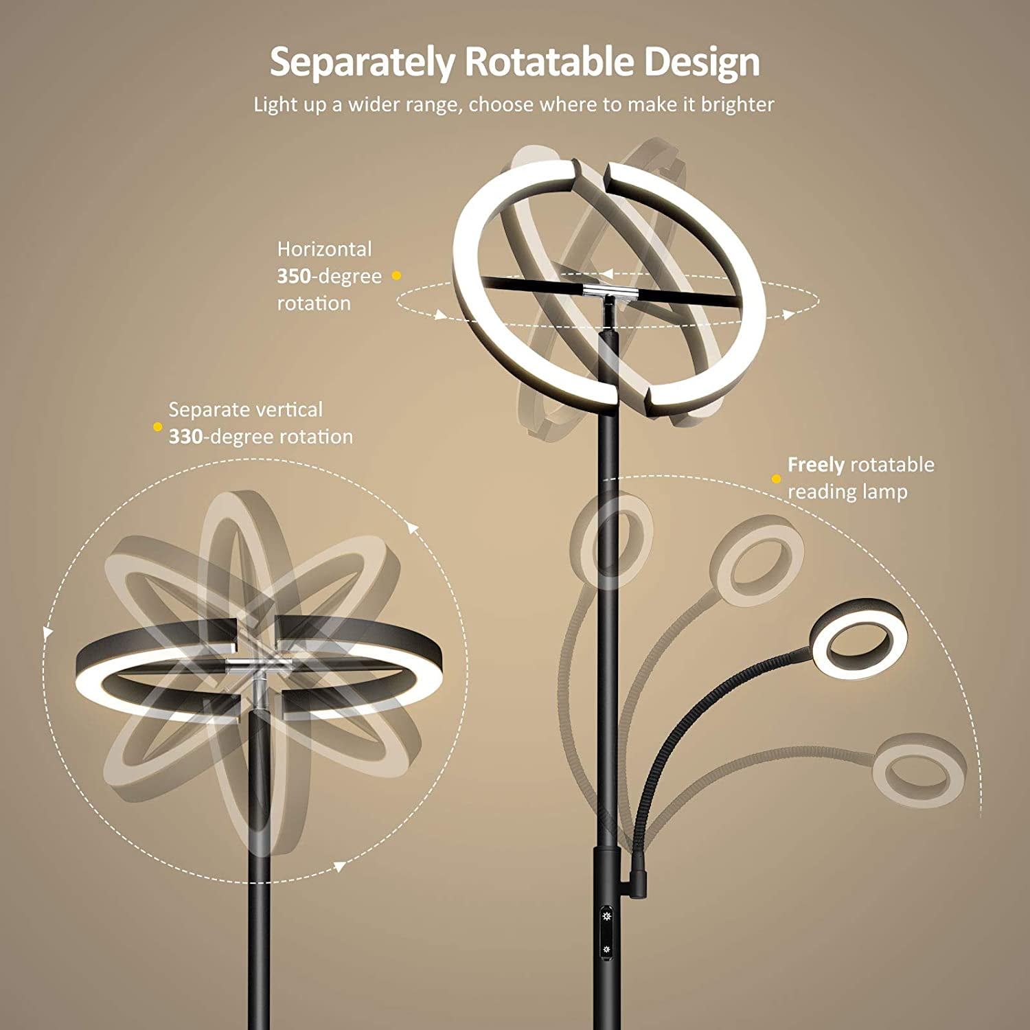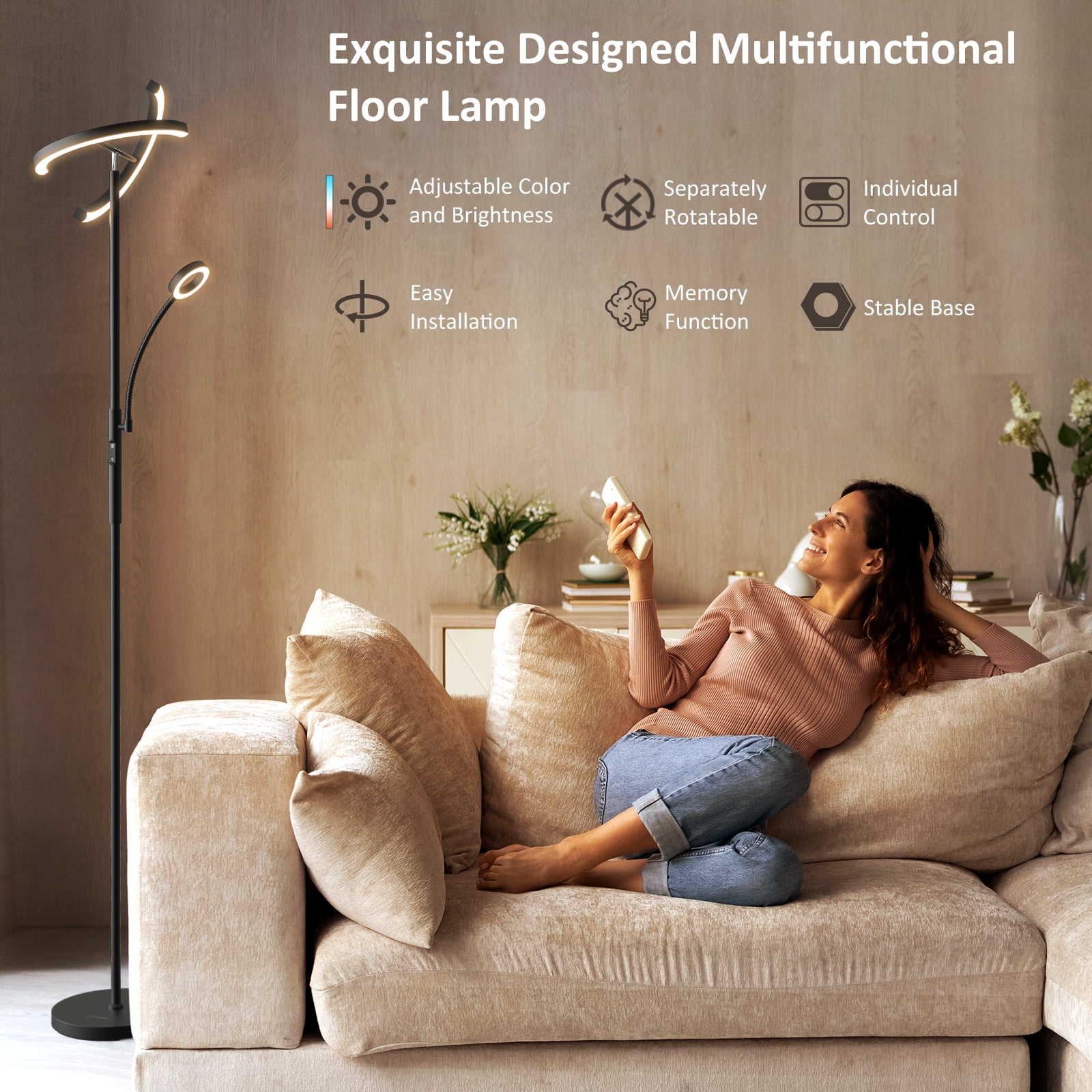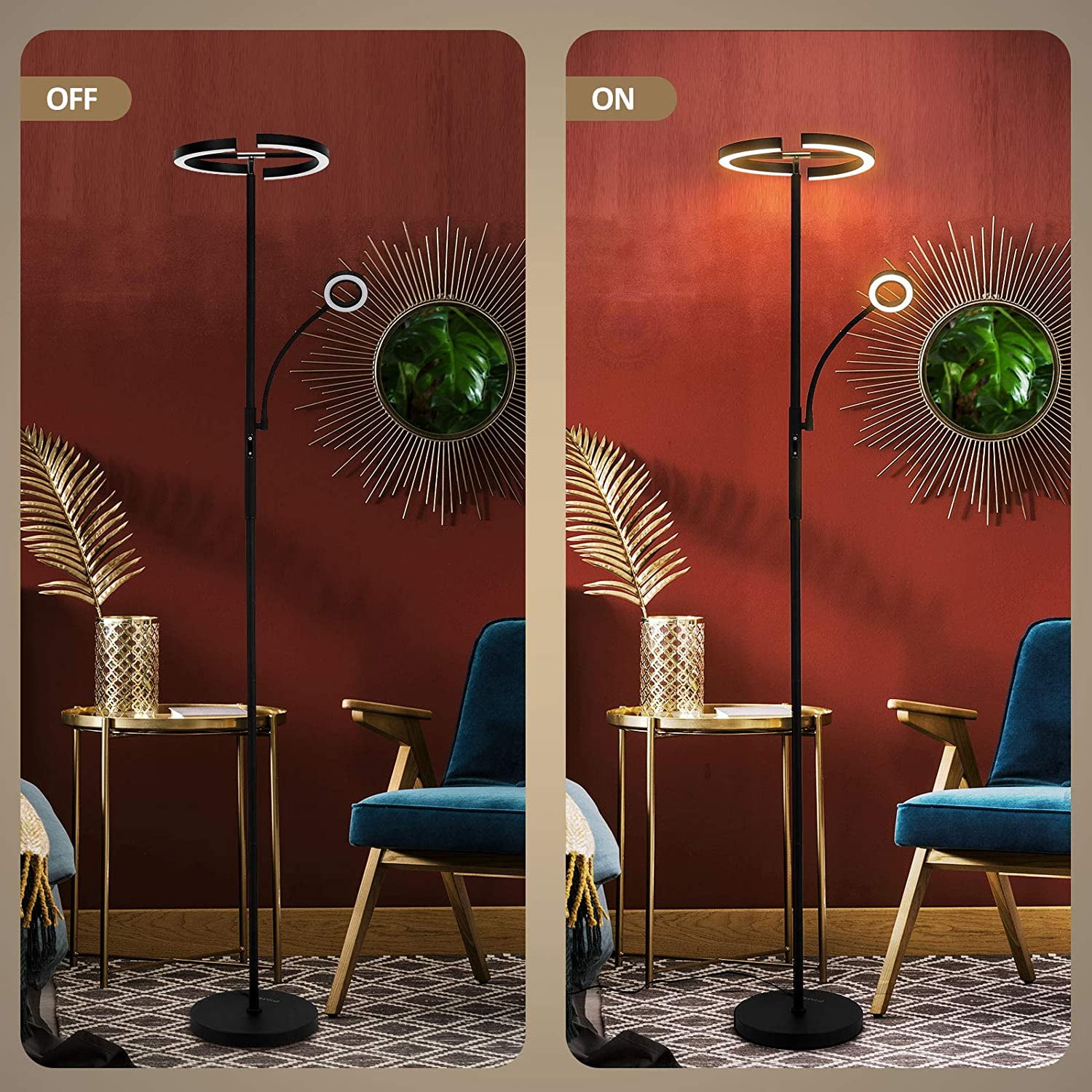 Modern Stylish Design: Beautiful and save space! FIMEI modern stylish led floor lamp is suitable for living room, bedroom, office, and study, etc. With high performance, it can improve your life and work. Choose Modern Stylish FIMEI Floor Lamp for daily use, you will find it more suitable for you. Fast & Easy to Assemble: Follow our manual to assemble each section of the light pole. Please be careful not to damage the wire due to excessive pulling. Assembly Suggestion: hold the main light pole section and assemble from top to base. Disassembly Suggestion: place the light horizontally on the ground, and disassemble it from the base to the top. Bright, Soft, and Eye Protecting: With a more humanized design, FIMEI Floor Lamp can meet your lighting needs of different orientations, color temperatures, and brightness. The small lamp will provide suitable lighting for reading, night light and so on. Choose a modern stylish FIMEI Floor Lamp, you will find it more suitable for you. Material: Metal + Plastic Color: Black Wattage: 20w+7w Weight:10.49 lbs Input Voltage: AC100-240V 50/60Hz Adapter Voltage: DC24V 1.5A Color Temperature: 3000K-6000K Style: Modern Brand: FIMEI Light Source Type: LED Power Source: Corded Electric Control Method: Remote, Touch Assembled Height: 69 inches Assembled Length: 12.4 inches Assembled Width: 12.4 inches Product Dimensions: 12.4″D x 12.4″W x 69″H