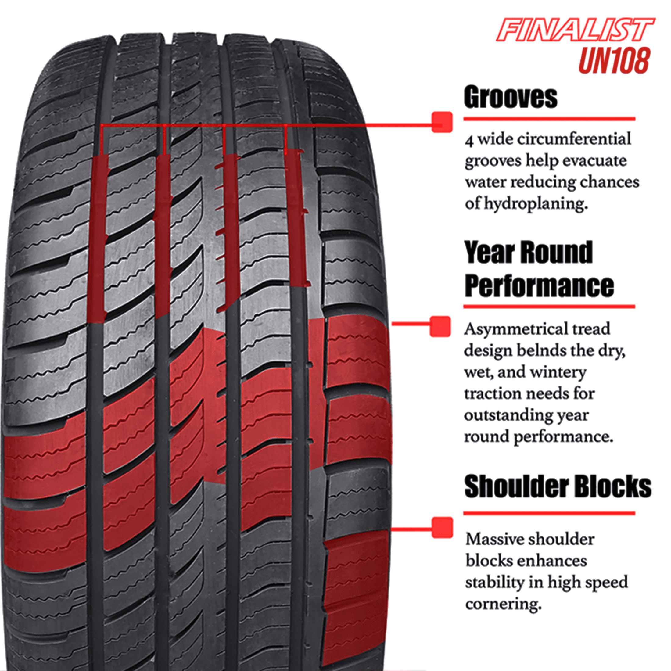Finalist UN108 All Season 235/50R18 97W High Performance A/S Passenger Tire 235/50/18 (Tire Only) Road Hazard Warranty All terrain traction Enhanced controllability Longer lasting tread life Damage resistance OVERVIEW Where are your tires leading you? Whether commuting around town or opening it up on the open road, let the Finalist UN108 Tire show you there. The Finalist UN108 is designed to deliver precision control and responsiveness in today’s performance cars while maintaining increased tread life. The asymmetrical tread design gives you the best of wet and dry traction, delivering an excellent all-season performance. The specially formulated compound and optimized tread pitch design deliver a smooth and quiet ride.