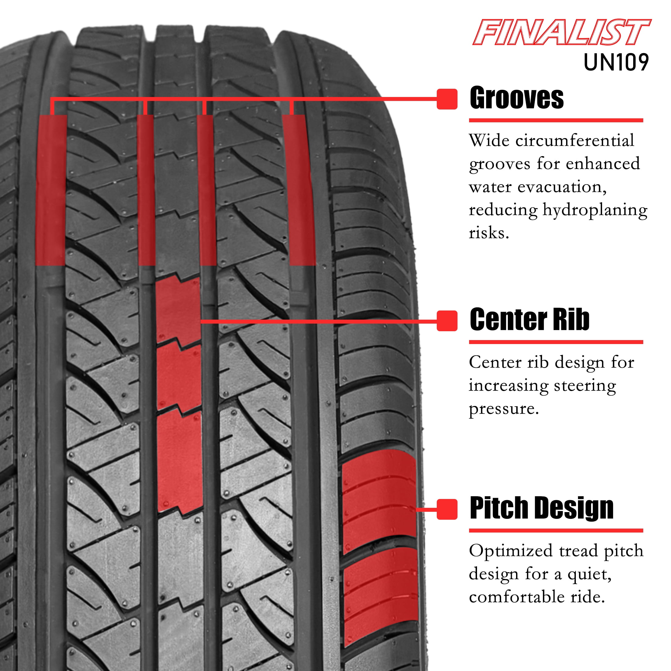 Finalist UN109 215/70 R15 215/70R15 98T All Season Passenger Tires (No Rim) All season traction Low on-road road noise Durable controllability Self-cleaning tread design OVERVIEW The Finalist UN109 is an all-season high-performance tire designed for a more comfortable ride with reduced noise. The 4 circumferential grooves provide outstanding water evacuation, resisting hydroplaning and thus improving vehicle control and driver’s safety.