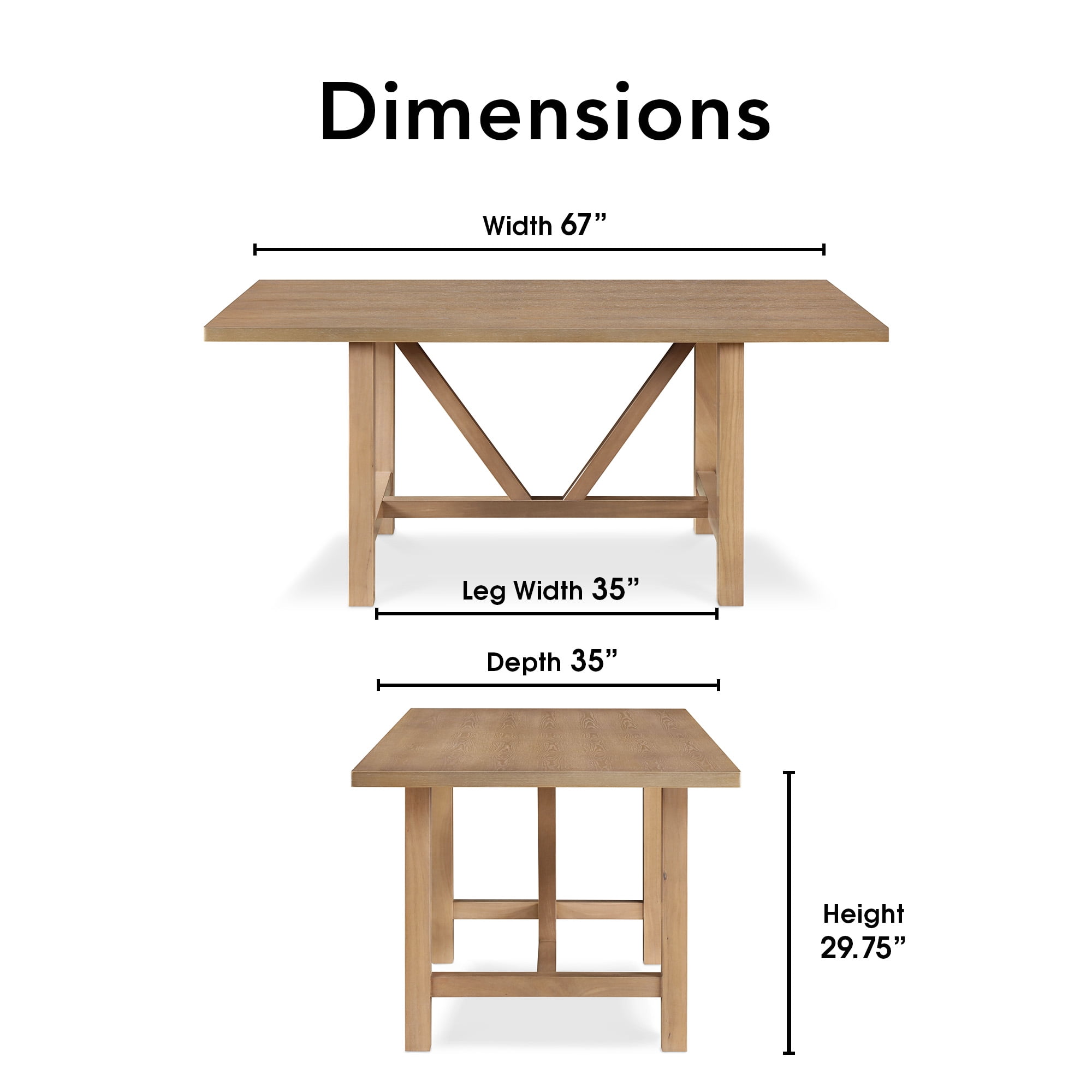 Add a homey touch to any space with this modern farmhouse wooden dining table Rectangular table comfortably seats up to six people Wood veneer on the tabletop creates a warm, inviting atmosphere Solid wood trestle base adds architectural interest Easy Assembly Required Supports up to 220 lbs. 35-inch width x 67-inch length x 29.6-inch height