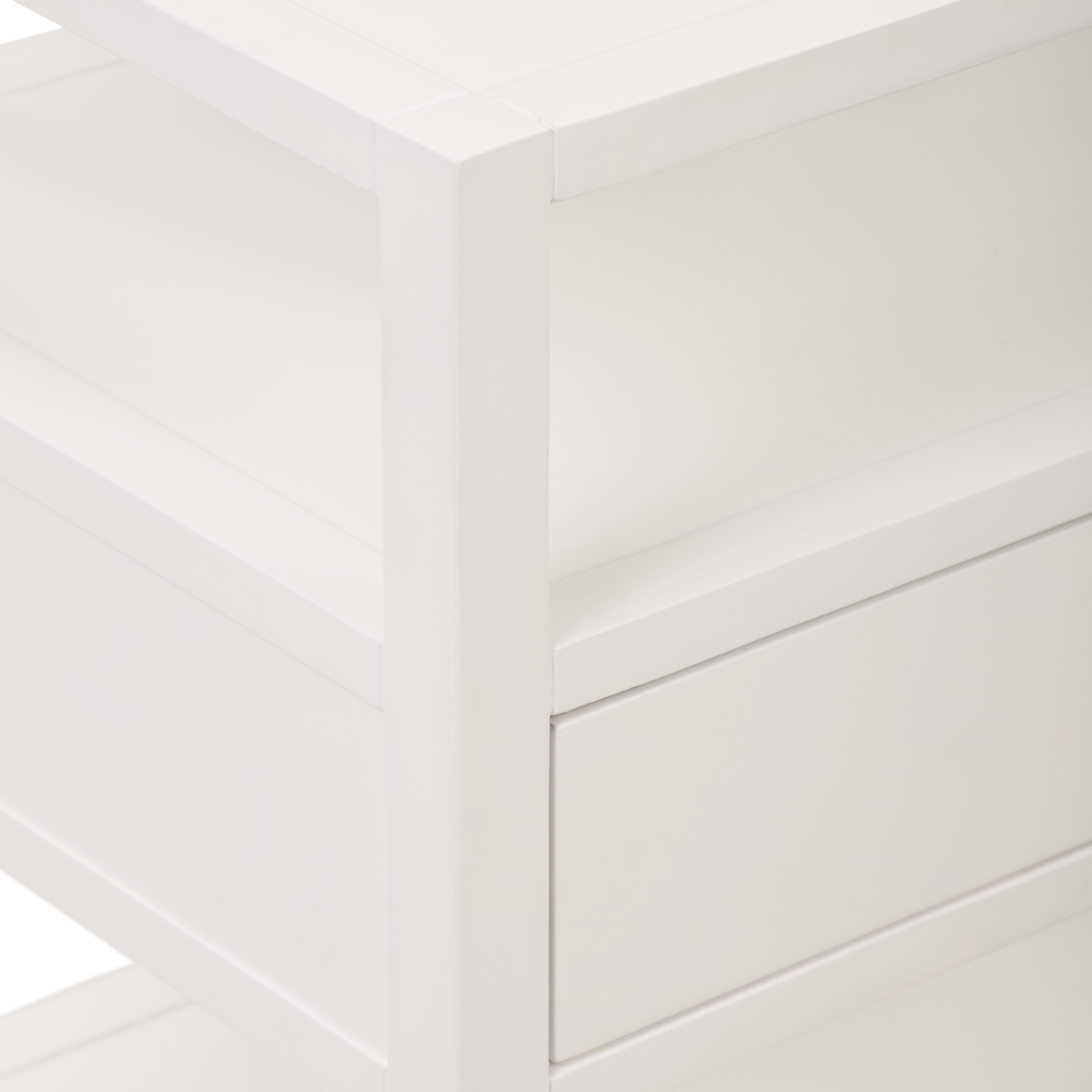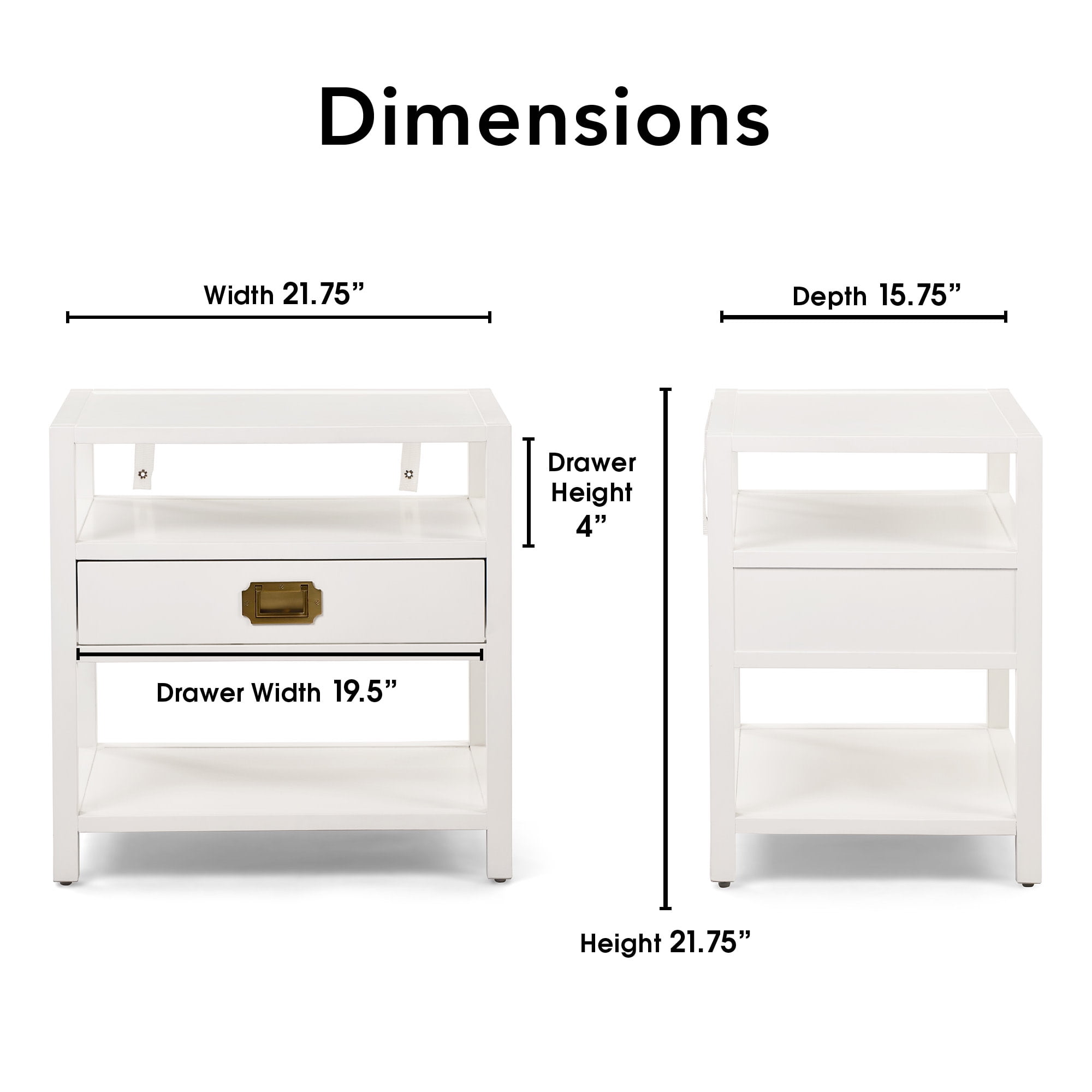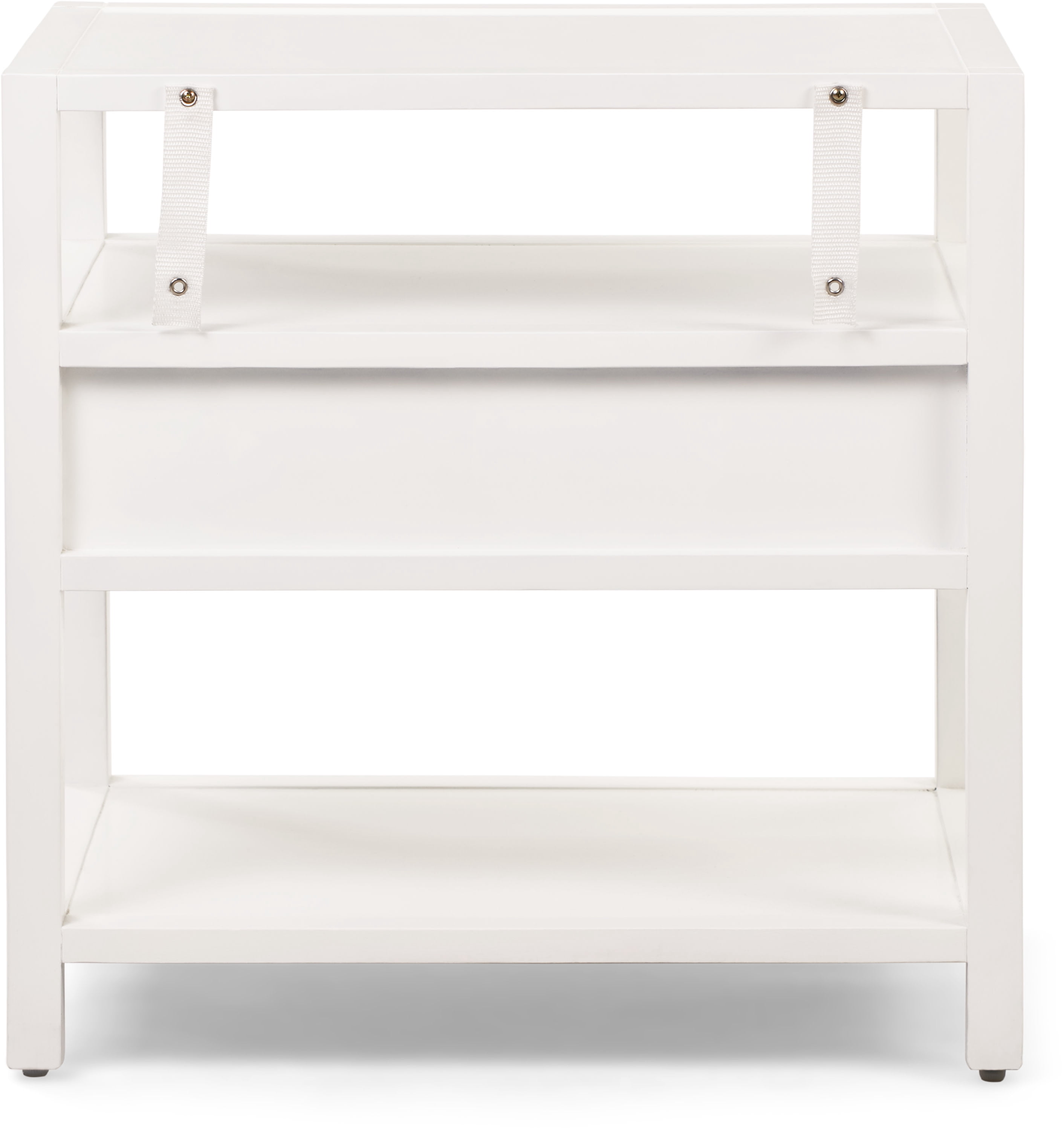 Sophistication and functionality combine in this stylish end table Brass metal accents beautifully offset the bright white finish Flat tiers of storage shelves and one drawer offer plenty of storage space Use as an end table, nightstand, or decorative accent piece Easy assembly required