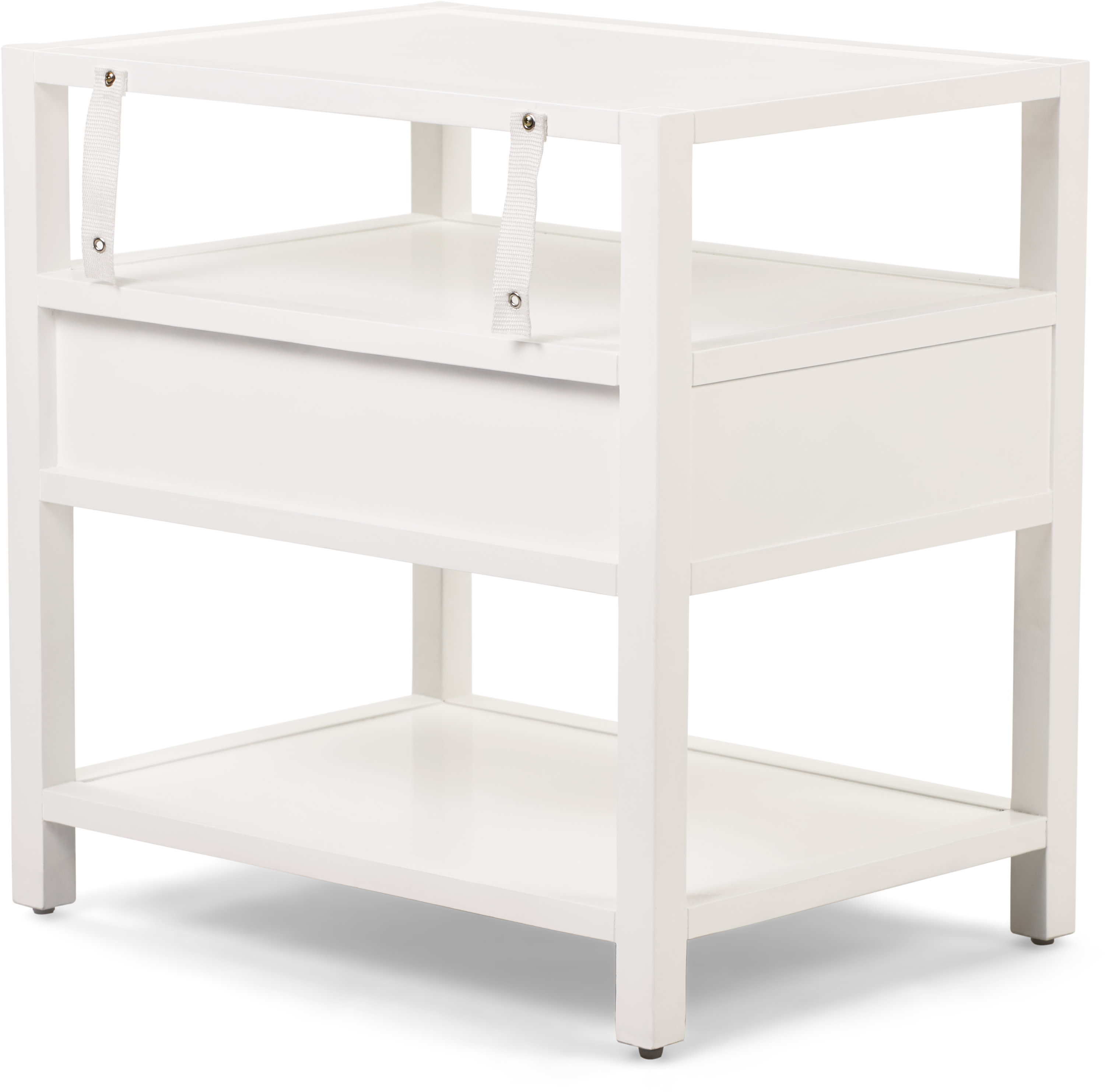 Contemporary style and vintage charm combine perfectly in this timeless accent table. Perfect for extra storage space in your bedroom, living room or den, this table has three tiers of shelves and a small storage drawer for keeping odds and ends. This white wood table with brass accents can be placed in any color of room and the recessed drawer pull adds a simple pop of color. You will love the look, durability and functionality of this side table in your room of choice. Features: Sophistication and functionality combine in this stylish end table Brass metal accents beautifully offset the bright white finish Flat tiers of storage shelves and one drawer offer plenty of storage space Use as an end table, nightstand, or decorative accent piece Easy assembly required