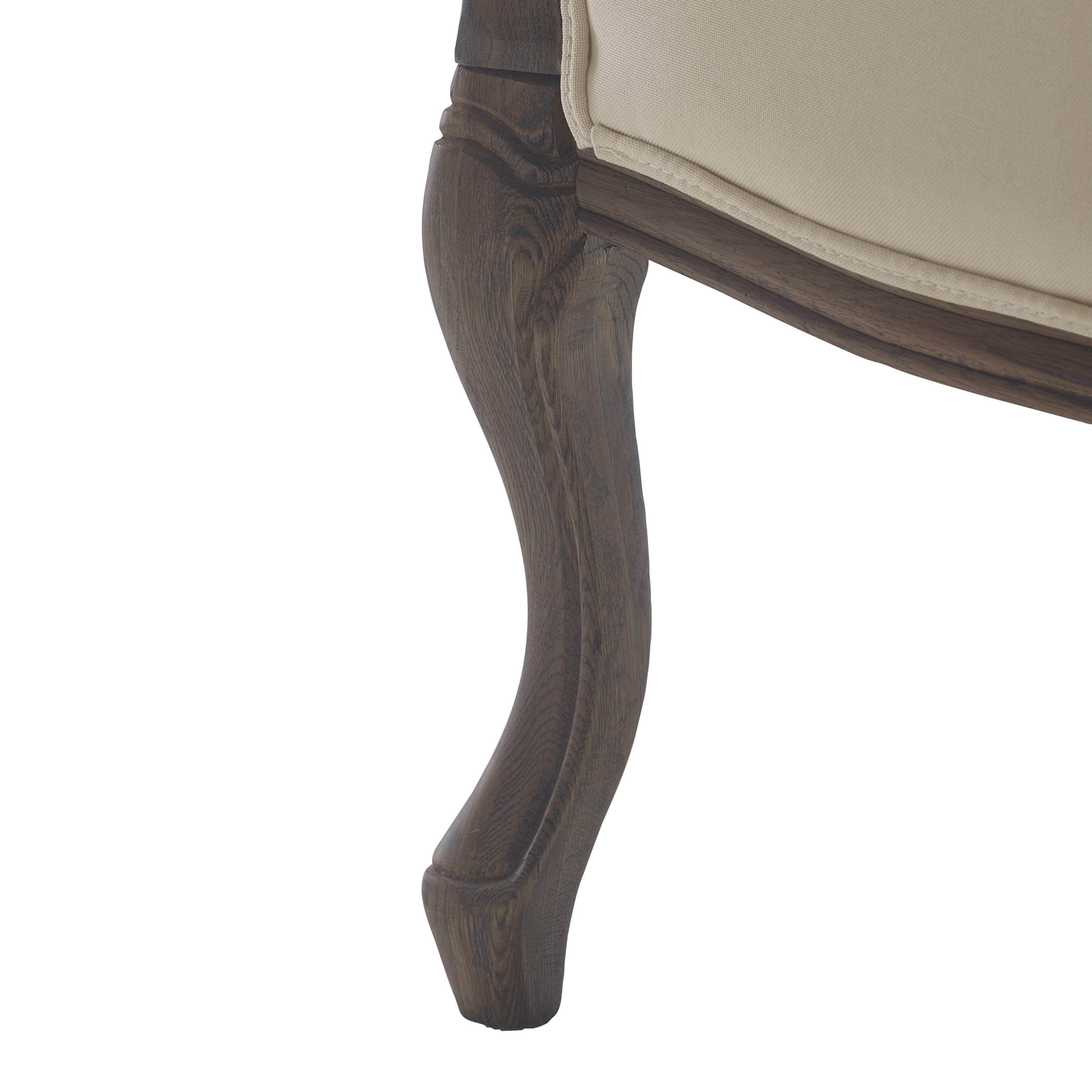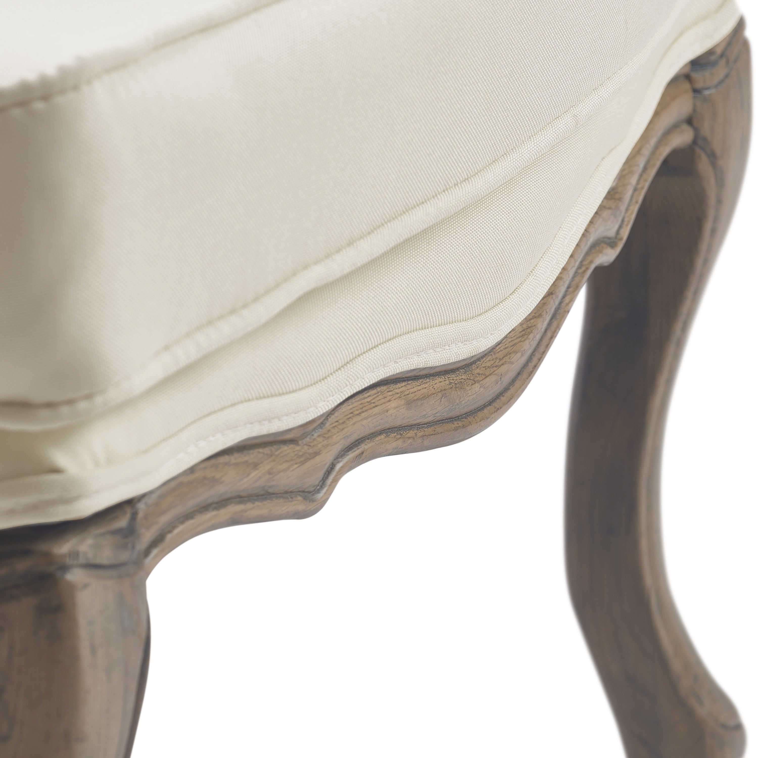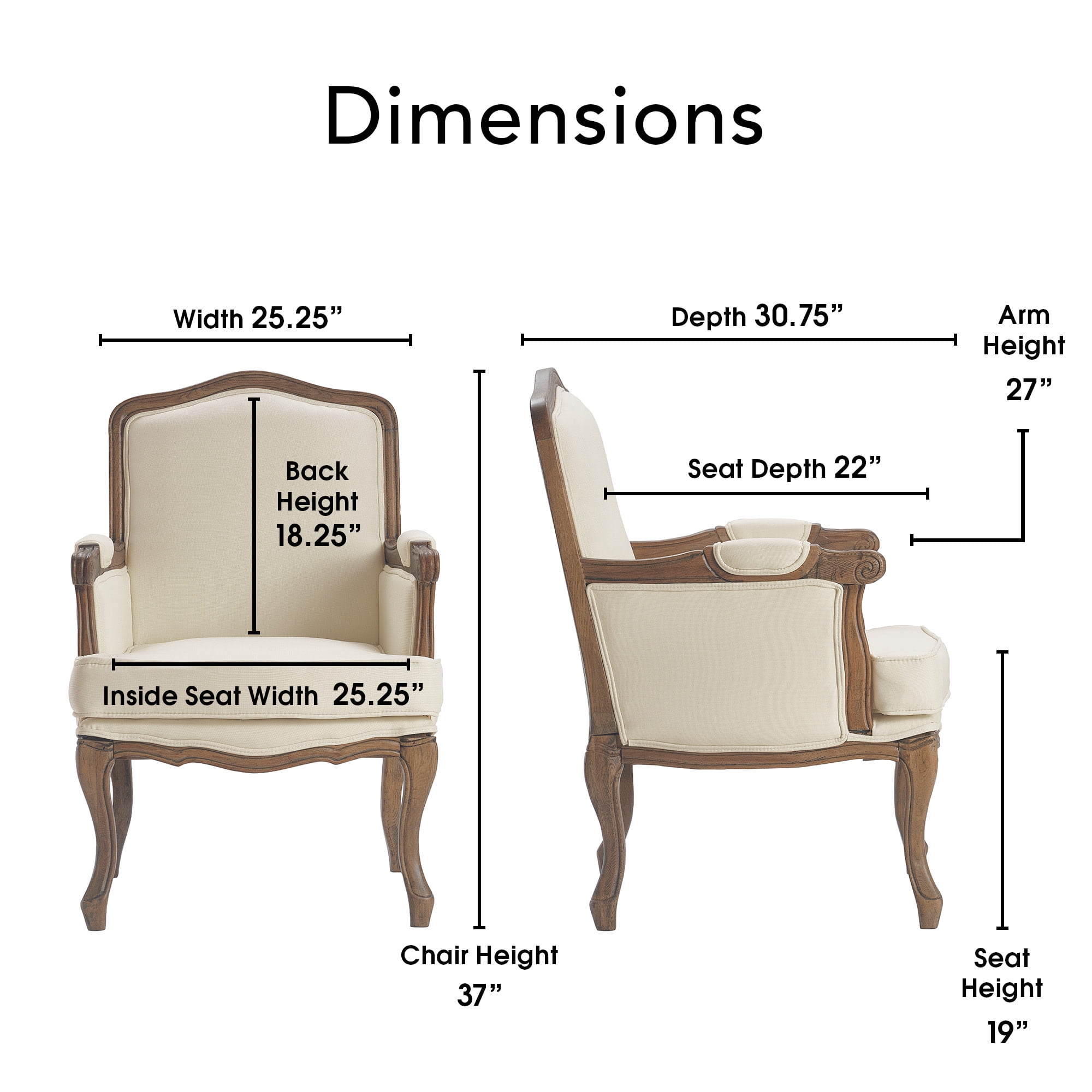 Traditional armchair inspired by the French countryside Cream-toned woven fabric upholstery Hand carved distressed wood finish frame Firm cushion with removable cover Charming and versatile as a dining chair, side chair, or accent chair Easy Assembly Required Supports up to 250 lbs. 25.1-inch width x 30.7-inch depth x 37-inch height