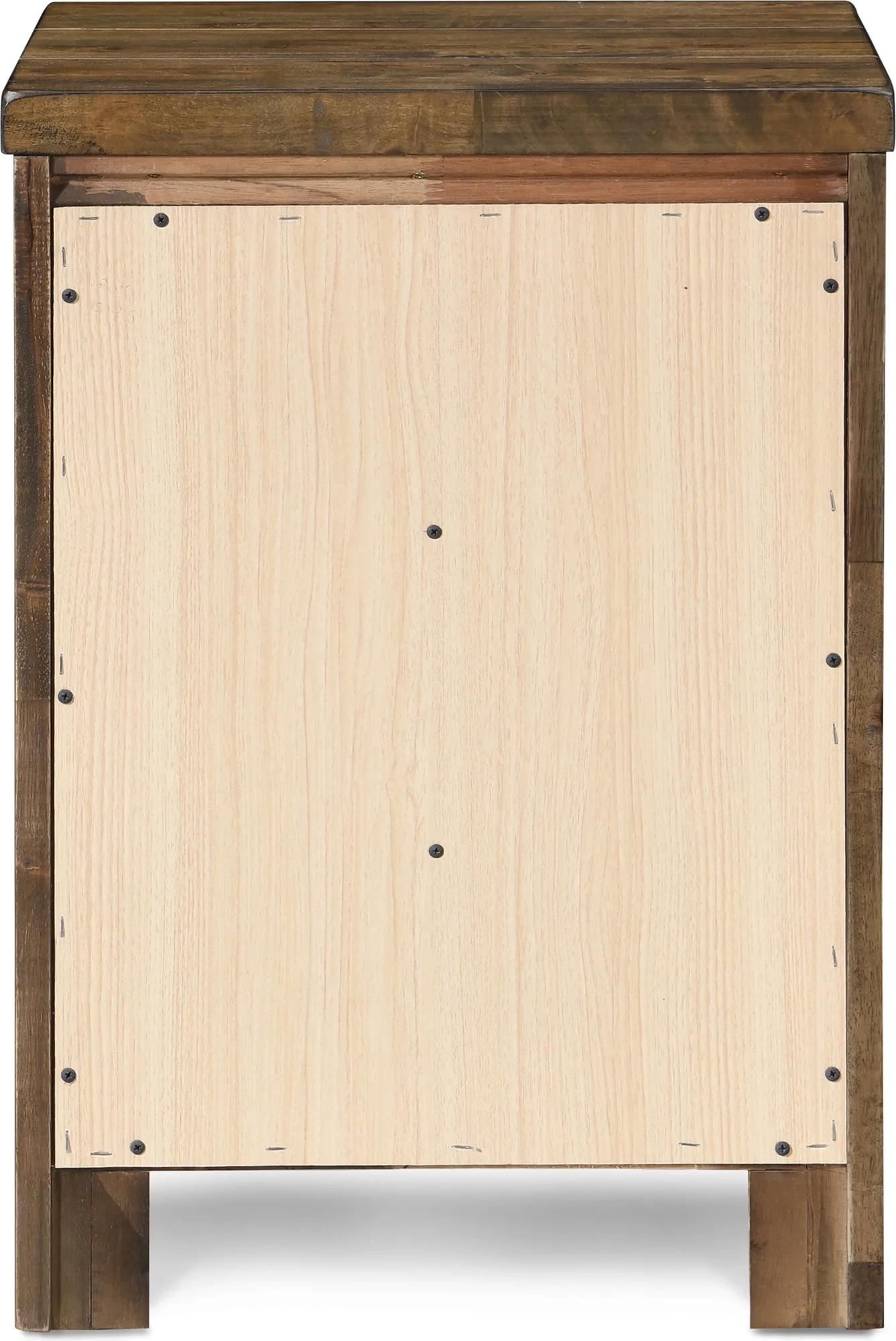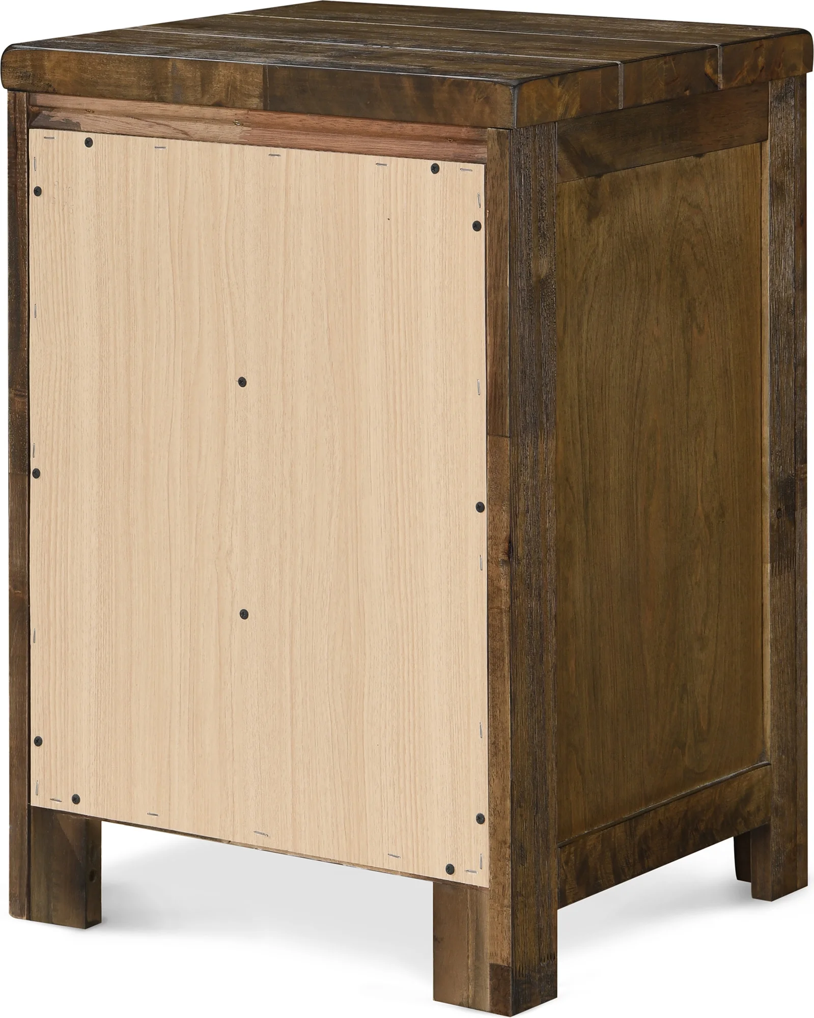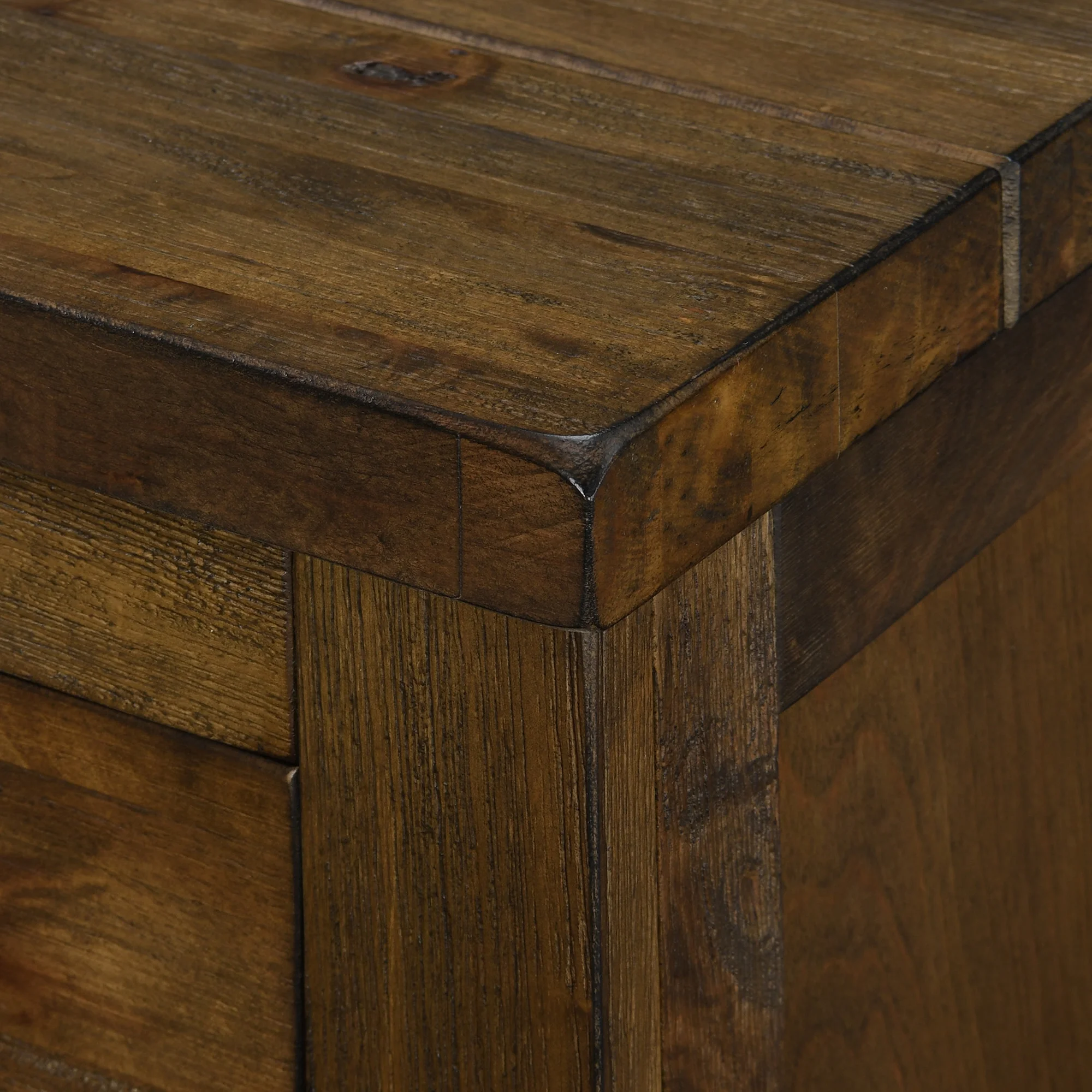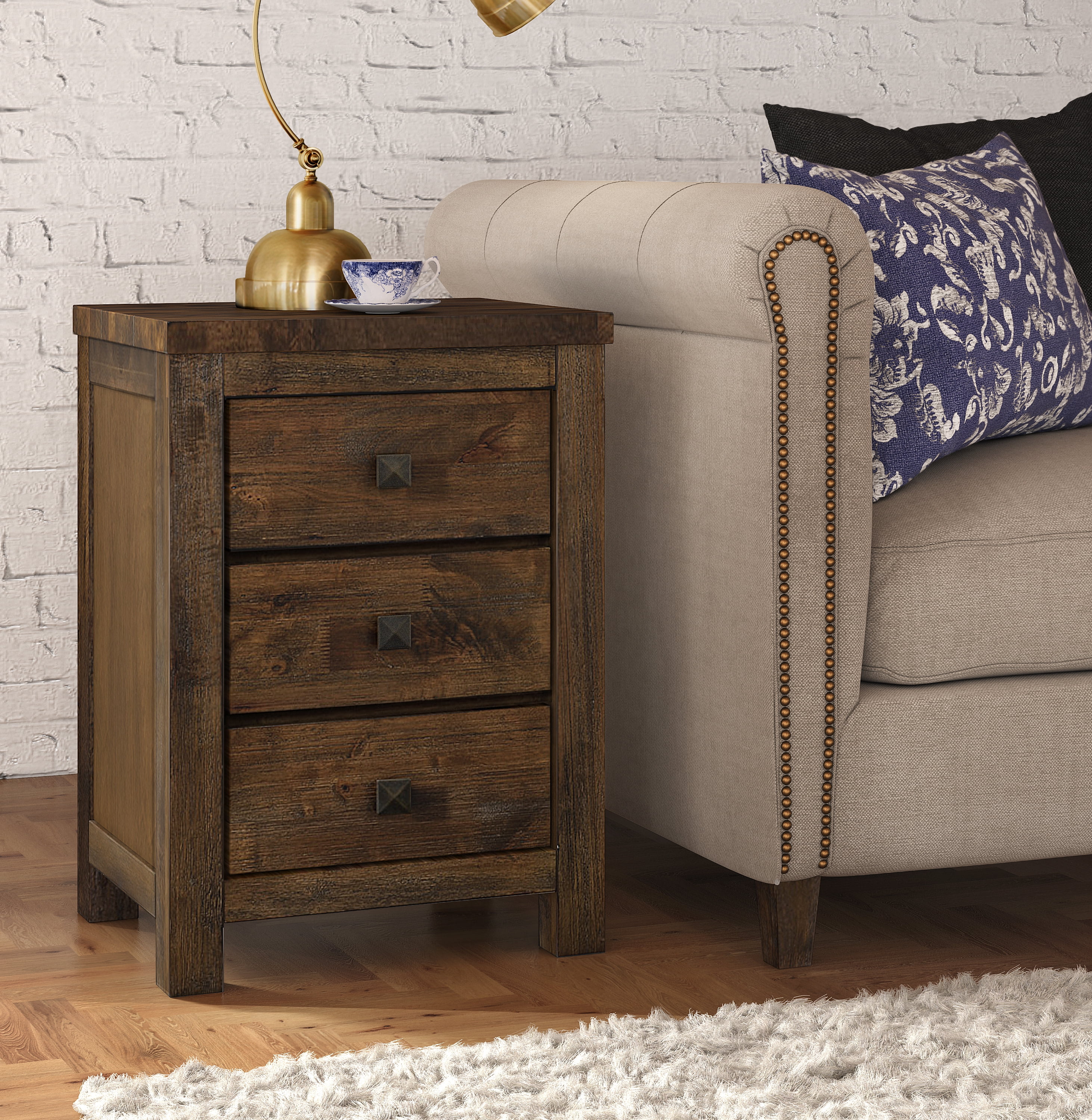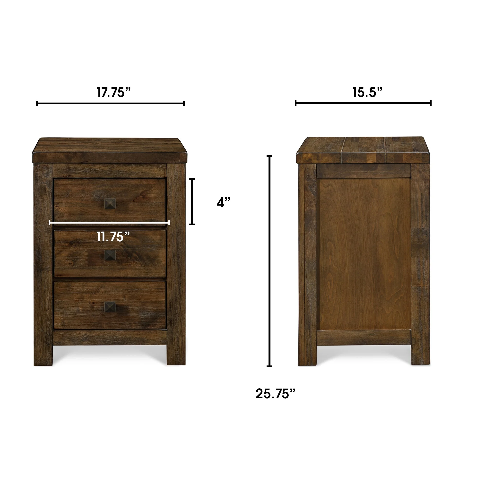 Solve your bedroom storage woes with this charming three drawer nightstand. This bedside table has a small profile that makes it a great option for placement in a guest bedroom or beside a living room sofa. But don’t let its small stature fool you, this accent table has three drawers that provide plenty of storage. The nightstand has a rustic farmhouse design and features a beautiful natural wood grain texture to complement many bedroom styles. Pyramid shaped, beveled drawer handles add to the beauty and quality of this piece.