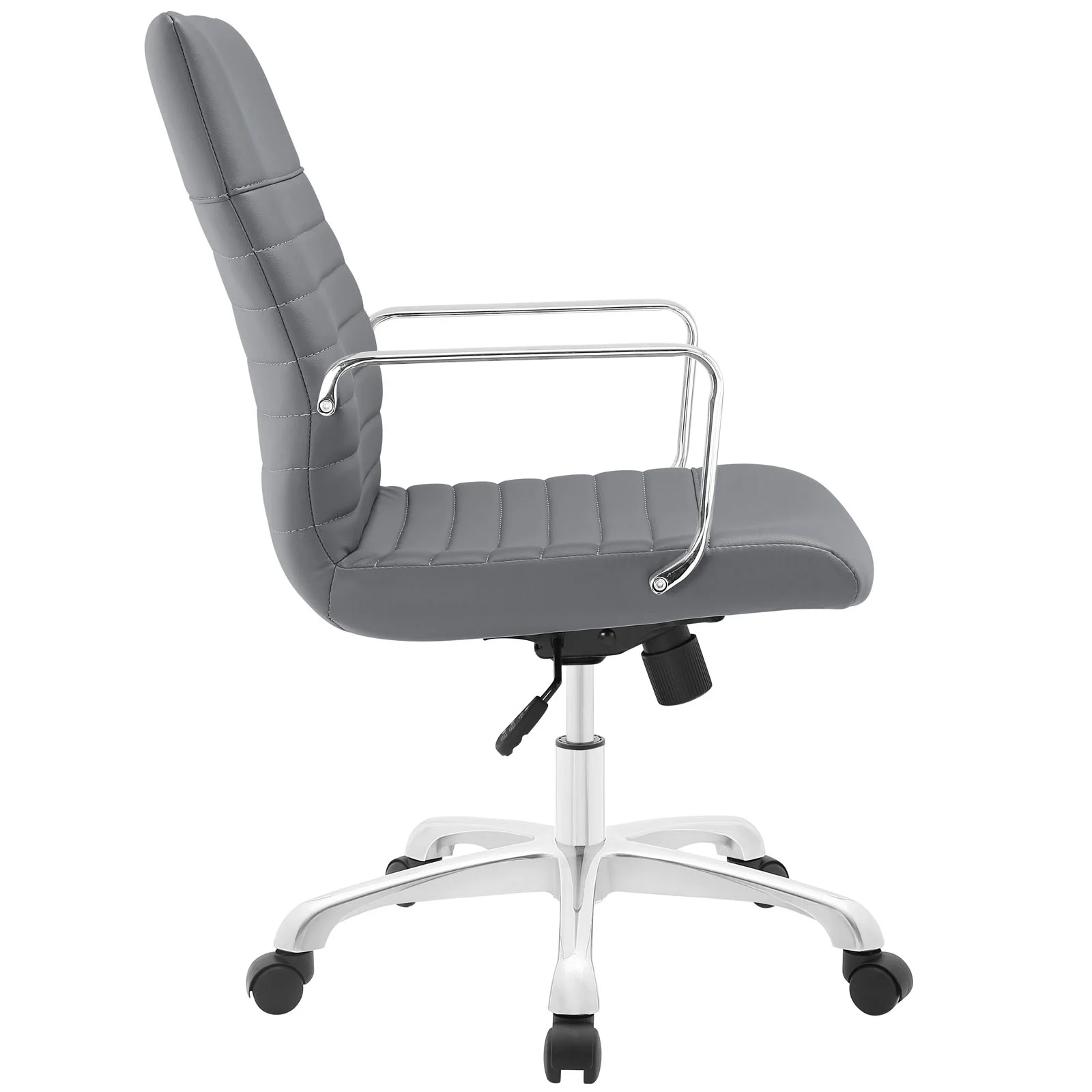 Finesse Mid Back Office Chair-EEI-1534 Sweet precision and simple details go into making Finesse a pleasantly rewarding office chair. Designed with a delicately ribbed vinyl cushioned mid back and waterfall seat, Finesse delivers a touch of everything that matters. Equipped with chrome steel armrests, and a polished aluminum base with five dual-wheel black nylon casters, easily glide over carpeted surfaces in style. Finesse also comes with a height adjustable pneumatic lever and tension knob to control the chair�s backward tilt. Bullet Features: Modern office chair Padded vinyl upholstery Polished aluminum base Chrome steel armrests Five dual-wheel nylon casters Height adjustable, full swivel Tension knob seat tilt control Assembly Required Set Includes: One – Finesse Mid Back Office Chair Product Dimensions: Overall Product Dimensions: 22.5″L x 26.5″W x 37.5 – 41.5″H Seat Dimensions: 19.5″L x 19″W x 15 – 17″H Armrest Dimensions: 25 – 28.5″H Thickness of Cushion: 2.5″H Backrest Dimensions: 18.5″W x 19″H