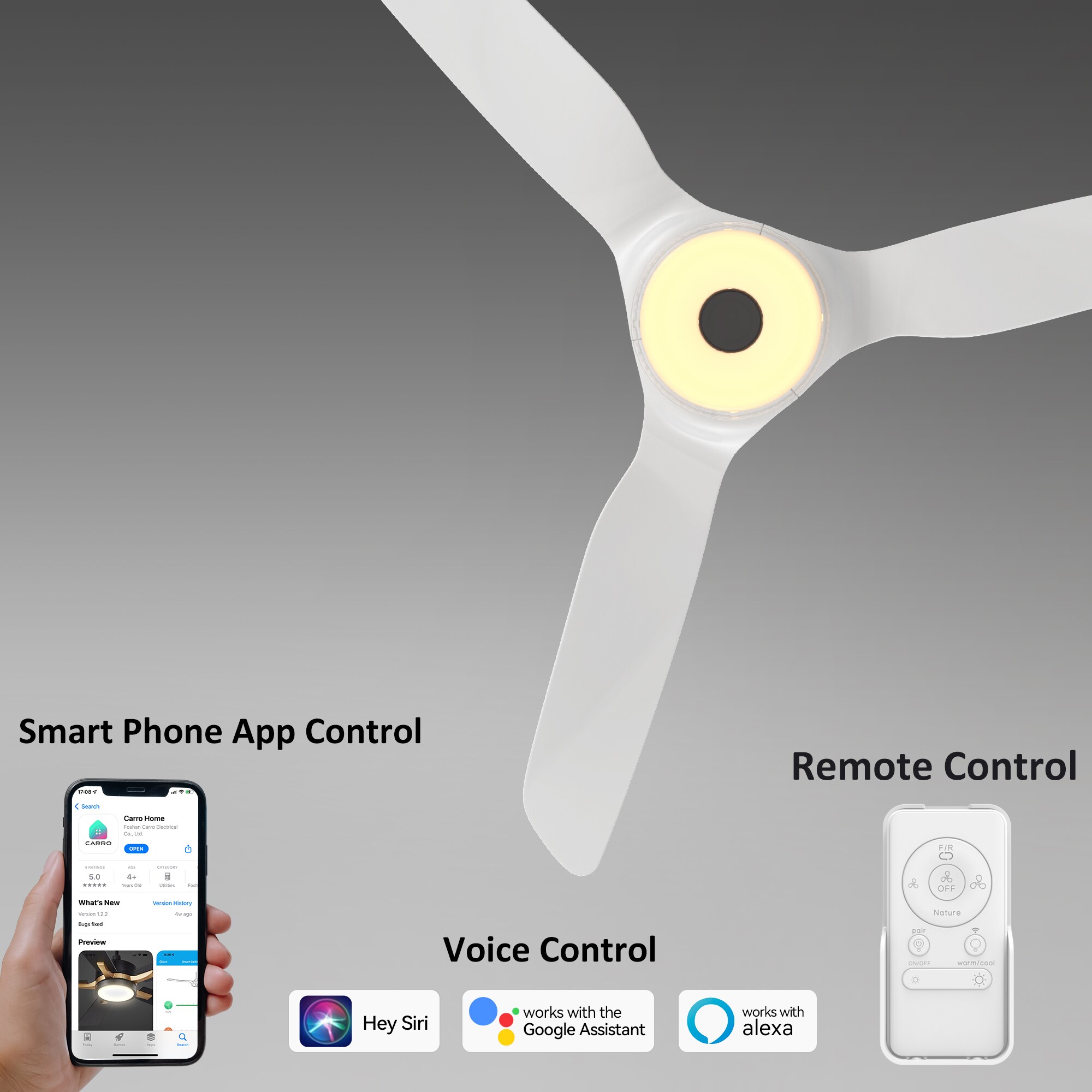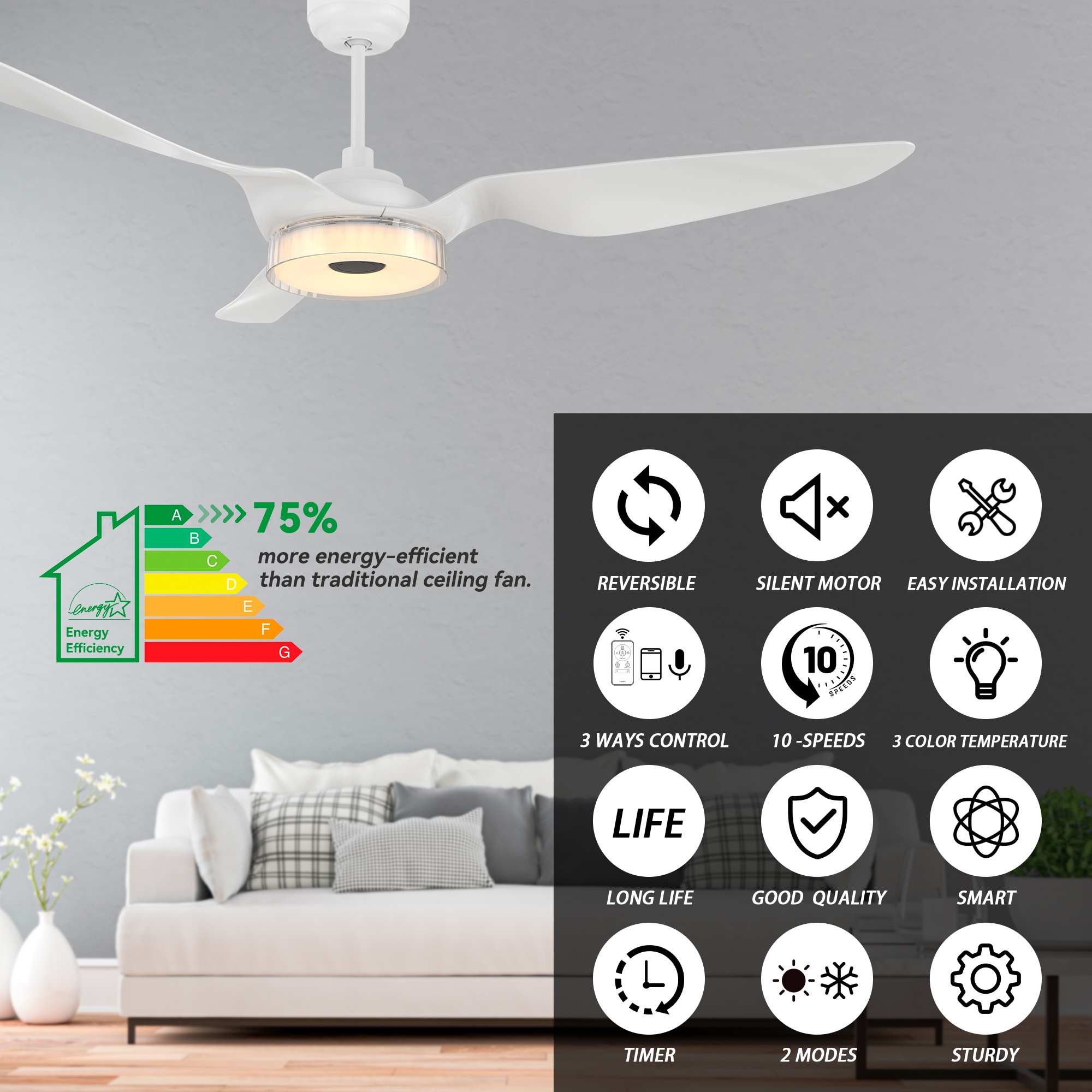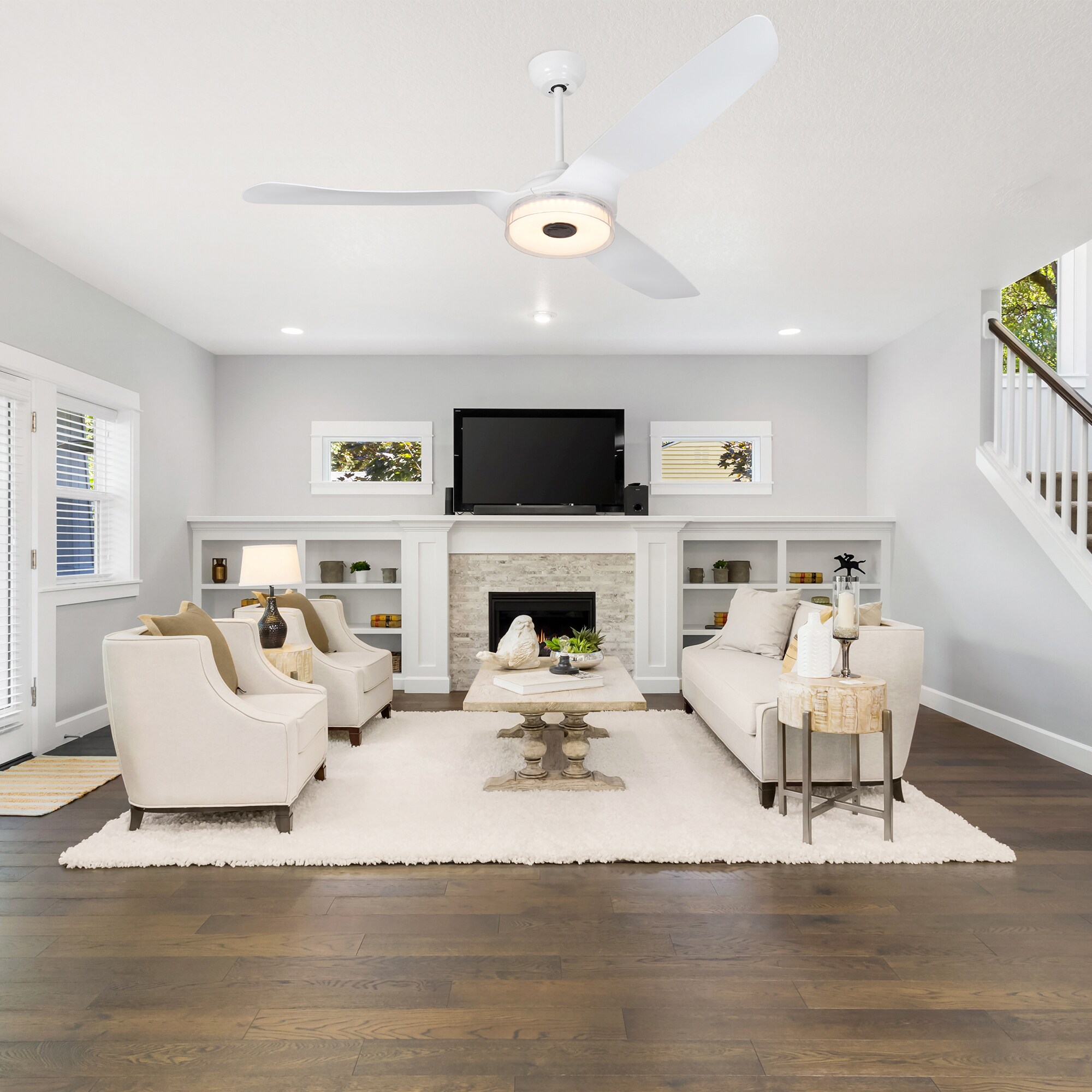 The Finley 60-in smart ceiling fan offers a combination of cooling, illumination, and aesthetics, making it an ideal choice for spacious indoor living areas. With its sleek design and White finish, this Wifi-enabled smart ceiling fan showcases a blend of simplicity and elegance. It incorporates very strong ABS blades and has an Integrated 4000K LED daylight, enhancing both functionality and style. The fan provides convenient features such as a Remote control, Wi-Fi apps, Siri Shortcut compatibility, and Voice control technology, making it compatible with Amazon Alexa and Google Home Assistant for effortless fan customization.