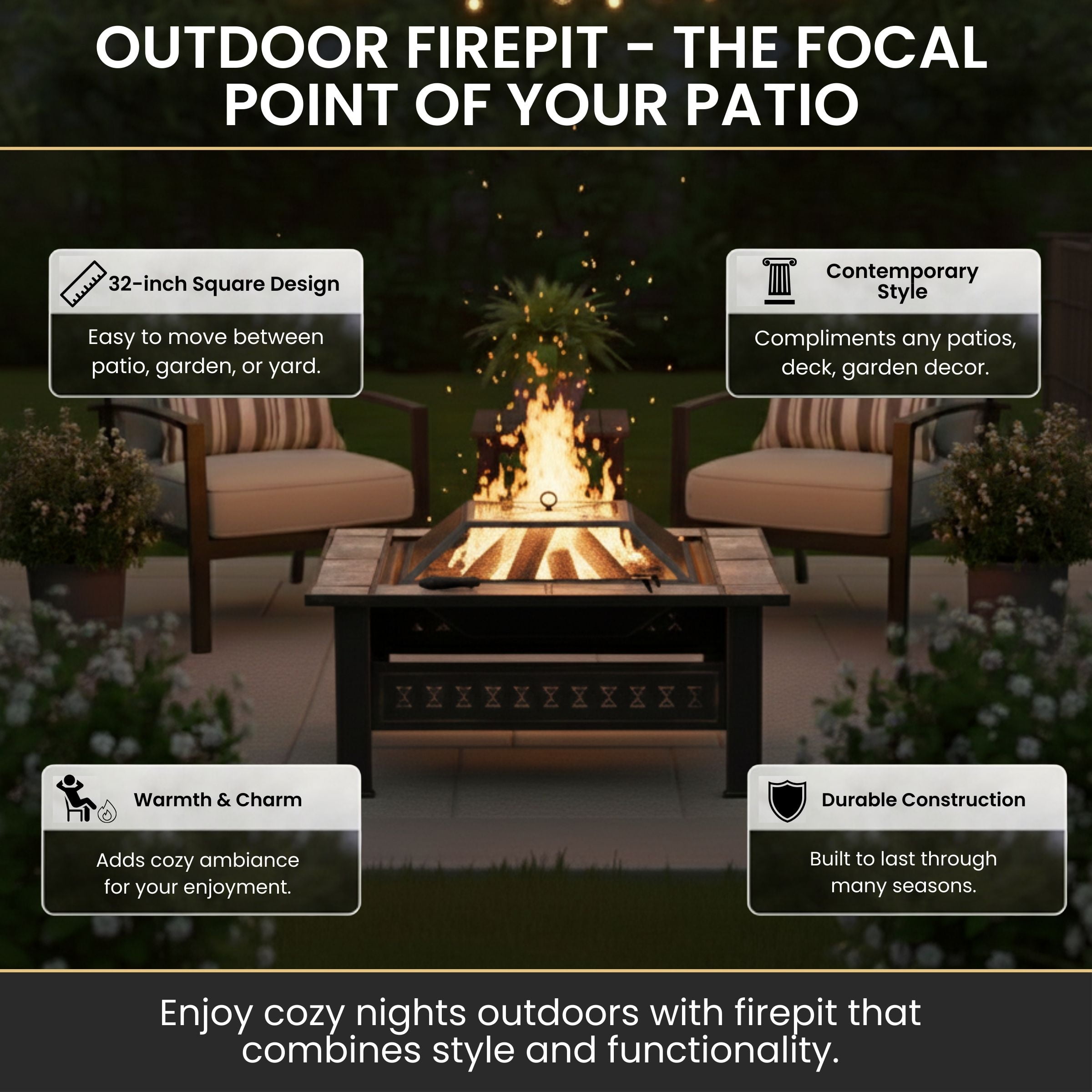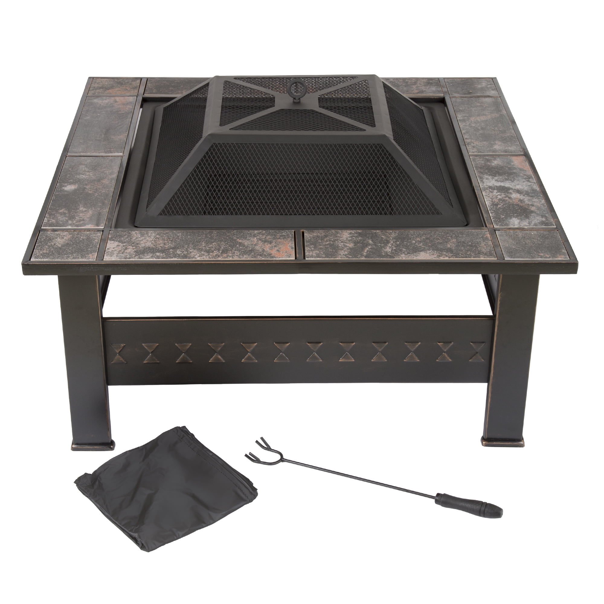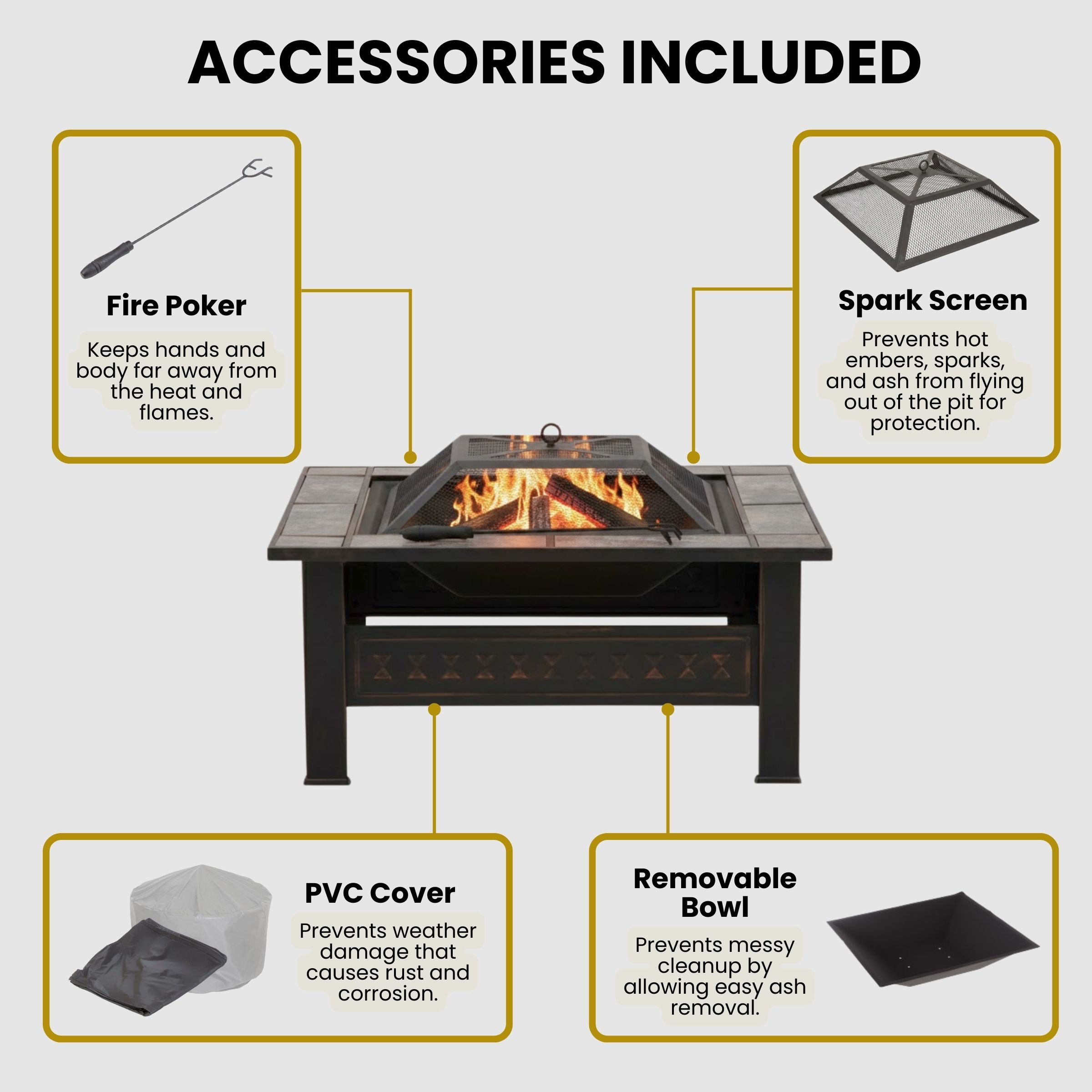 Fire Pit Set, Wood Burning Pit -Includes Screen, Cover and Log Poker- Great for Outdoor and Patio, 32 InchÂ? Marble Tile Square Firepit by Pure Garden