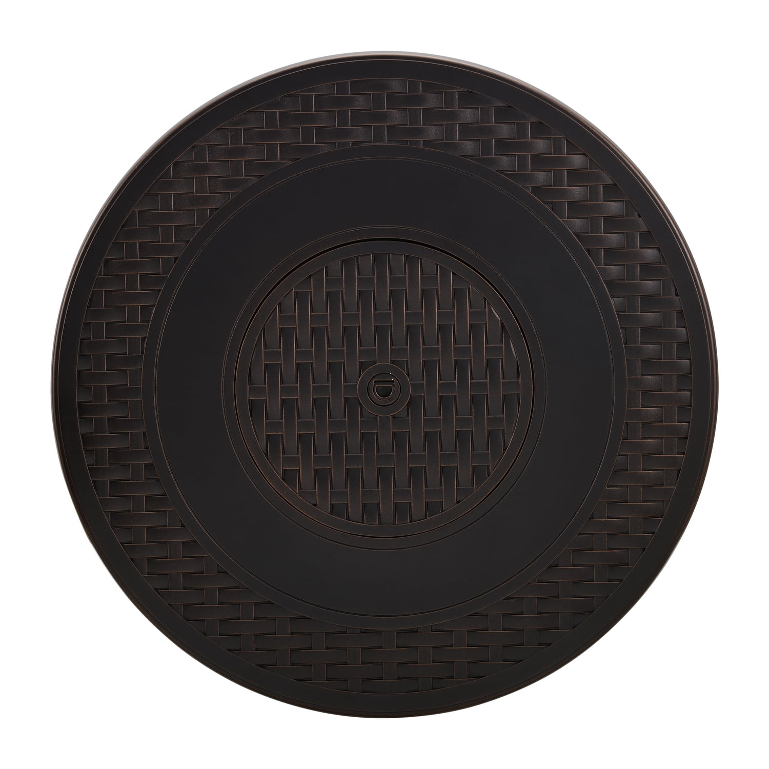 The Fire Sense Hendricks 33.9 in. Propane Fire Pit shows off a basket-weave motif and beautiful antique bronze finish, compatible with classic and contemporary outdoor décor. With a practical aluminum build and an adjustable full-flame output of 37,000 BTU, this versatile and compact fire pit pulls double duty as a patio table when covered with the included fire bowl lid. Arriving with clear fire glass for a reflective accent, just add a standard 20 lb. propane tank behind the handy hinged door. A weather-resistant cover for the fire pit is included for your convenience.