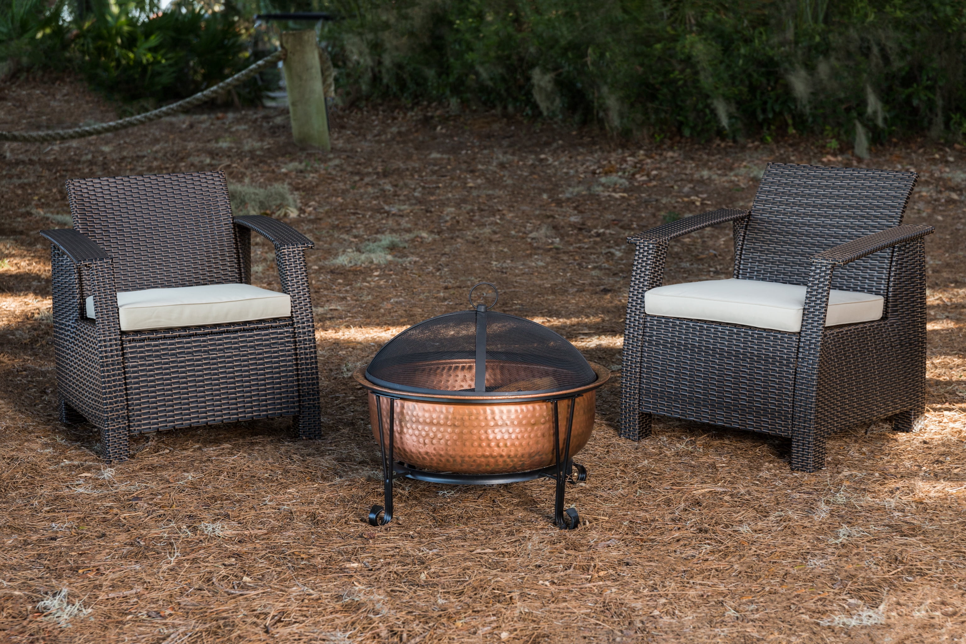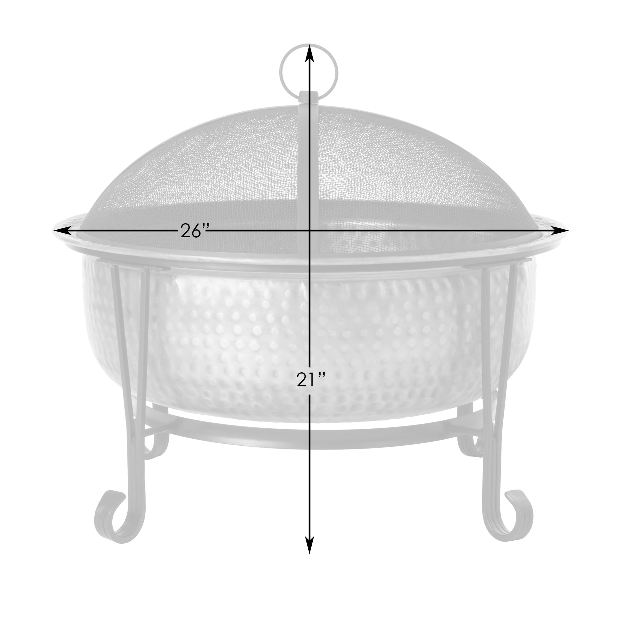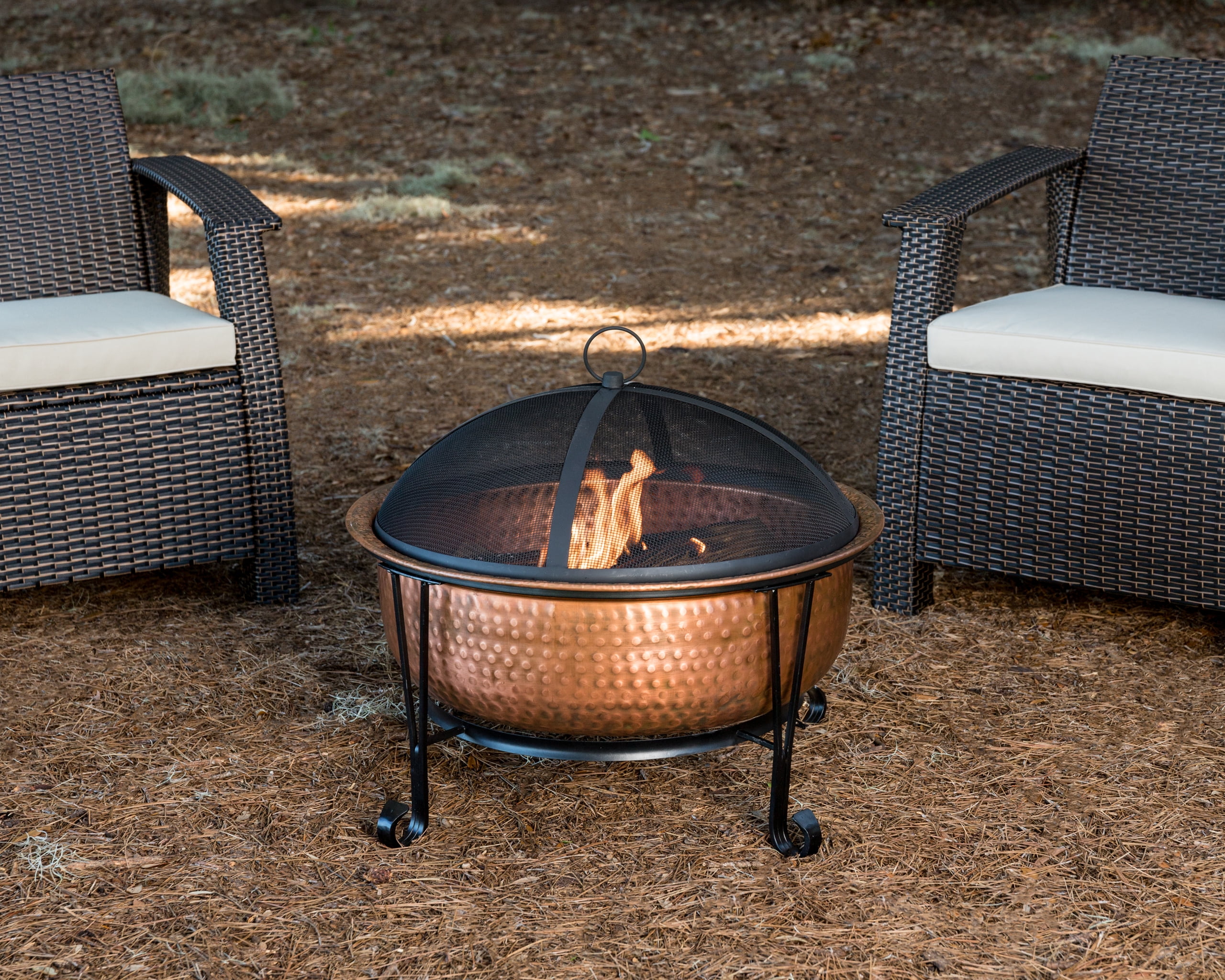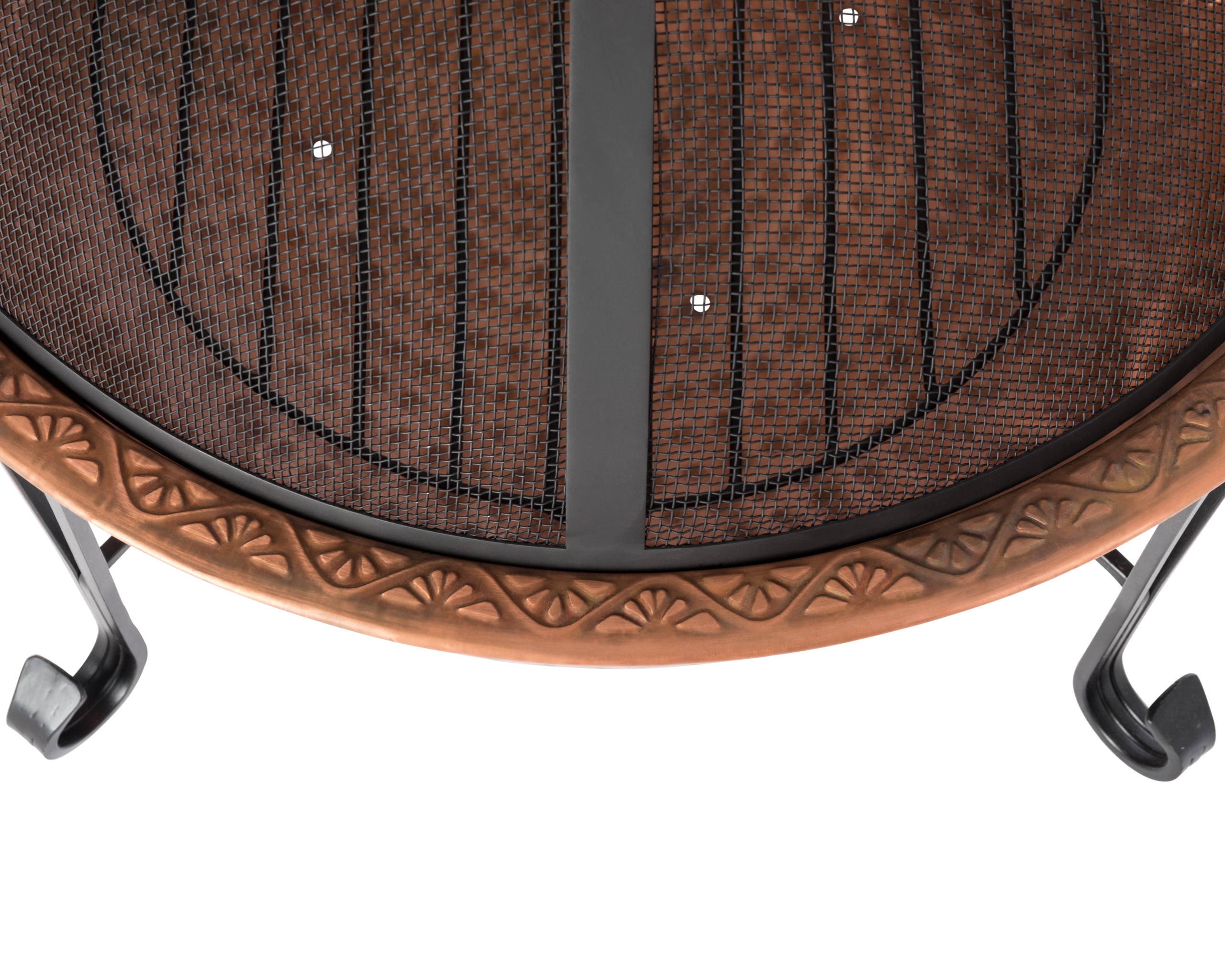 Genuine copper fire bowl Elegant support stand Mesh spark-screen with handle Separate, replaceable steel grate increases longevity of bowl Screen lift/fire tool included Vinyl weather cover included