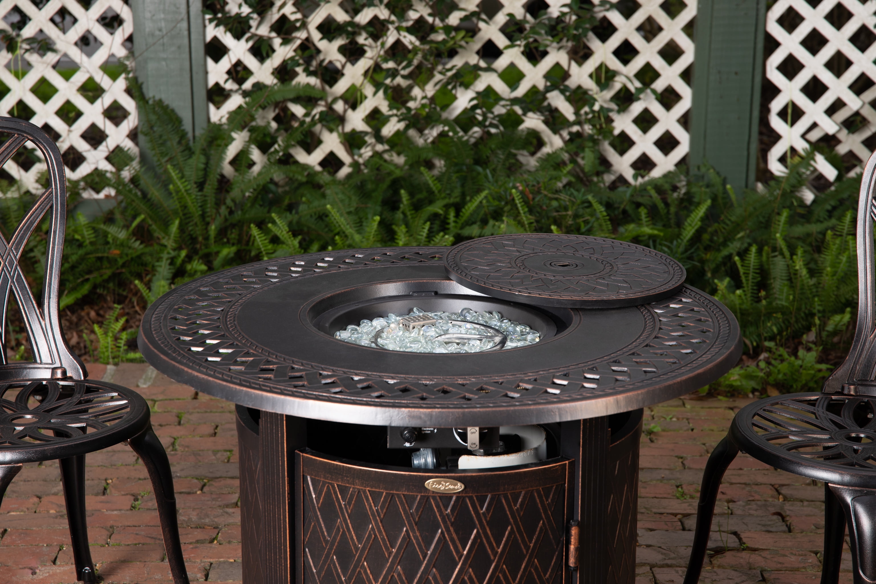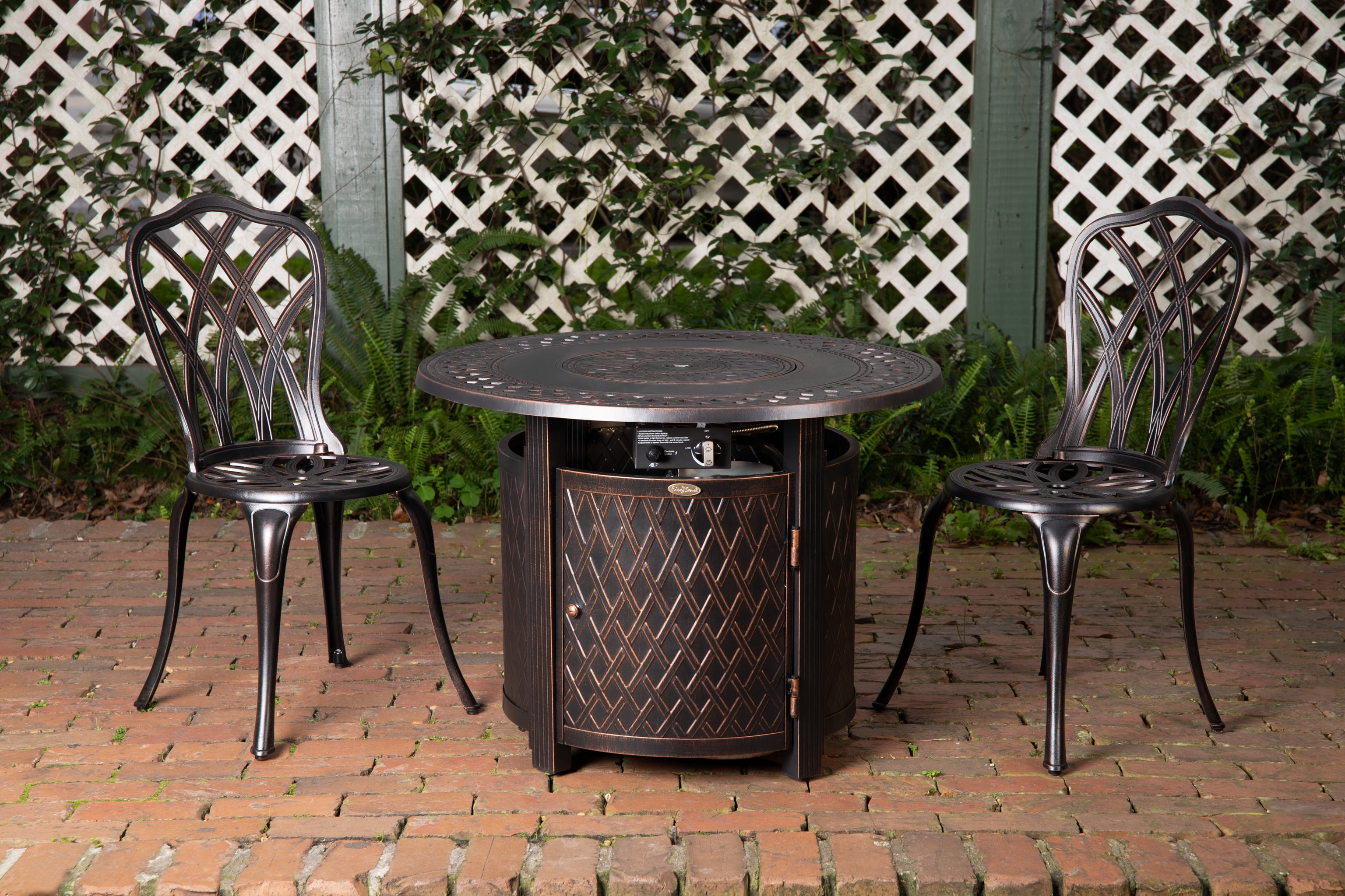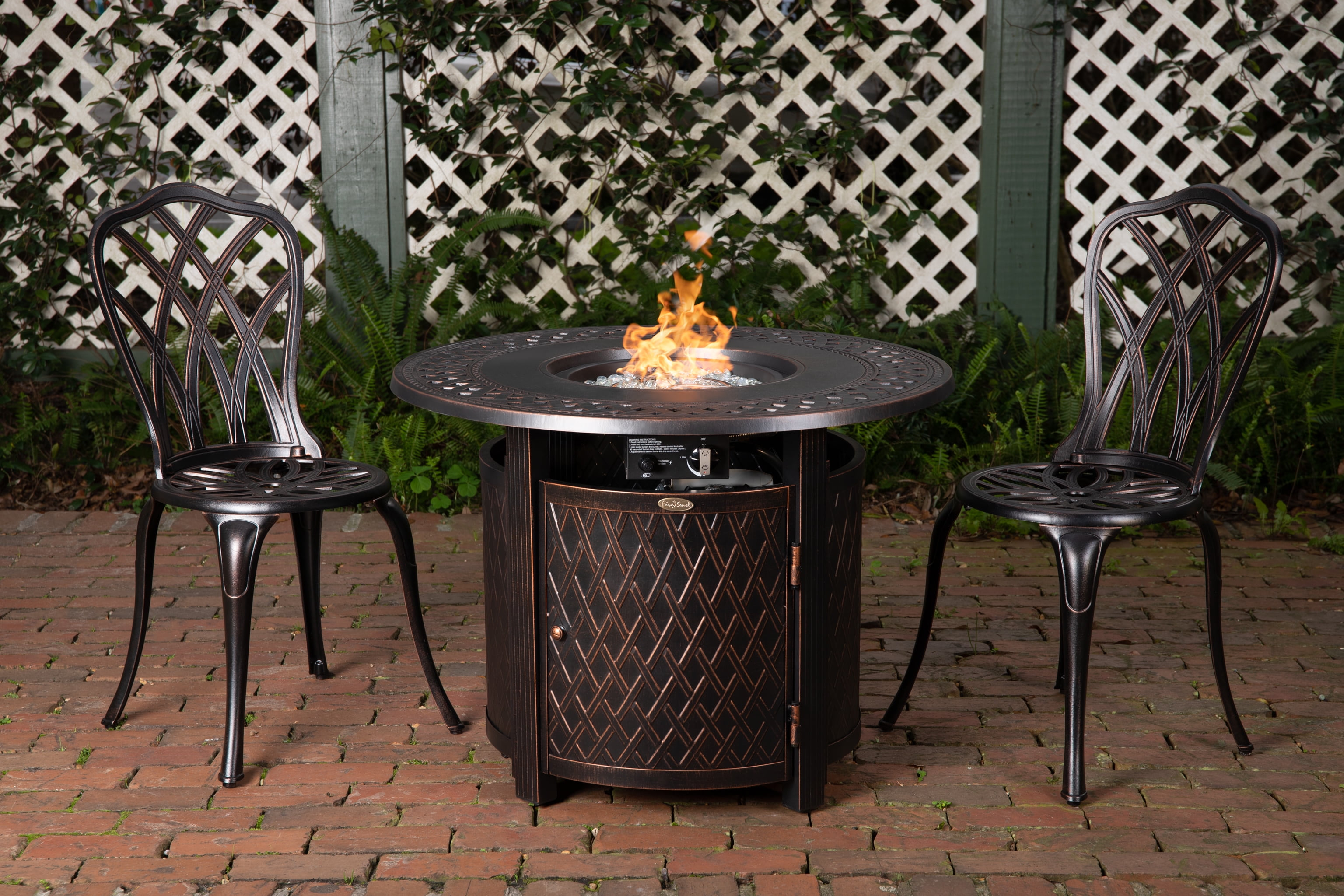 FIRE SENSE WAGNER ALUMINUM 34″ ROUND LPG FIRE PIT: The Wagner Round Aluminum Gas Fire Pit shows off a lattice-weave pattern and mocha finish compatible with classic and contemporary outdoor décor. With a practical aluminum build and an adjustable full-flame output of 37,000 BTU, this versatile and compact fire pit pulls double duty as a patio table when covered with the included fire bowl lid. PATIO CONVERTIBLE GAS FIRE PIT TABLE: Arriving with clear fire glass for a sparkling accent, just add a standard 20lb propane tank behind the handy hinged door. A weather-resistant cover for the fire pit is included for your convenience. FEATURES: 37,000 BTU output | Aluminum construction | Antique bronze finish | Stainless steel burner | Beautiful full flame | Clear fire glass included | Fire pit cover included | Convenient aluminum fire bowl lid | Uses standard 20lb LPG BBQ tank – NOT included. ASSEMBLED DIMENSIONS: 34″Dia. x 25.3″H, Weight; 47 lbs. Stated dimensions may be rounded by up to 1 inch. This outdoor heater is perfect for your porch or any other outdoor venue. The aluminum gas fire pit is very lightweight and easy to move around. IDEAL FOR OUTDOOR SPACES: This fire pit is the perfect addition to any outdoor environment. Not only can you have a small campfire in your own backyard and roast marshmallows, but also enjoy time outside during the winter.