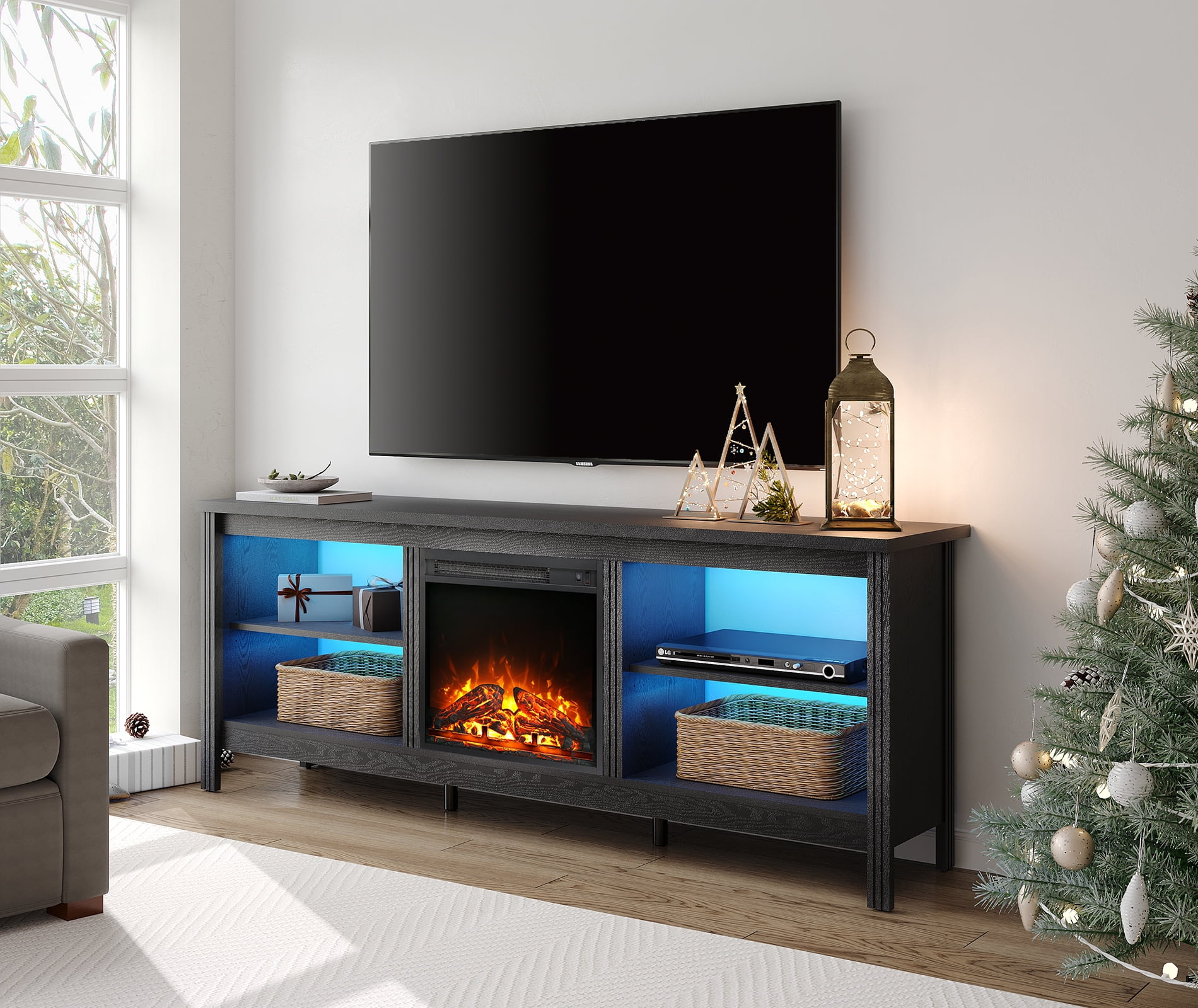 【Elegant Fireplace TV Stand】Comes with a warm white LED light strip, creating amazing lighting effect and warm atmosphere.Featuring custom stone pattern tabletop and handmade fluted wood door, it will be an eye-catching piece of furniture in the room. 【Suitable for 75 inch TV】The led tv stand is made of premium-quality particle board material and extra thickened legs makes it more stable and sturdy. Last for years of use. The TV console can hold a flat screen TV up to 75-80 inch. 【Electric Fireplace Insert】The white fireplace TV stand with 18” electric fireplace can be used WITH or WITHOUT heat. You can put the fire place to bring warmth to the cold winter. 【Premium Material】Crafted of selected P2 MDF material without any smell and no harm to human body, the fireplace entertainment center offer a long service life.Dimension: 70”×15.6”×23.2”(L×W×H). 【Easy Assembly & 2 Packages】The television stands and fireplace insert are shipped separately, so you may receive 2 packages at different times.