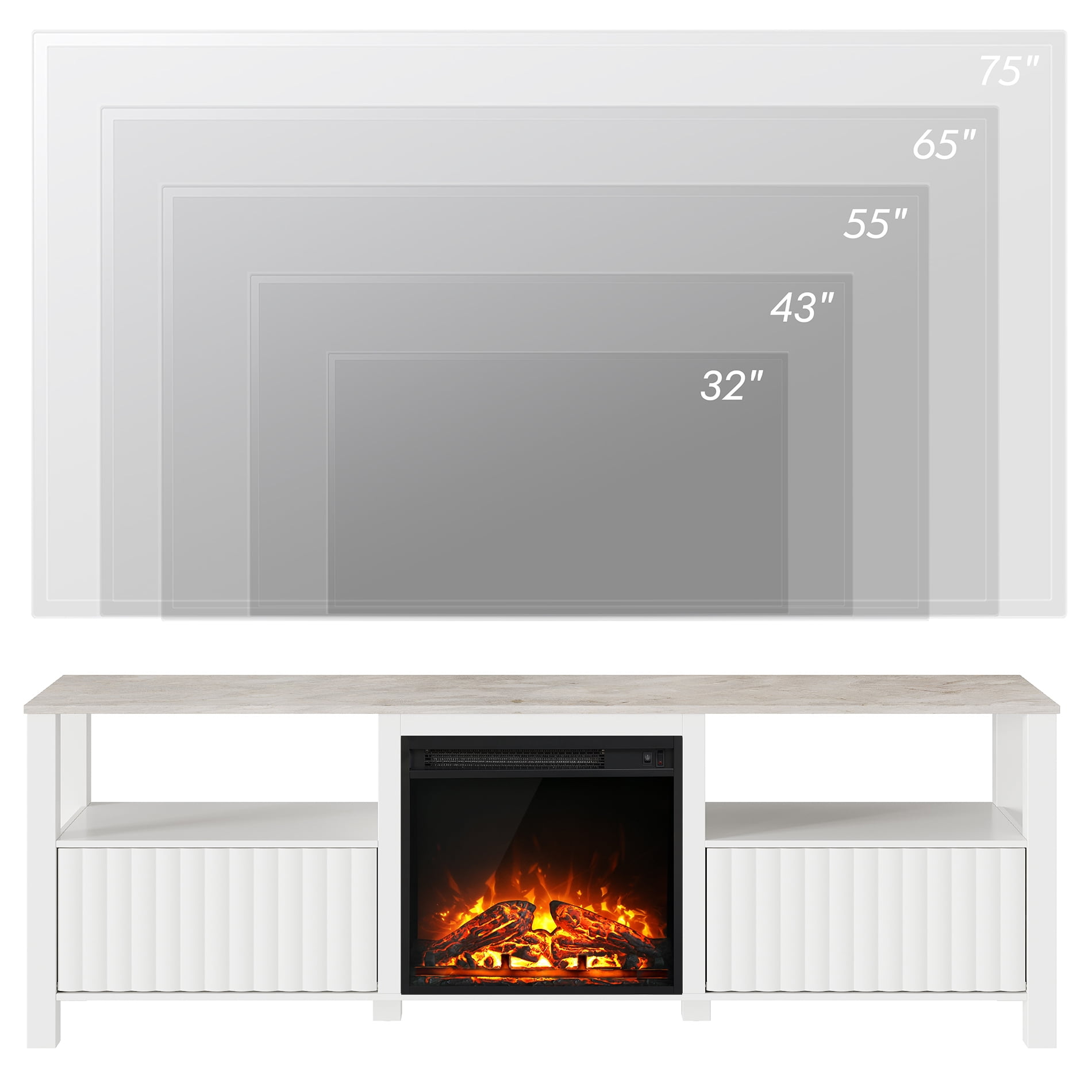 Fireplace TV Stand for 75 inch TV, White Entertainment Center with Storage Cabinets for Living Room, Bedroom